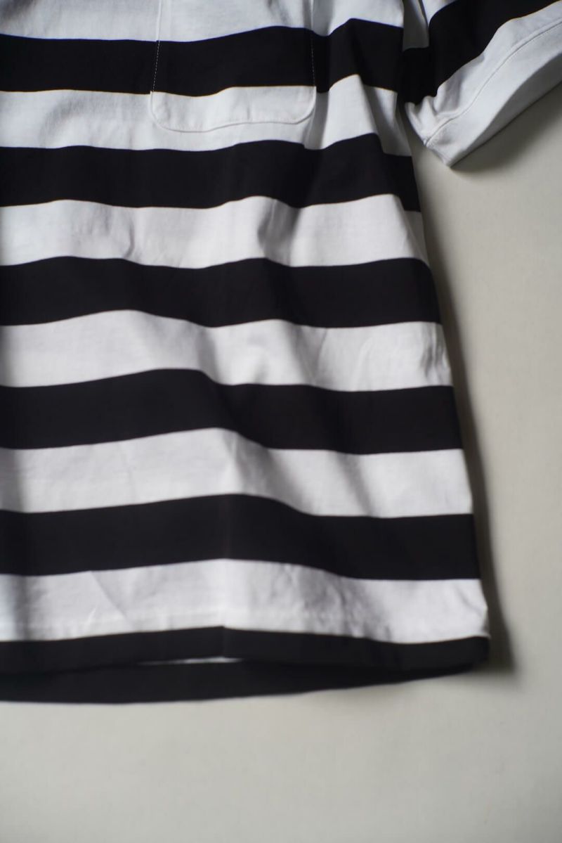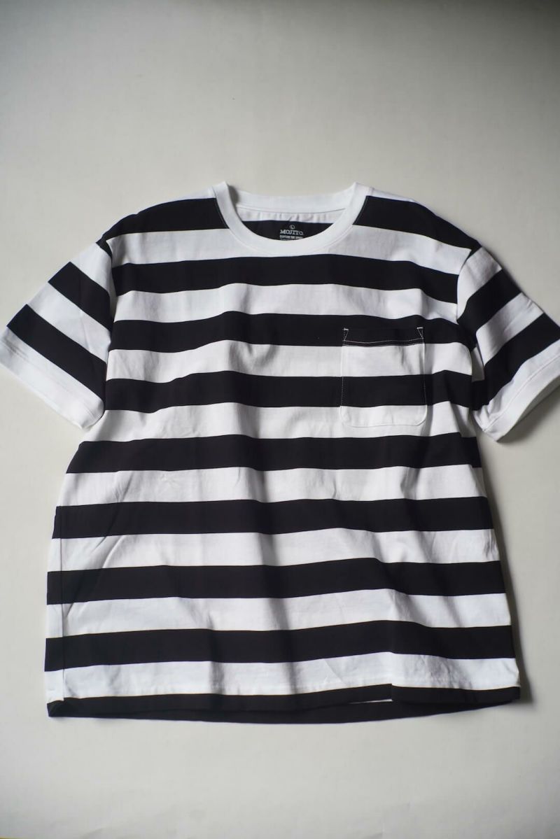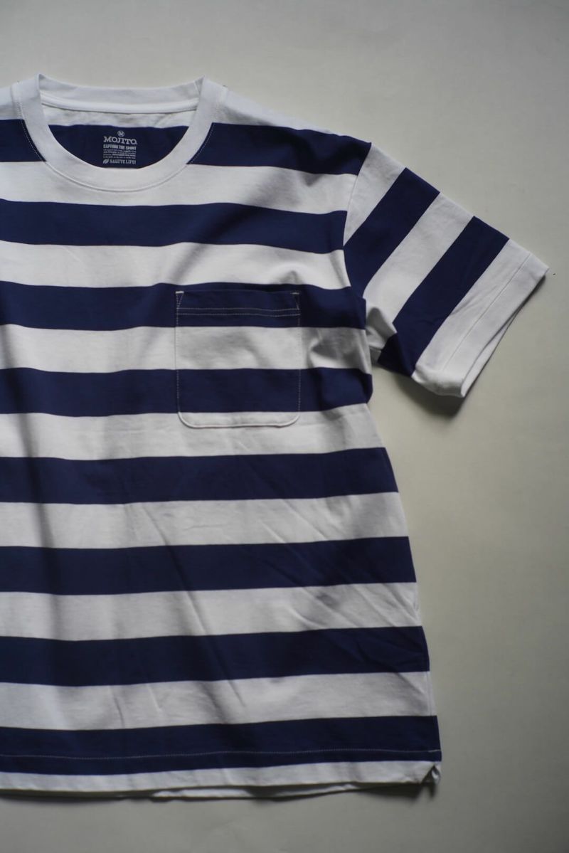ワイドピッチのボーダーポケットTシャツ。程よく厚みのある天竺生地はインナーとしても1枚でも活躍します。 100% COTTON MOJITO / SANTIAGO "B" STRIPE T Price ¥19,800(税込)