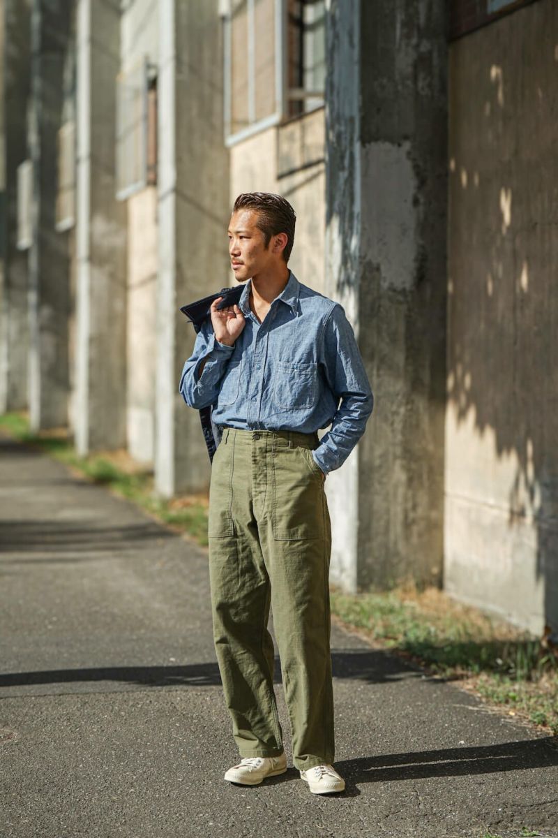 米綿が使用されたヴィンテージさながらの風合いの生地を、縫製糸、ボタンと共にアメリカへと持ち込み、アメリカ軍にユニフォームを納入している縫製工場へと製作を依頼。