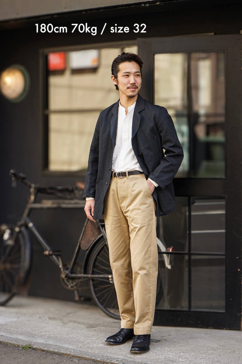 フォルムは60年代前半の緩やかなテーパードシルエットをベースに、40年代に見られる両玉縁ポケットや尿素ボタンの仕様をミックス。 異なる年代の要素を掛け合わせることで、時代を超えて穿ける普遍的なバランスを目指しました。
