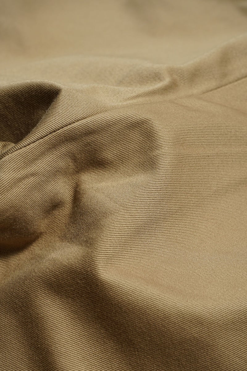 先染めした糸をウエポンクロスへと織り上げ、さらに生地染めを重ねることで、当時のウエポンにはない、深みのある濃色カーキベージュを表現しました。 奥行きと色気を感じさせる色合いです。