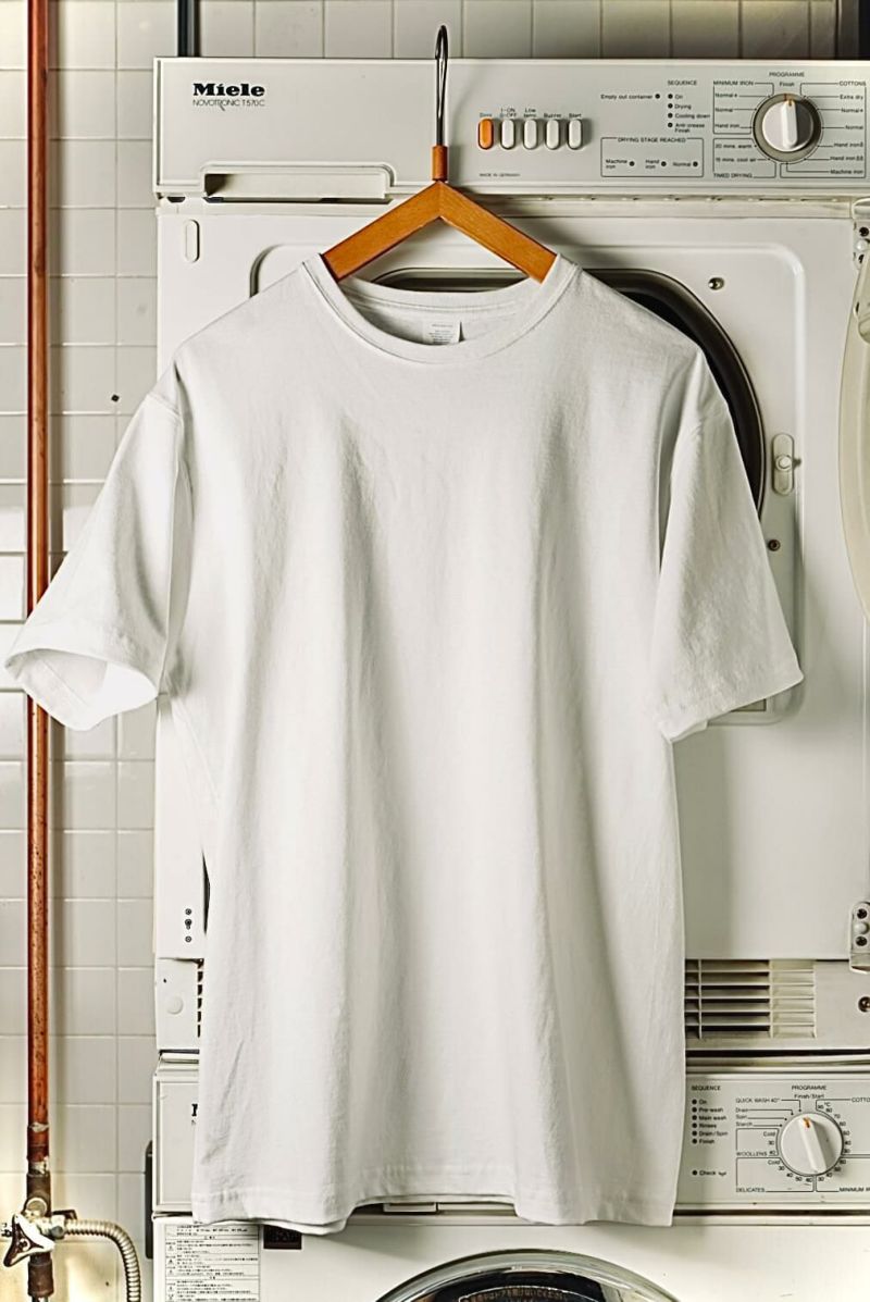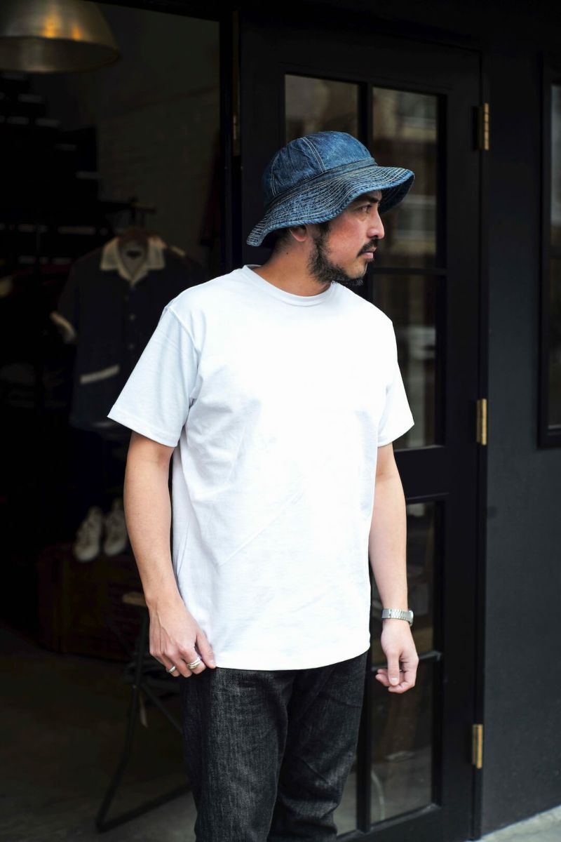 パターン、紙タグのネーム、生地、縫製、全てを「アメリカ製」で仕上げた究極の白Tシャツです。素材は、ノースカロライナ州の広大な土地で生産されたコットンを原料にアメリカで編み立てられた 12.6oz の天竺生地。タフで粗野感ある風合い豊かな生地は、糸の整理加工を省き、効率的でシンプルな物づくりを重視するアメリカ的な文化があって生まれた物です。糸をきれいに仕上げる技術に優れた日本ではお目にかかれない「アメリカらしさ」が強く表れた生地と言えます。