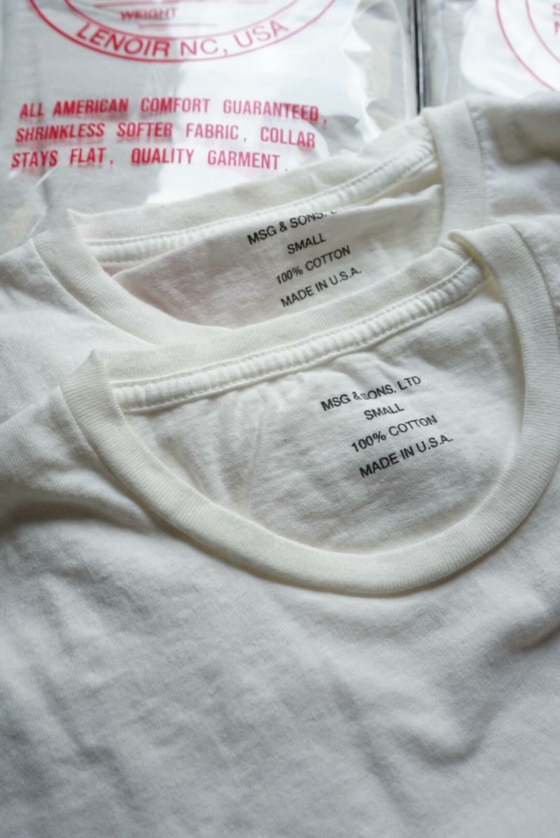 サイズスペックは何度もサンプル修正を繰り返し、日本人の体型に合うように細かく調整。仕上げにワンウォッシュを施しており、洗濯によって大きく縮む心配もありません。裾、袖の縫製は、ヴィンテージのTシャツに多く見られ、現在では希少となった天地引き(シングルステッチ)を採用。アメリカのカルチャーとも言えるパックTをMSG&SONSとしてアップデートして表現いたしました。