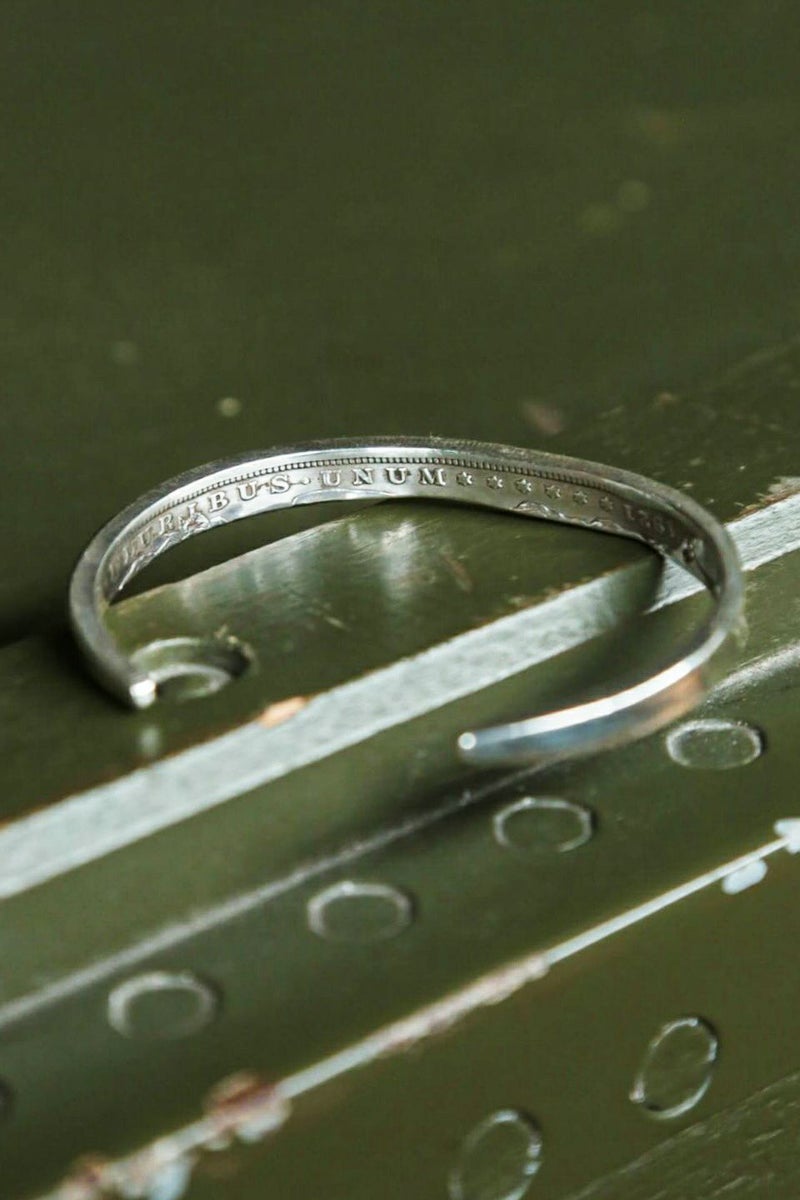 バングル長15cmを作り出すために、1枚のコインから溶かすことなく、特殊なカットを施すことでコインのディテールをできるだけ損なわずに製作。外側をポリッシュし、内側はコインの刻印を残して仕上げています。