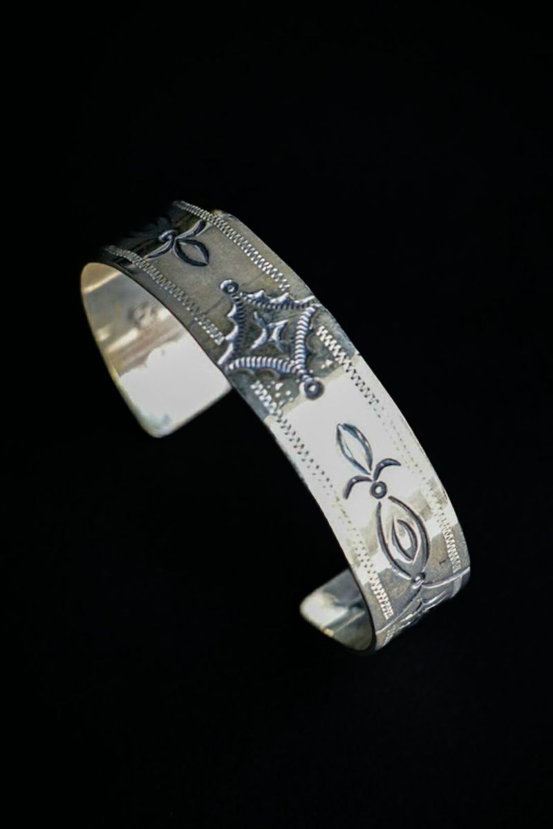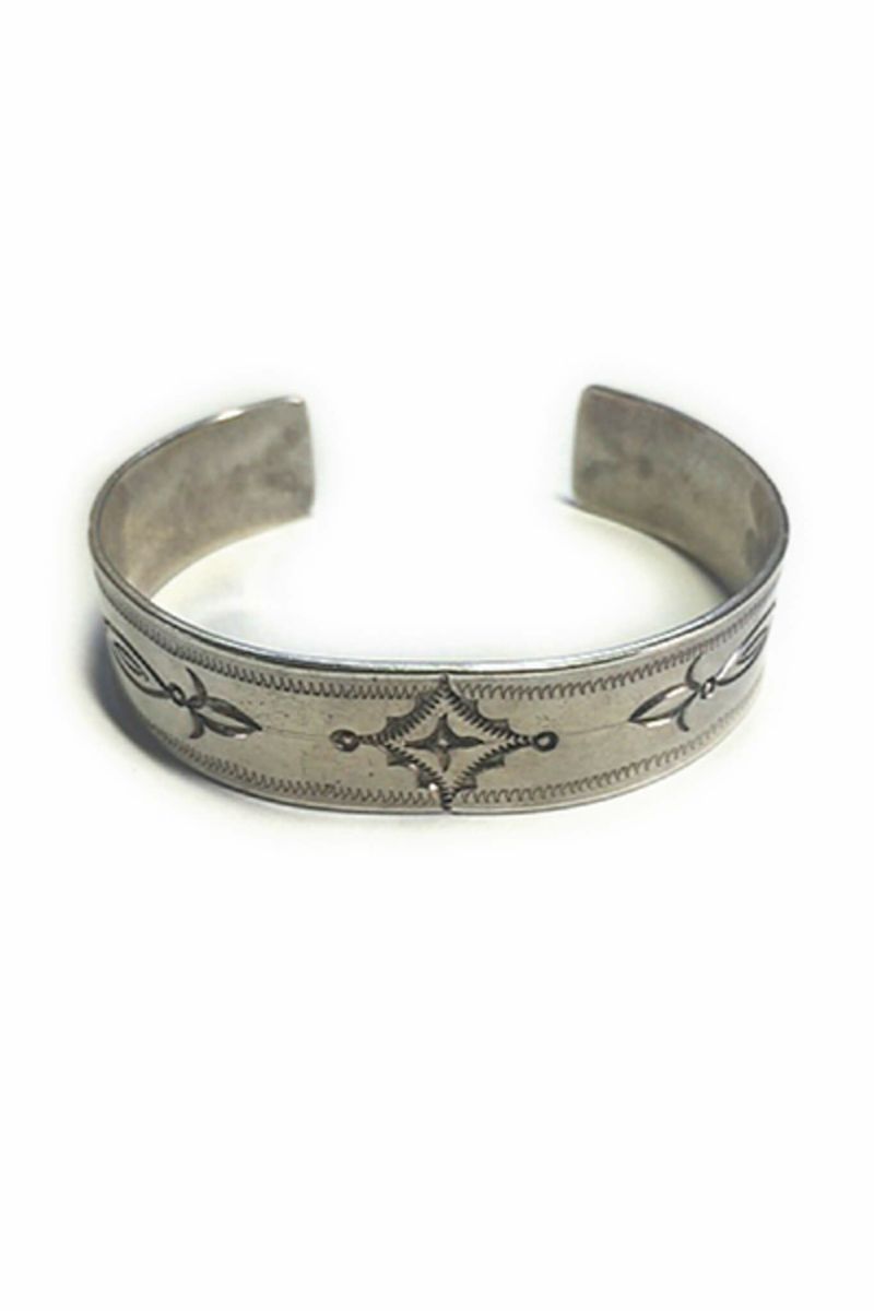 大航海時代にヨーロッパから交易品としてネイティブアメリカンに渡ったトレードシルバーやそれらに影響を受けたであろう平原部族が得意とするデザインにインスピレーションを得て独自の解釈で制作したバングル。
