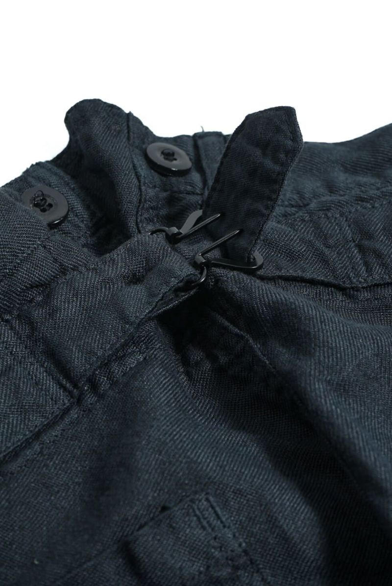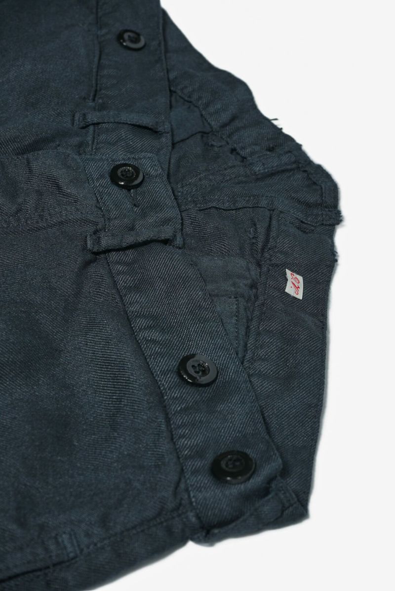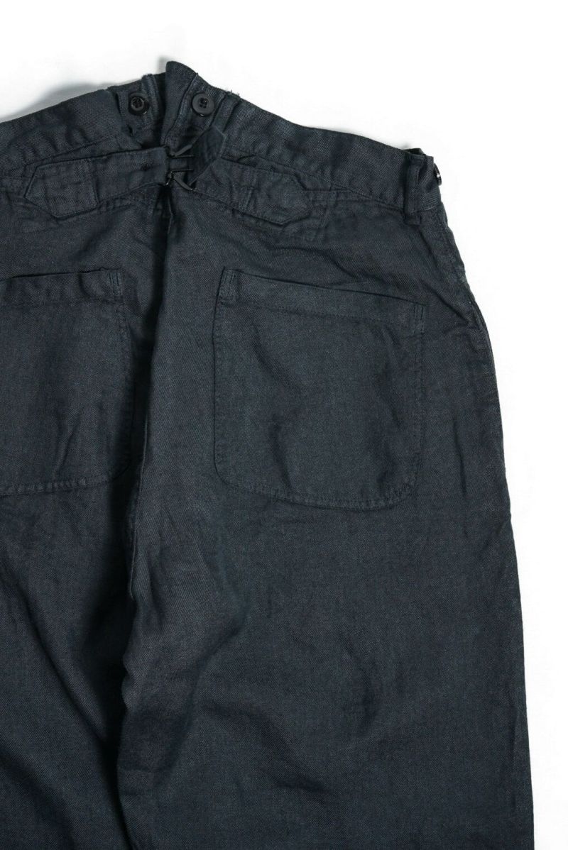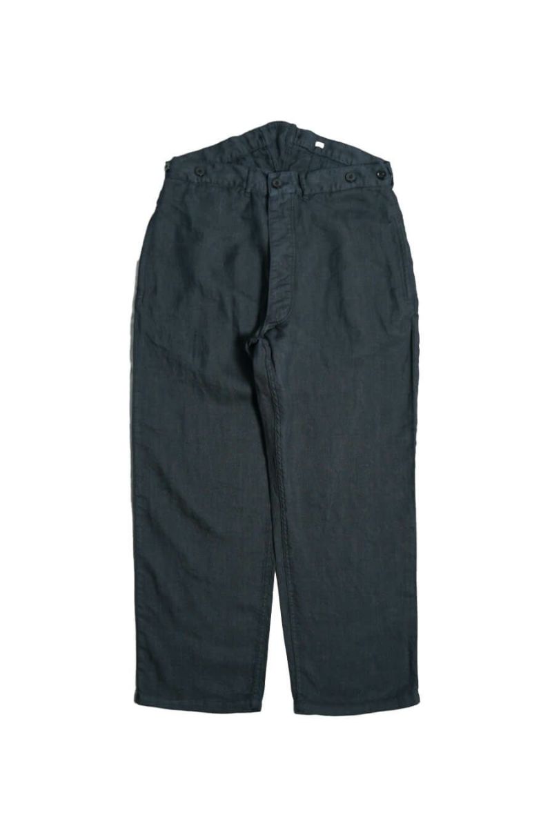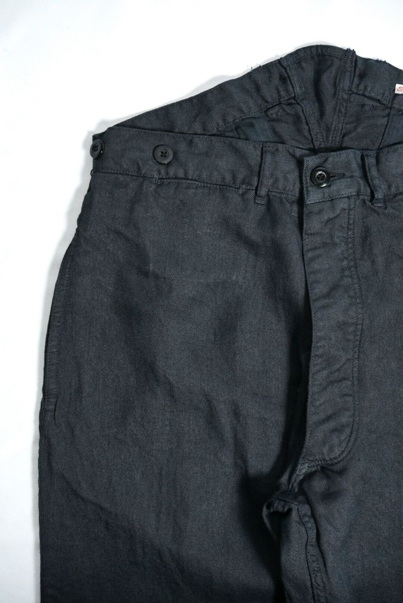 1900年代初頭にフランス軍に納品されていた作業用パンツを彷彿とさせる一本。素材にはオリジナルで織り上げられたラミーツイルを使用しています。清涼感と上品な光沢感が魅力。