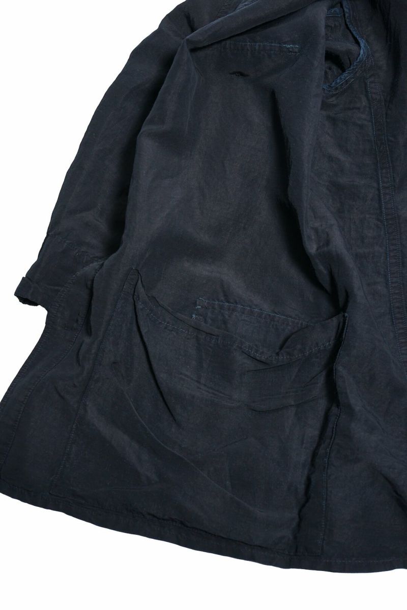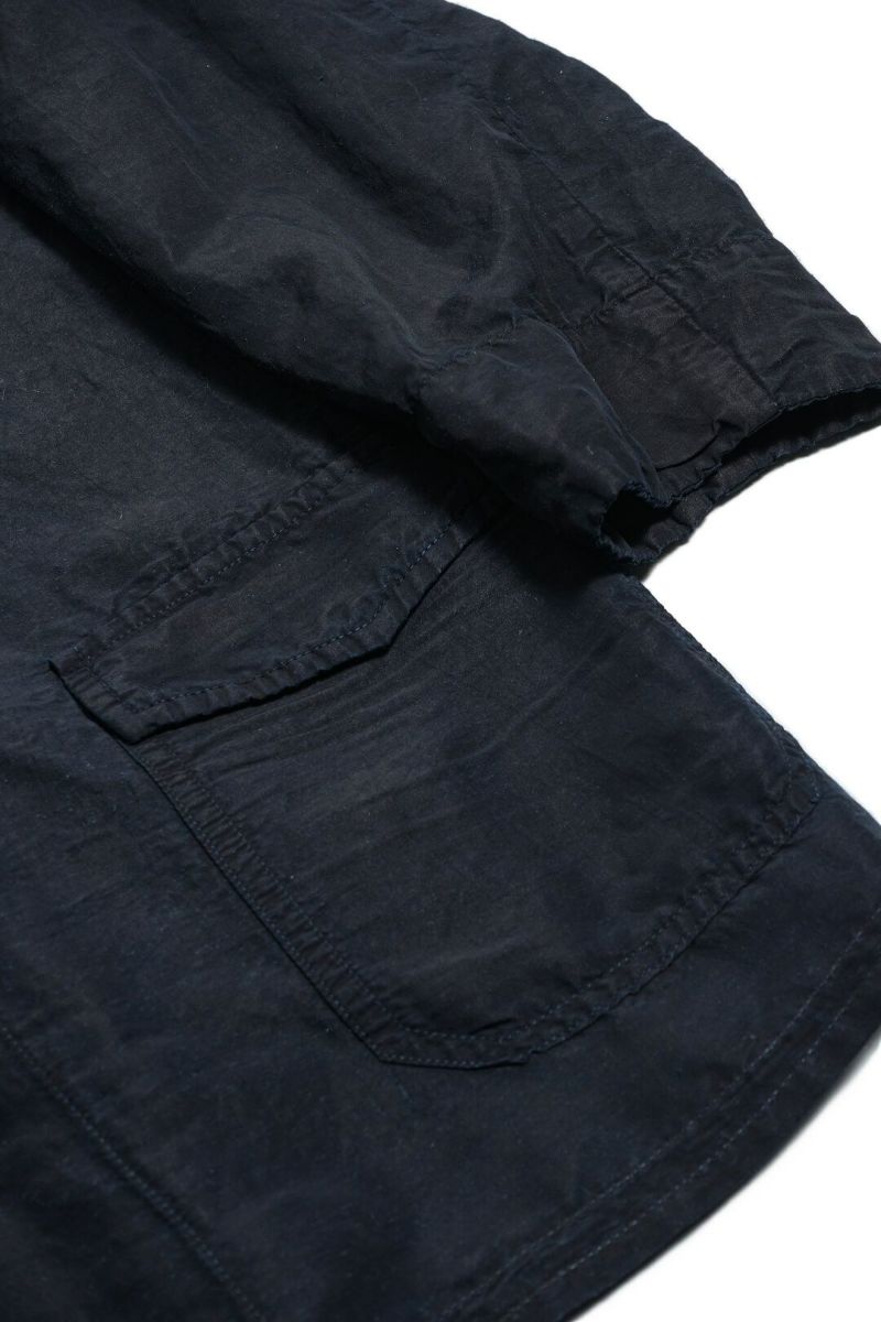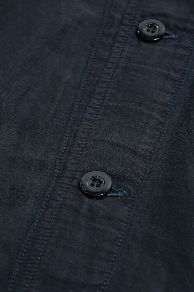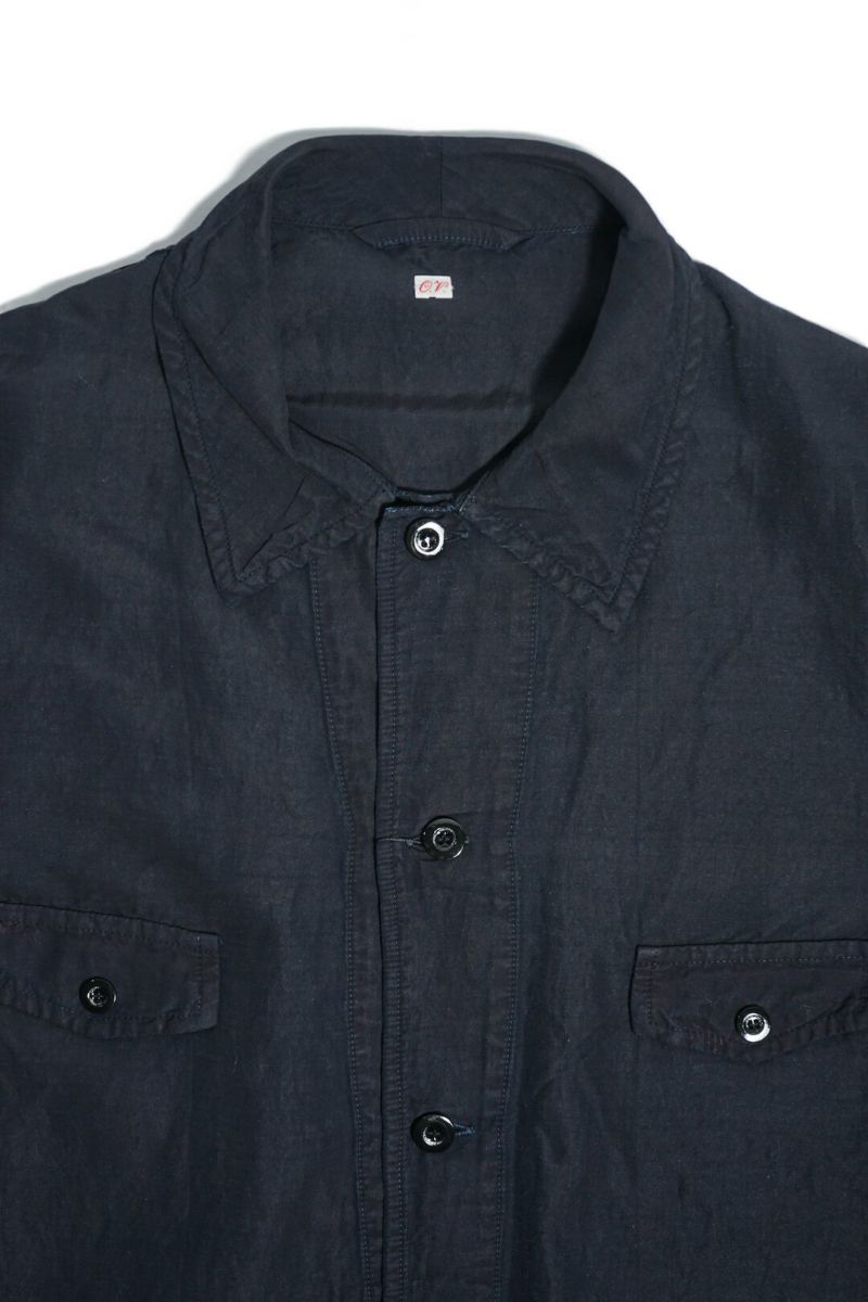 1940年代、ドイツ軍のシャツジャケットをベースにデザインされた一着です。素材はラミー×レーヨンの艶感ある生地を使用し、深みあるブラックインディゴカラーへと染色。