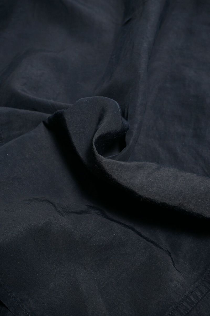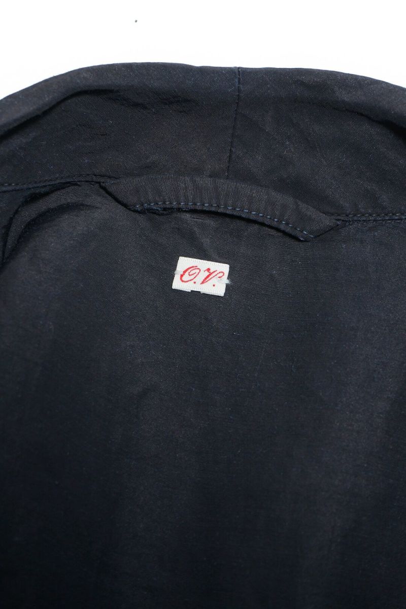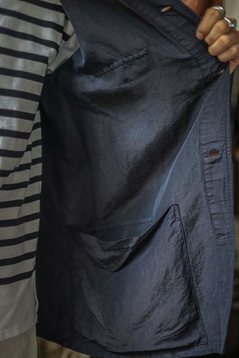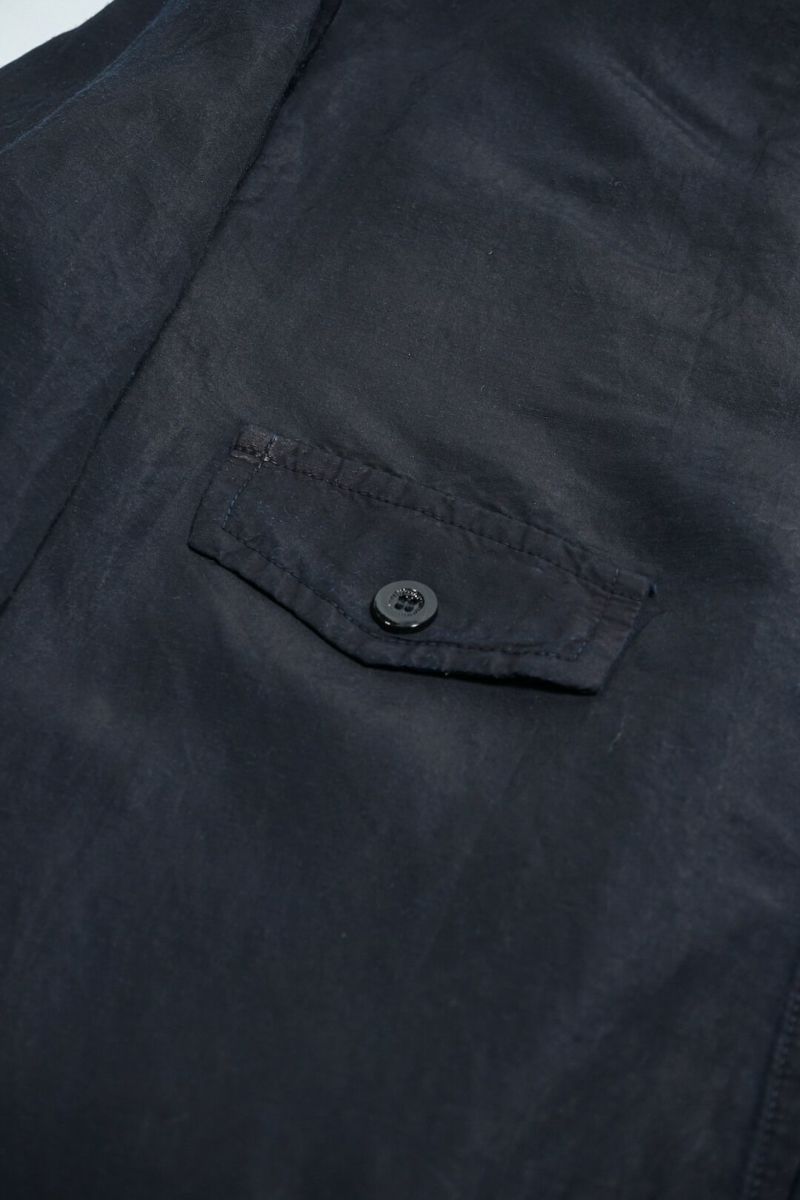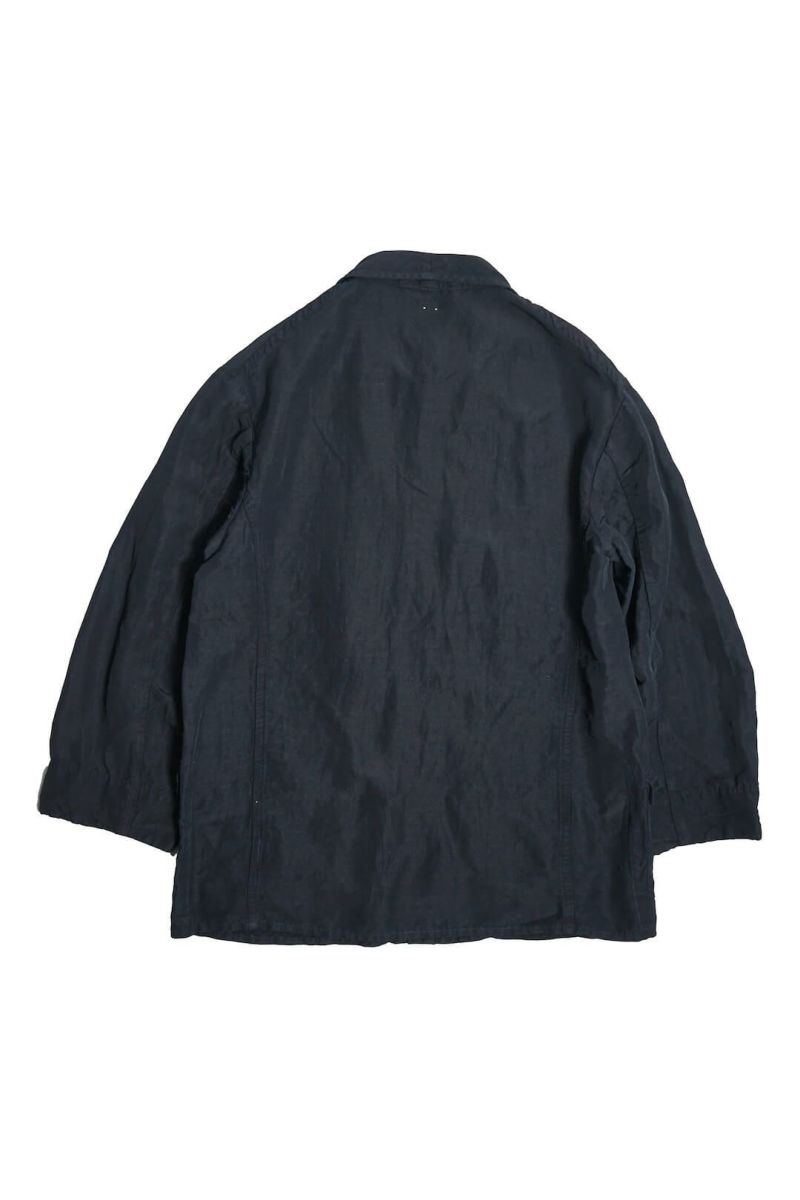 1940年代、ドイツ軍のシャツジャケットをベースにデザインされた一着です。素材はラミー×レーヨンの艶感ある生地を使用し、深みあるブラックインディゴカラーへと染色。