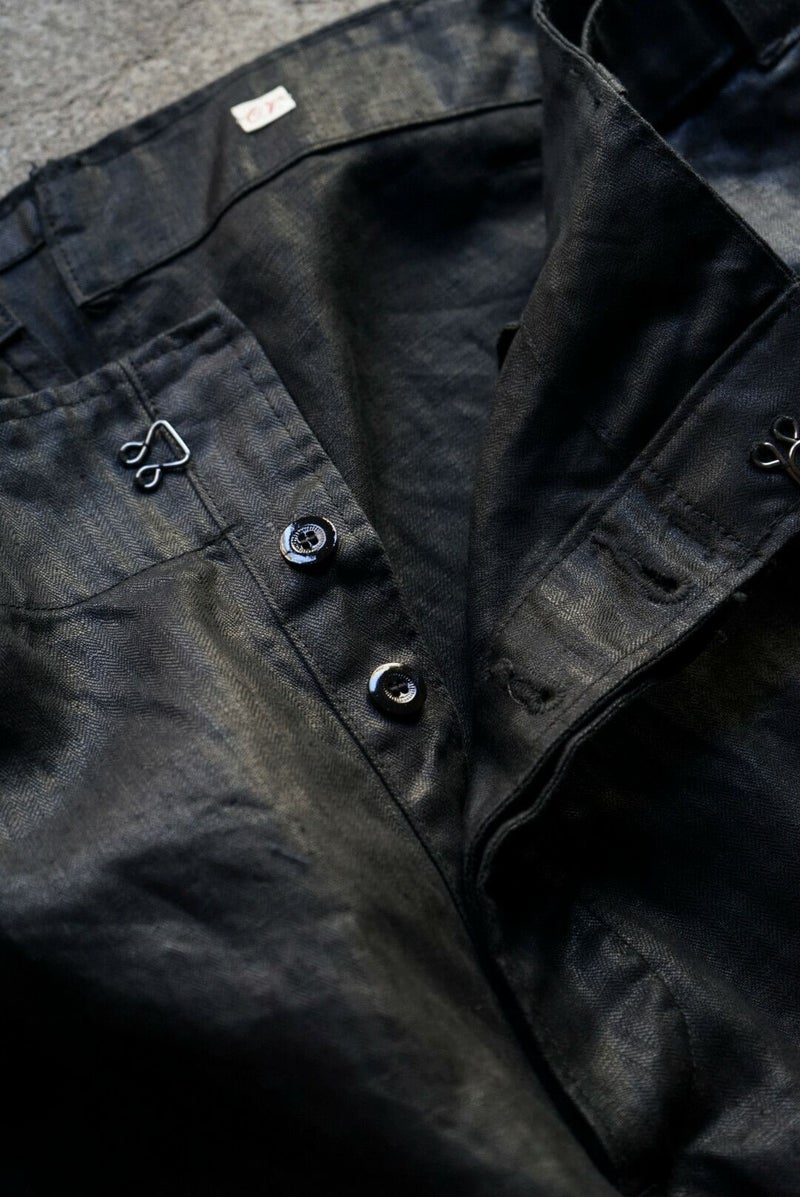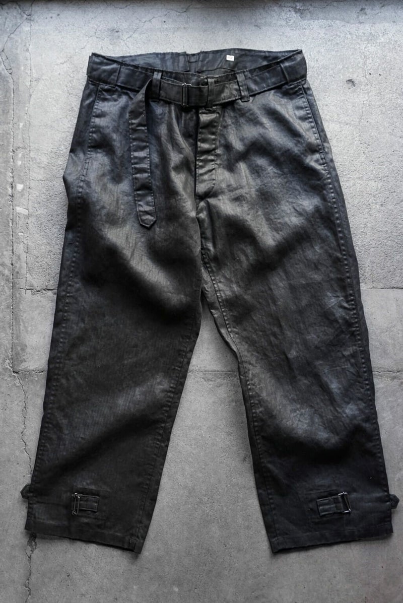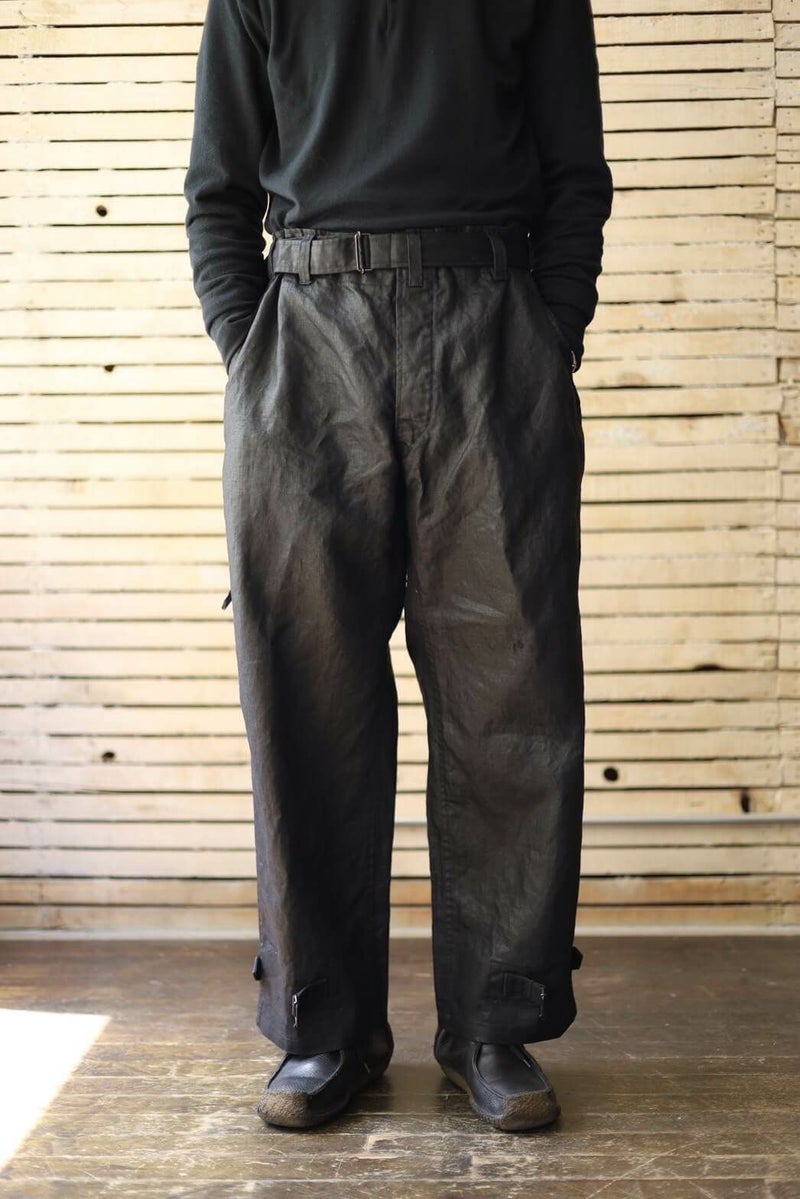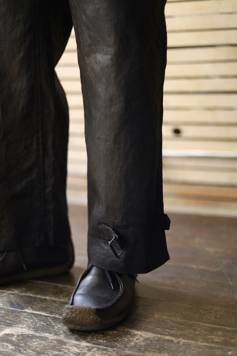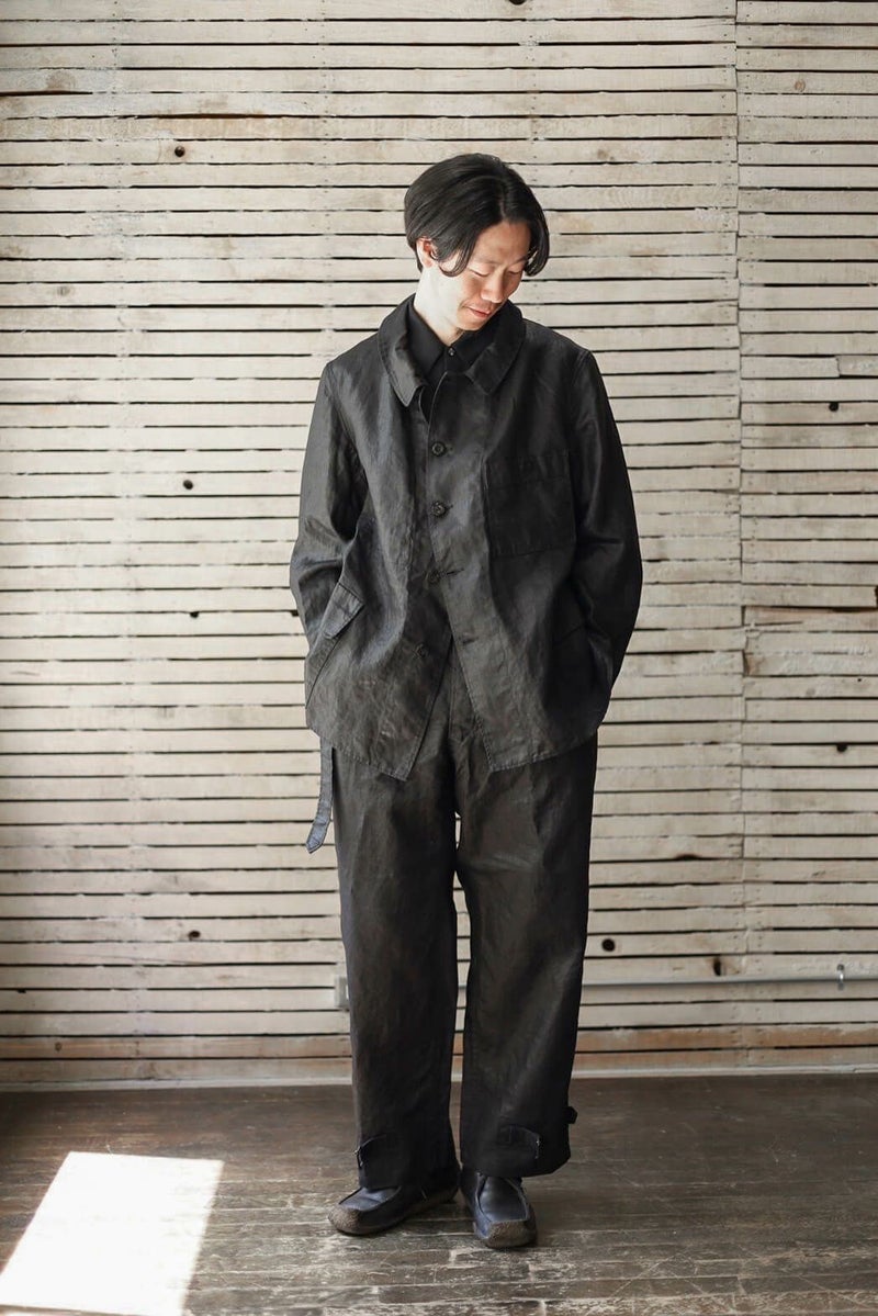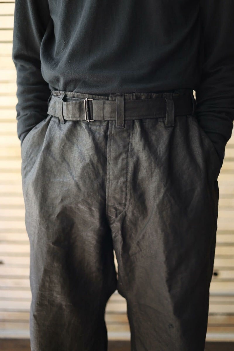1930年代にフランス軍に納品されていた作業用パンツを元に制作された一本。 ウエストと裾にベルトが付属しており、大き目に設計されたウエストは絞って履くことを想定して作られています。 素材には、VESTE MALCASに使われている肉厚なリネン生地であるブラックリネンを。 しっかりと肉感があり耐久性も期待出来る素材です。 ジャケットとセットアップで着用しても相性抜群です。 LINEN 100% OUTIL PANTALON CHASSIGNOLLES PRICE ¥49,500(税込)