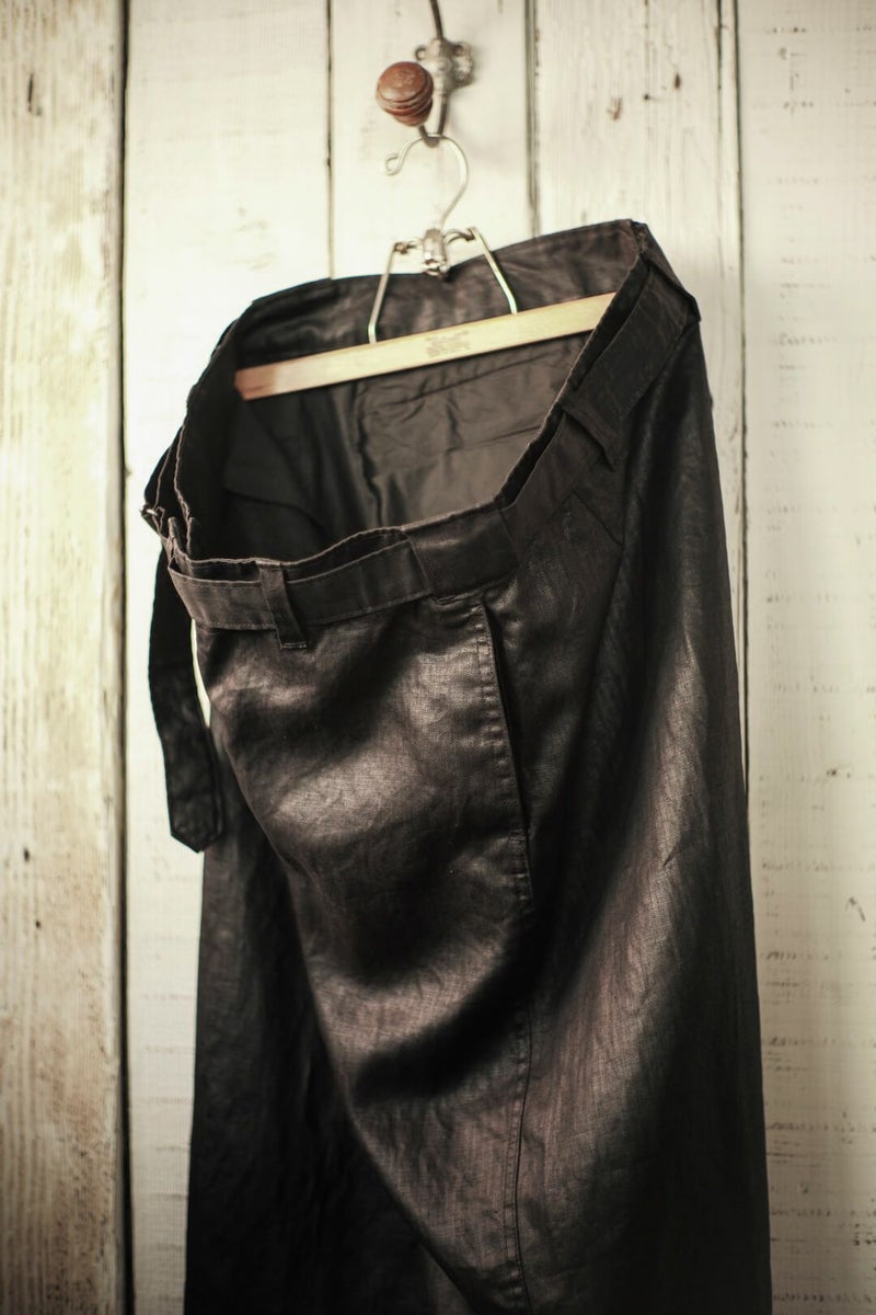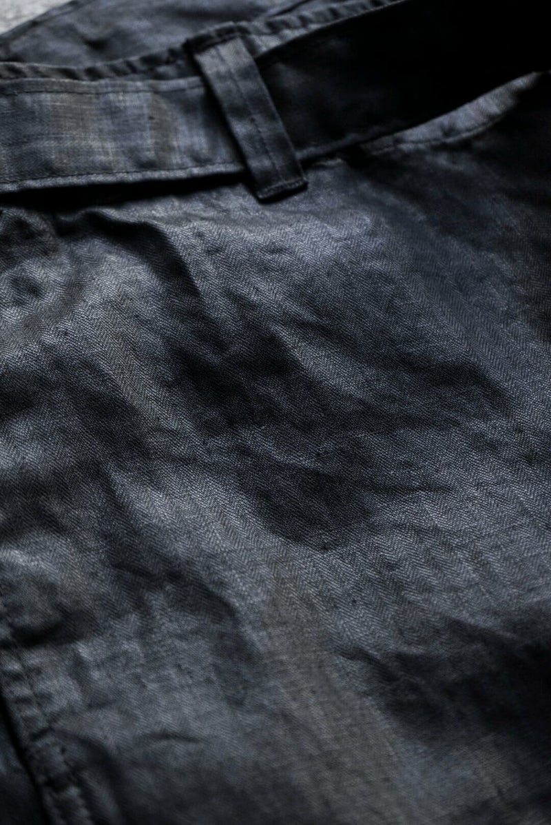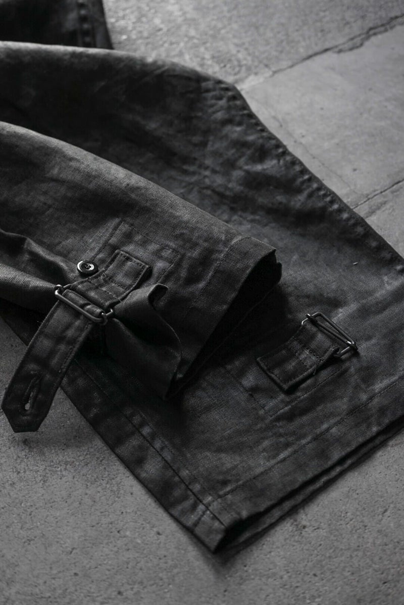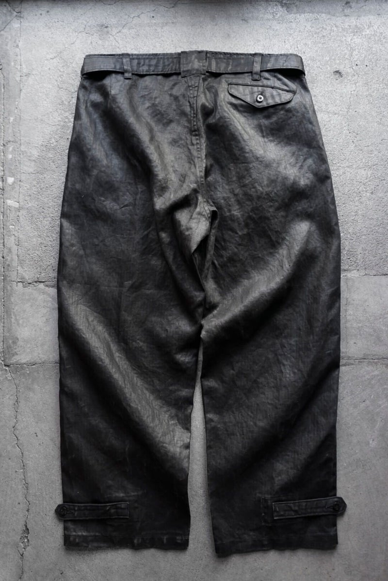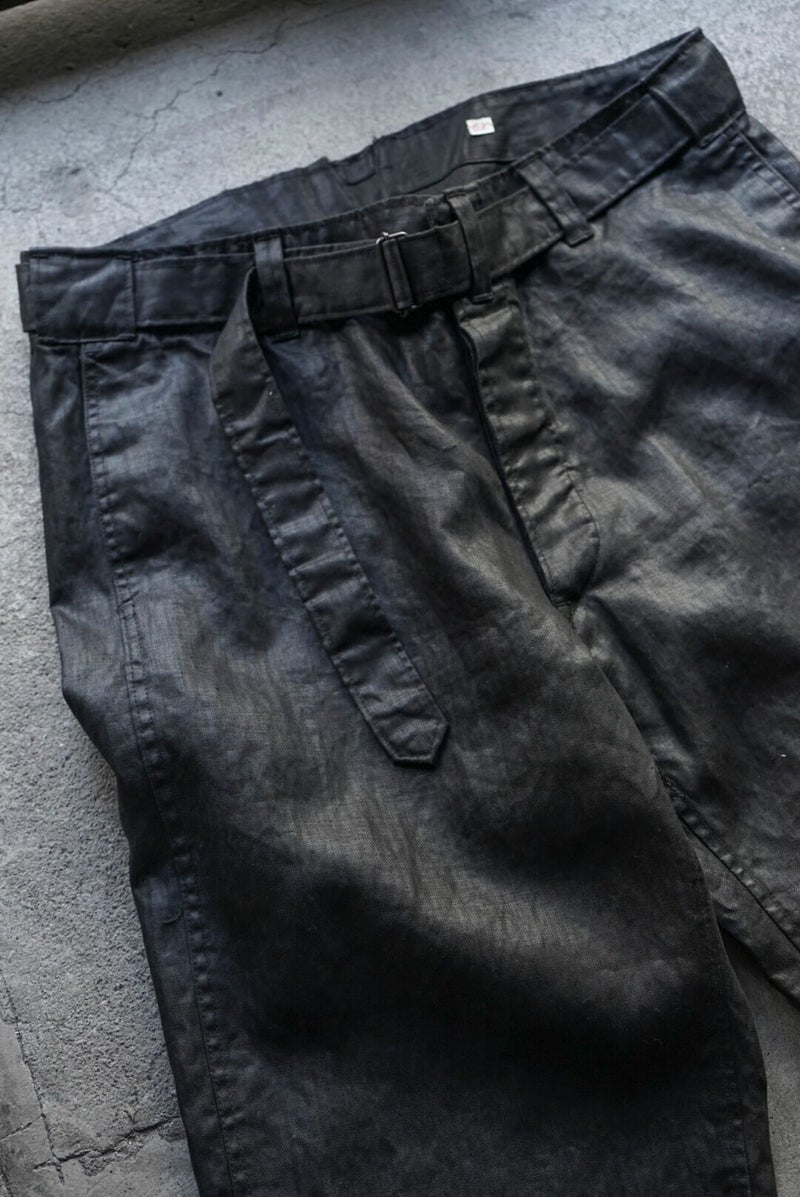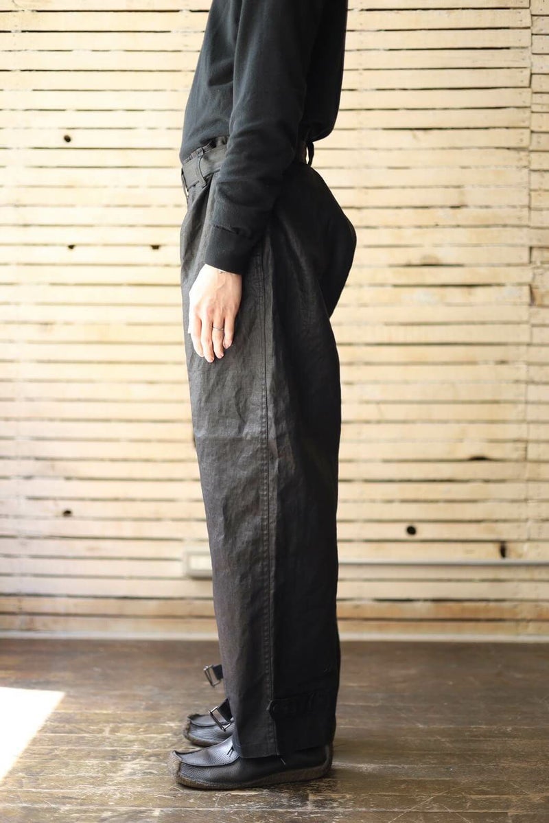 1930年代にフランス軍に納品されていた作業用パンツを元に制作された一本。 ウエストと裾にベルトが付属しており、大き目に設計されたウエストは絞って履くことを想定して作られています。 素材には、VESTE MALCASに使われている肉厚なリネン生地であるブラックリネンを。 しっかりと肉感があり耐久性も期待出来る素材です。 ジャケットとセットアップで着用しても相性抜群です。 LINEN 100% OUTIL PANTALON CHASSIGNOLLES PRICE ¥49,500(税込)