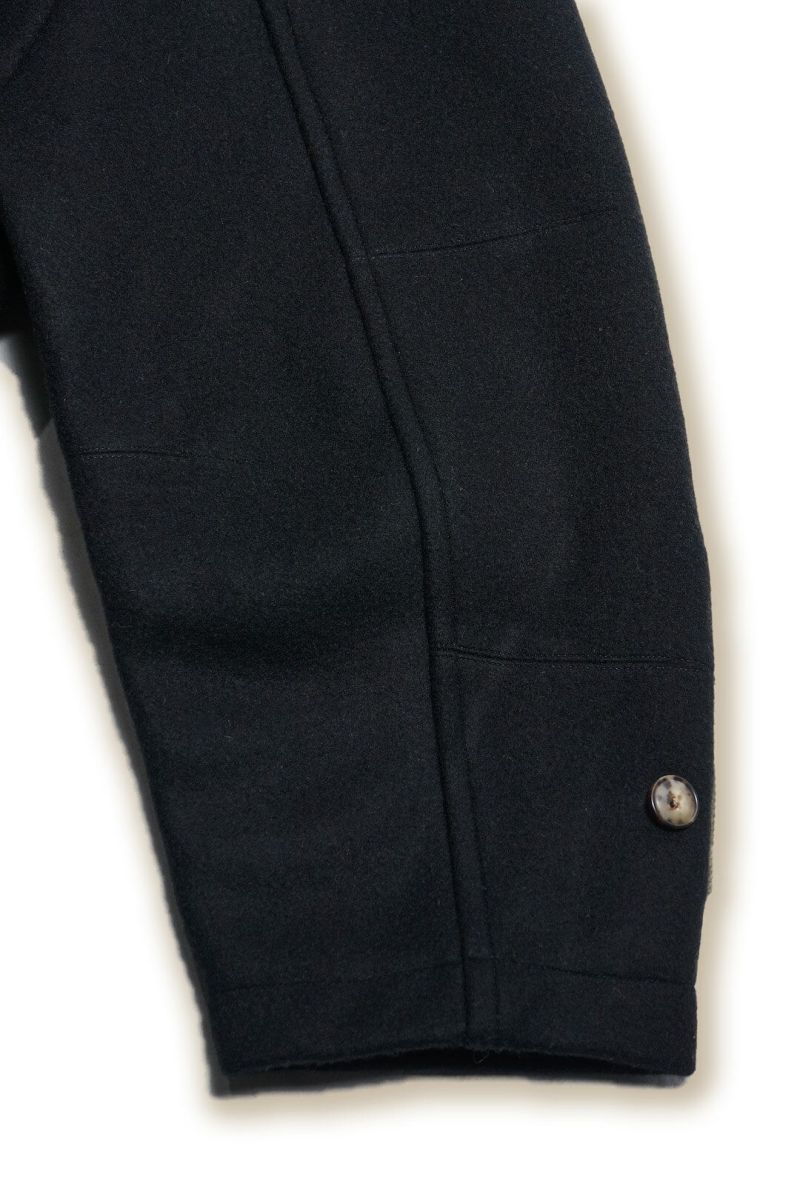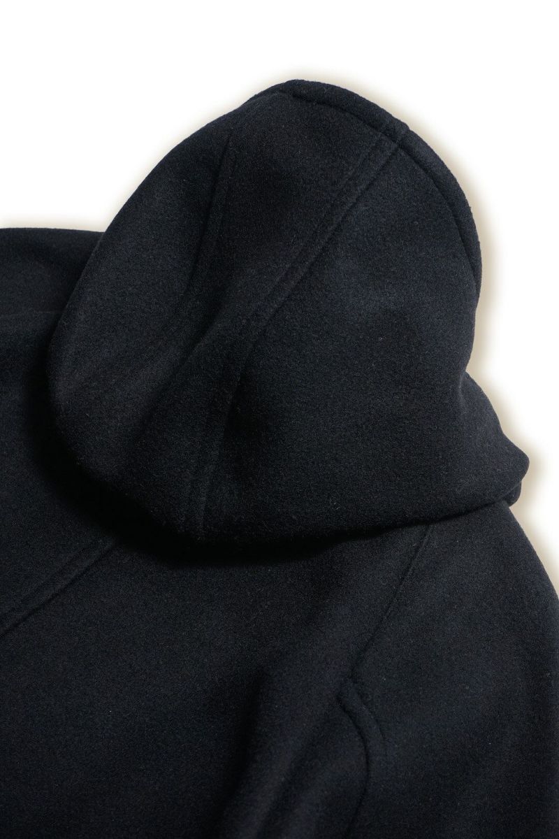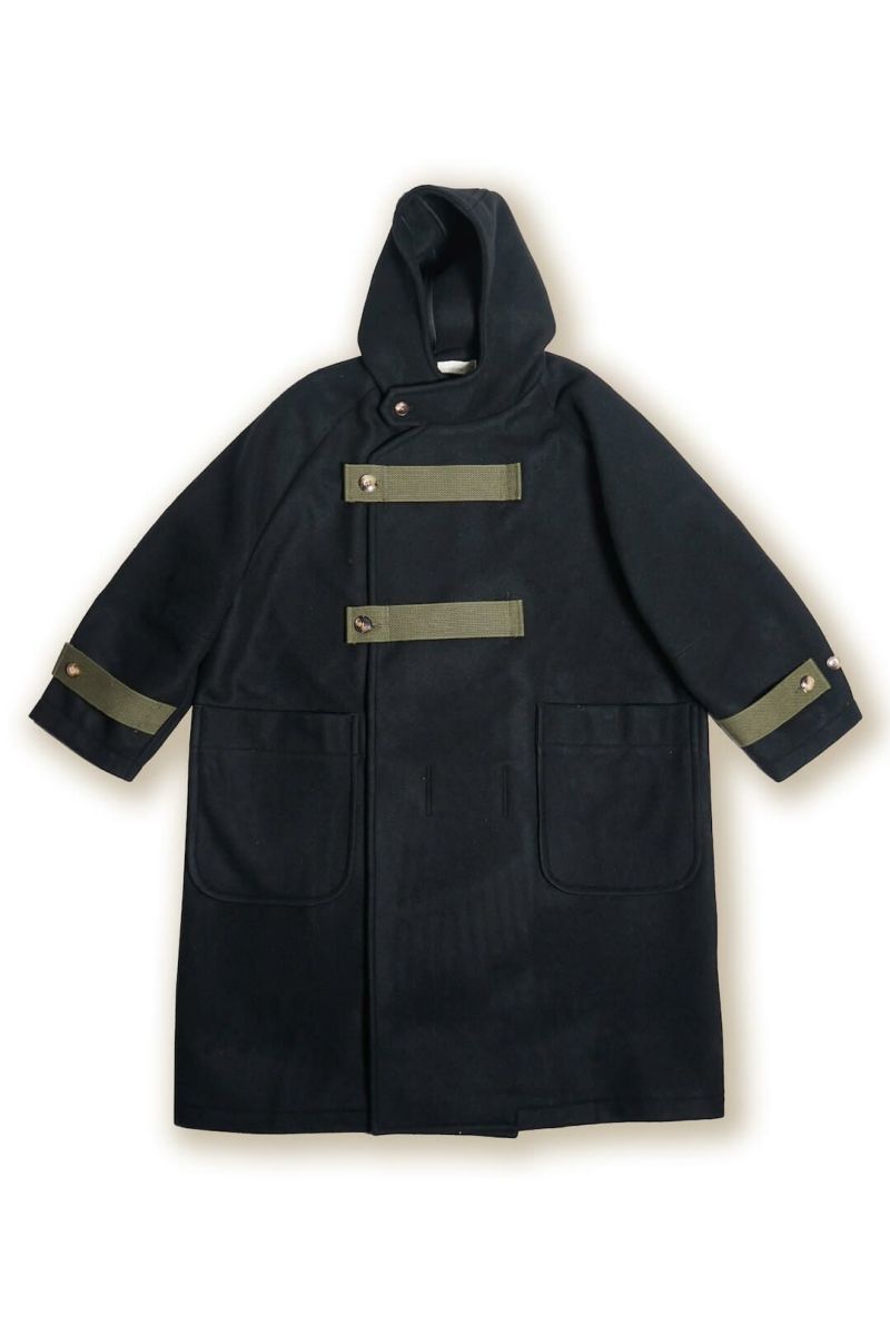 ダッフルコートをベースにrdv o globeの解釈でデザインされた1着です。素材には、ウール、ナイロンを使用した後染め二重織メルトンを使用。ラグランスリーブ、フラップ付きのフードデザイン、見返しのポケットなど機能面も考慮し、現代的に仕上げられています。前身頃、袖口には貴重なUS ARMYのデットストックテープを使用。全体的にボリュームを持たせシルエットが特徴です。