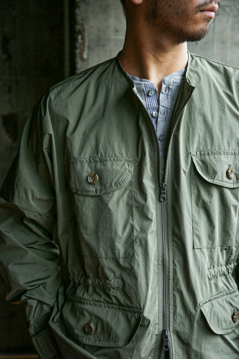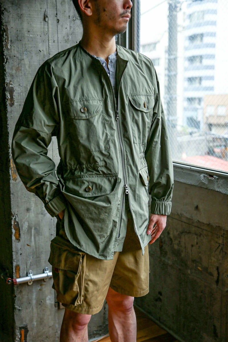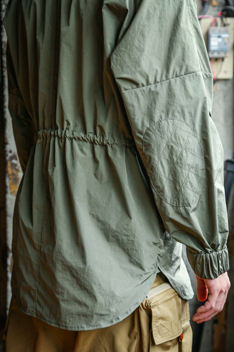 rdv o globe(ランデヴー オー グローブ) 素材にはポリエステル・ナイロンを複合したマイクロファイバーを高密度に織り上げ、超高収縮加工を施したことによって生まれる、程よいヌメリ感ときめ細かな風合いが特徴です。すっきりとした襟元のデザインにミリタリーライクなポケットやエルボーパッチの機能的なデザインが特徴です。ウエストの内側のドローコードでシルエットが調整可能となります。 <素材> NYLON 57% / POLYESTER 43% <生産国> MADE IN JAPAN 商品についてのブログはこちら rdv o glob / LENNY CH. PRICE : ¥46,200(税込み) 品番 : 241CH004