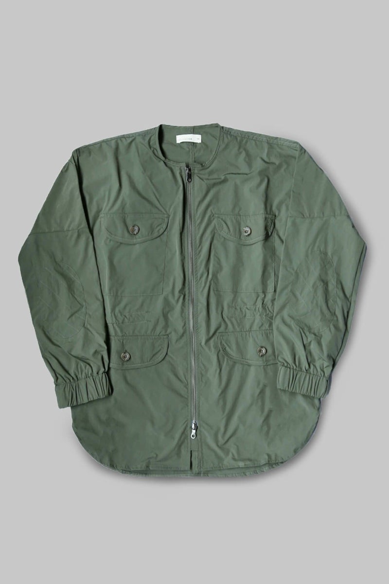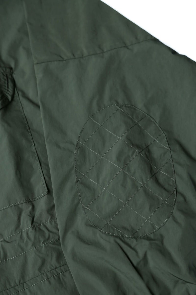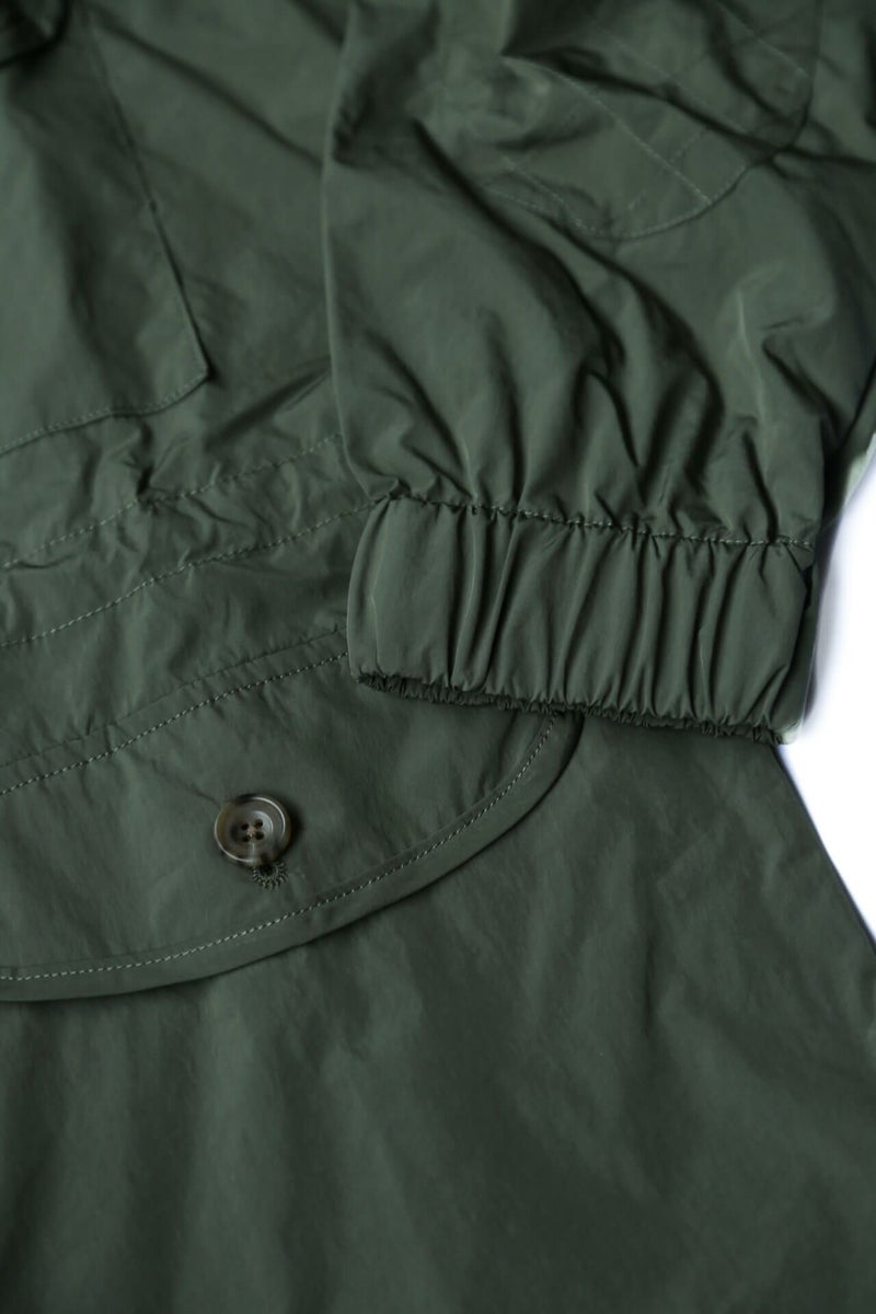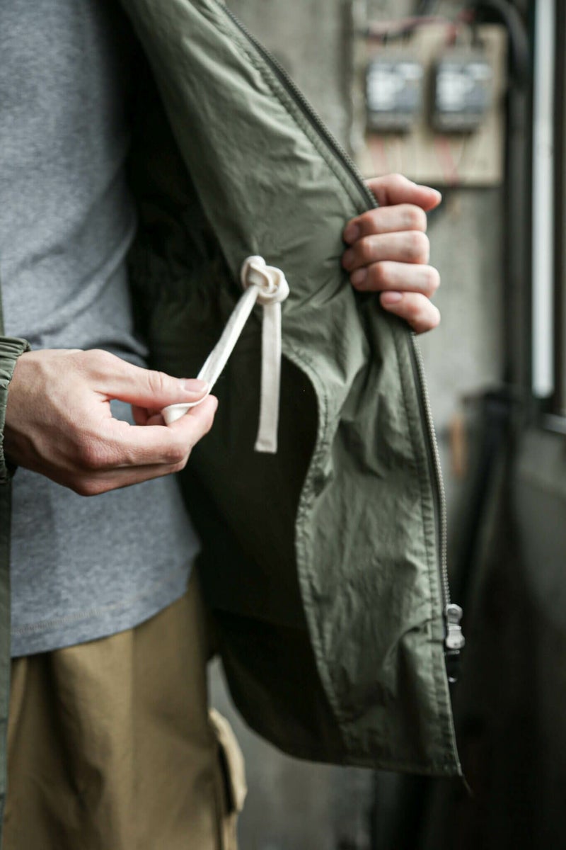 rdv o globe(ランデヴー オー グローブ) 素材にはポリエステル・ナイロンを複合したマイクロファイバーを高密度に織り上げ、超高収縮加工を施したことによって生まれる、程よいヌメリ感ときめ細かな風合いが特徴です。すっきりとした襟元のデザインにミリタリーライクなポケットやエルボーパッチの機能的なデザインが特徴です。ウエストの内側のドローコードでシルエットが調整可能となります。 <素材> NYLON 57% / POLYESTER 43% <生産国> MADE IN JAPAN 商品についてのブログはこちら rdv o glob / LENNY CH. PRICE : ¥46,200(税込み) 品番 : 241CH004