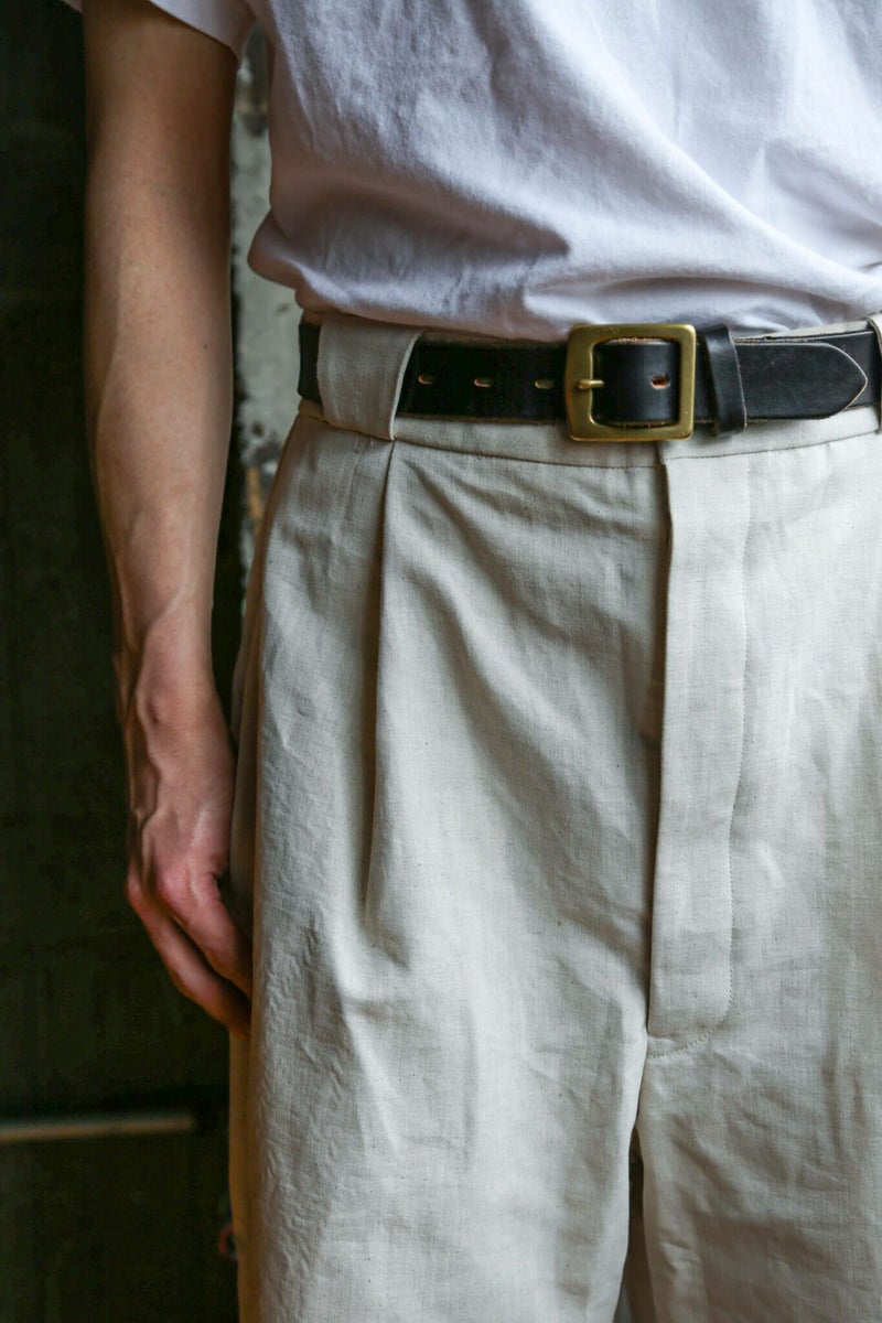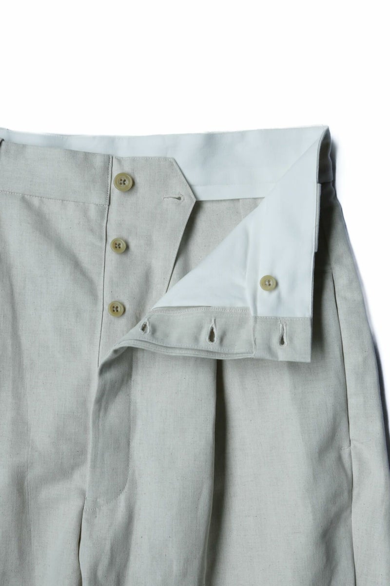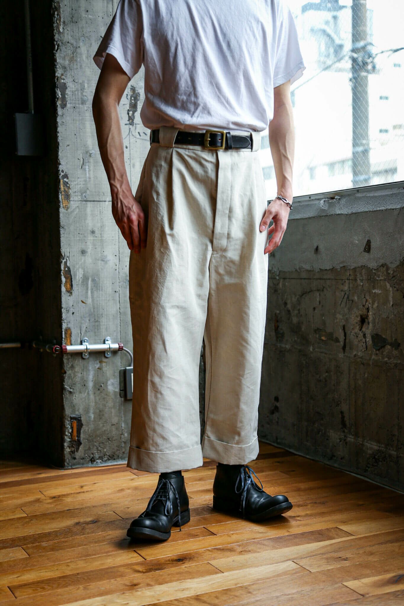 素材は夏場にも適したコットンリネン。コットンの柔らかさとリネンのシャリ感があり、表面は微光沢になっているので上品な印象も感じられます。1タック、ウエストにはコインポケット、裾は6cmダブルとクラシカルなデザインが特徴です。