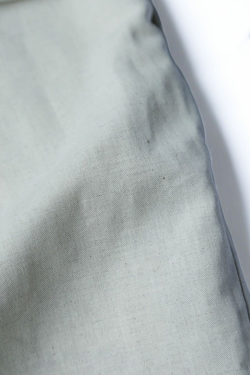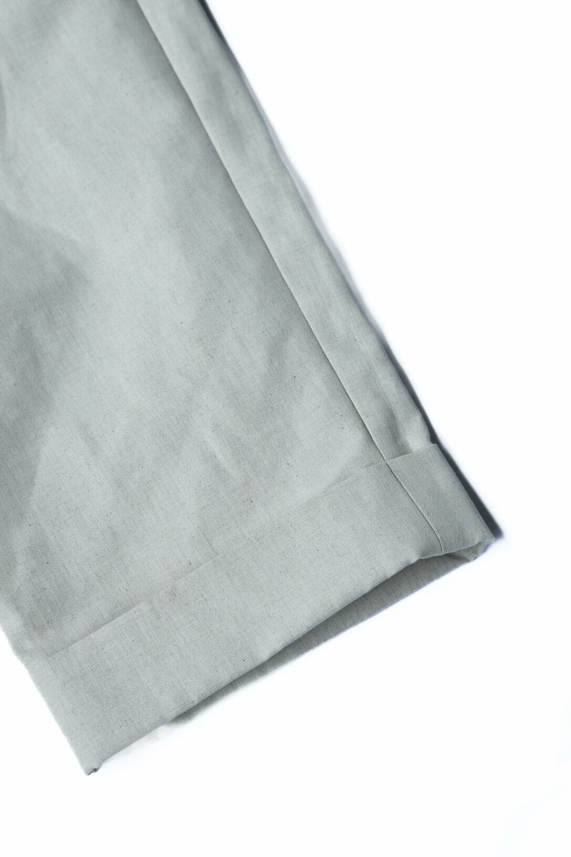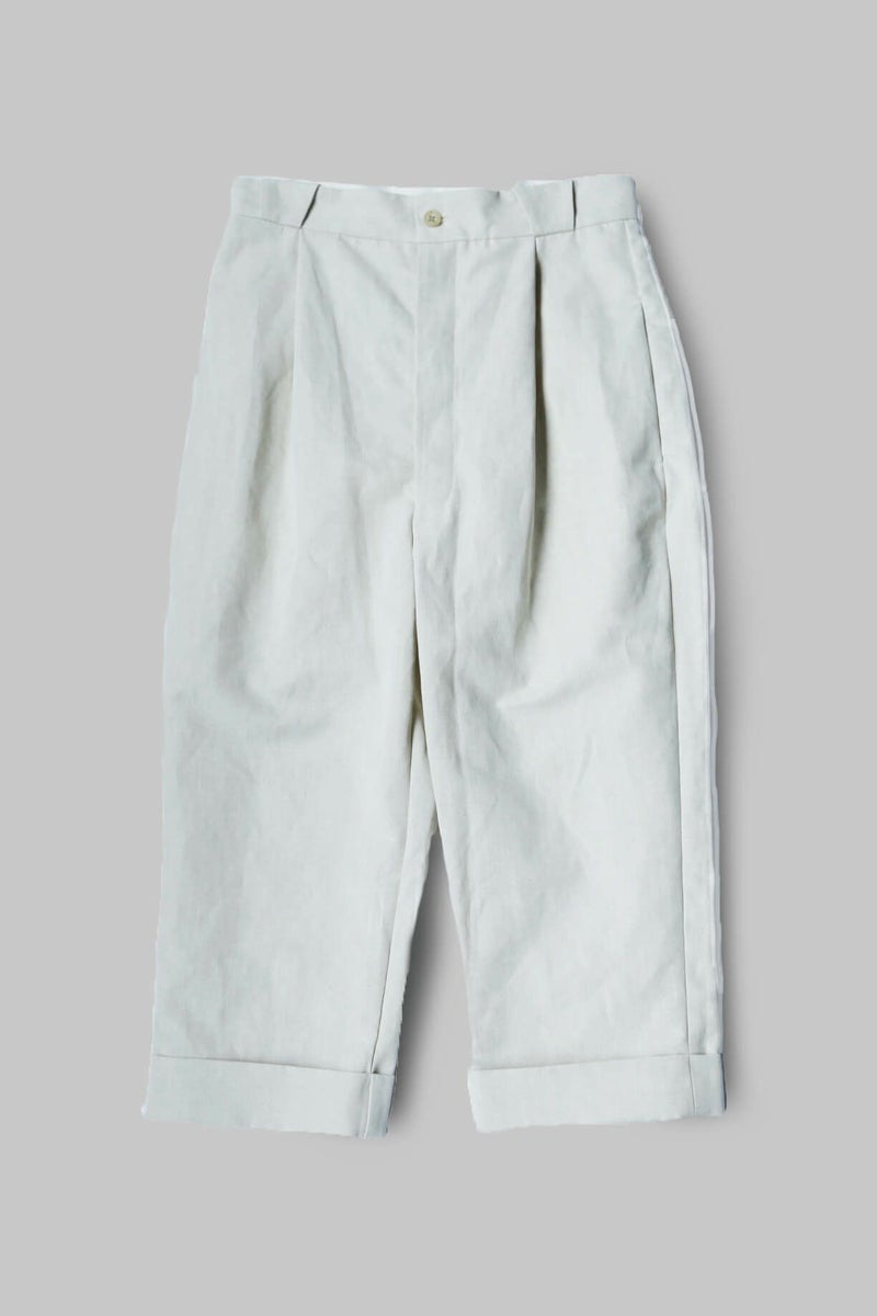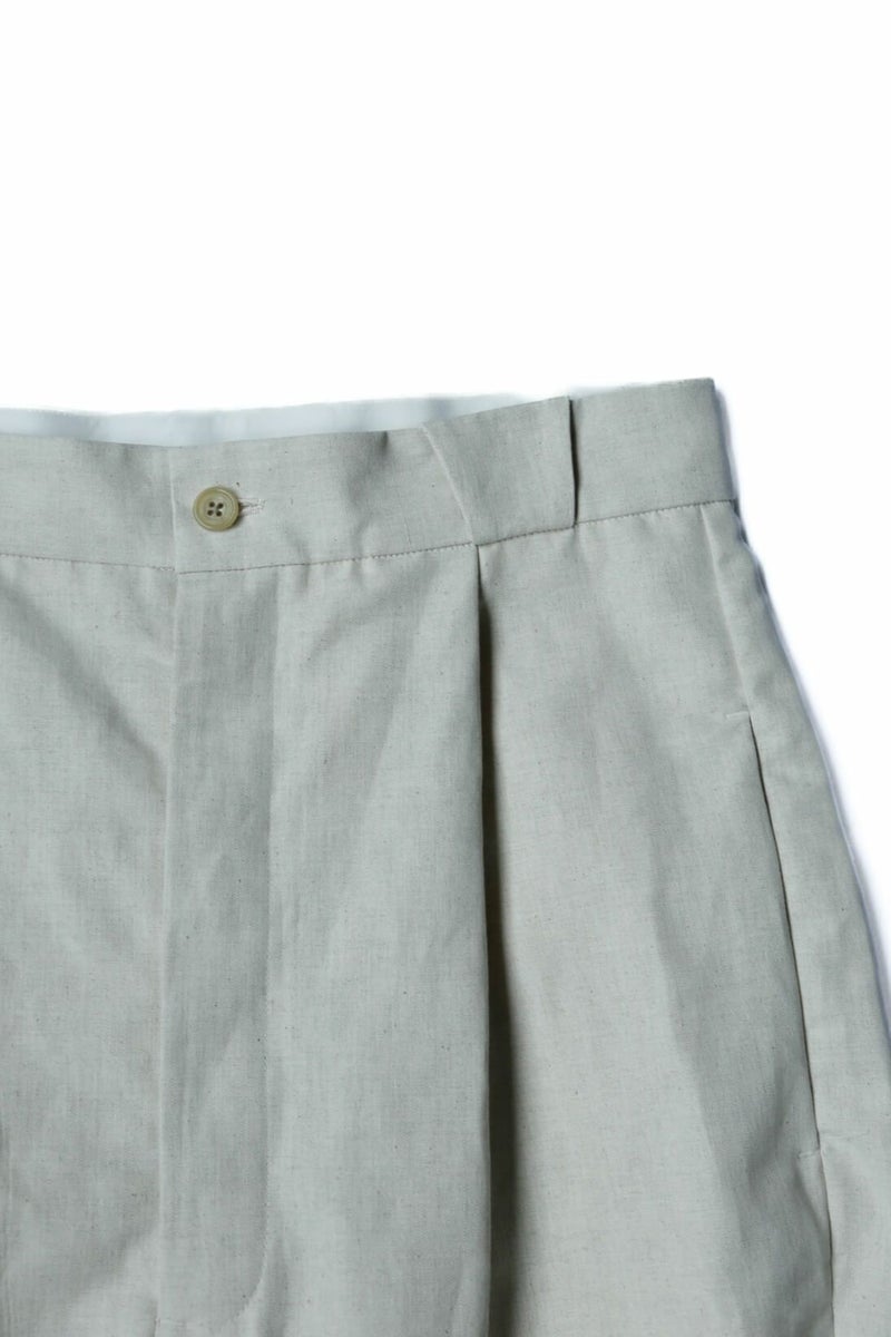 素材は夏場にも適したコットンリネン。コットンの柔らかさとリネンのシャリ感があり、表面は微光沢になっているので上品な印象も感じられます。1タック、ウエストにはコインポケット、裾は6cmダブルとクラシカルなデザインが特徴です。