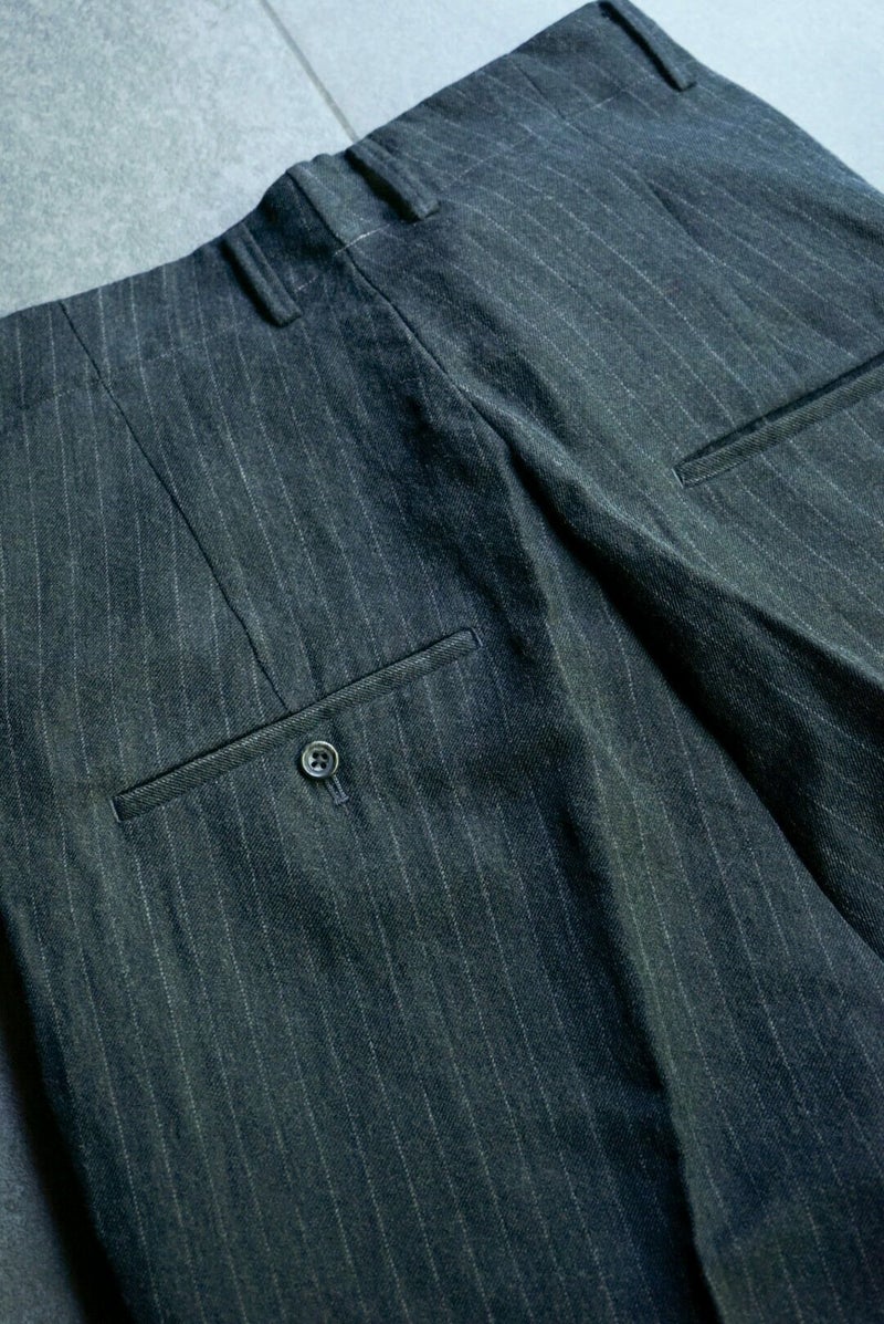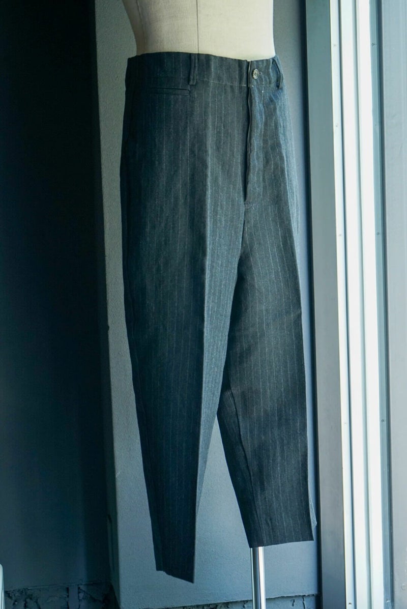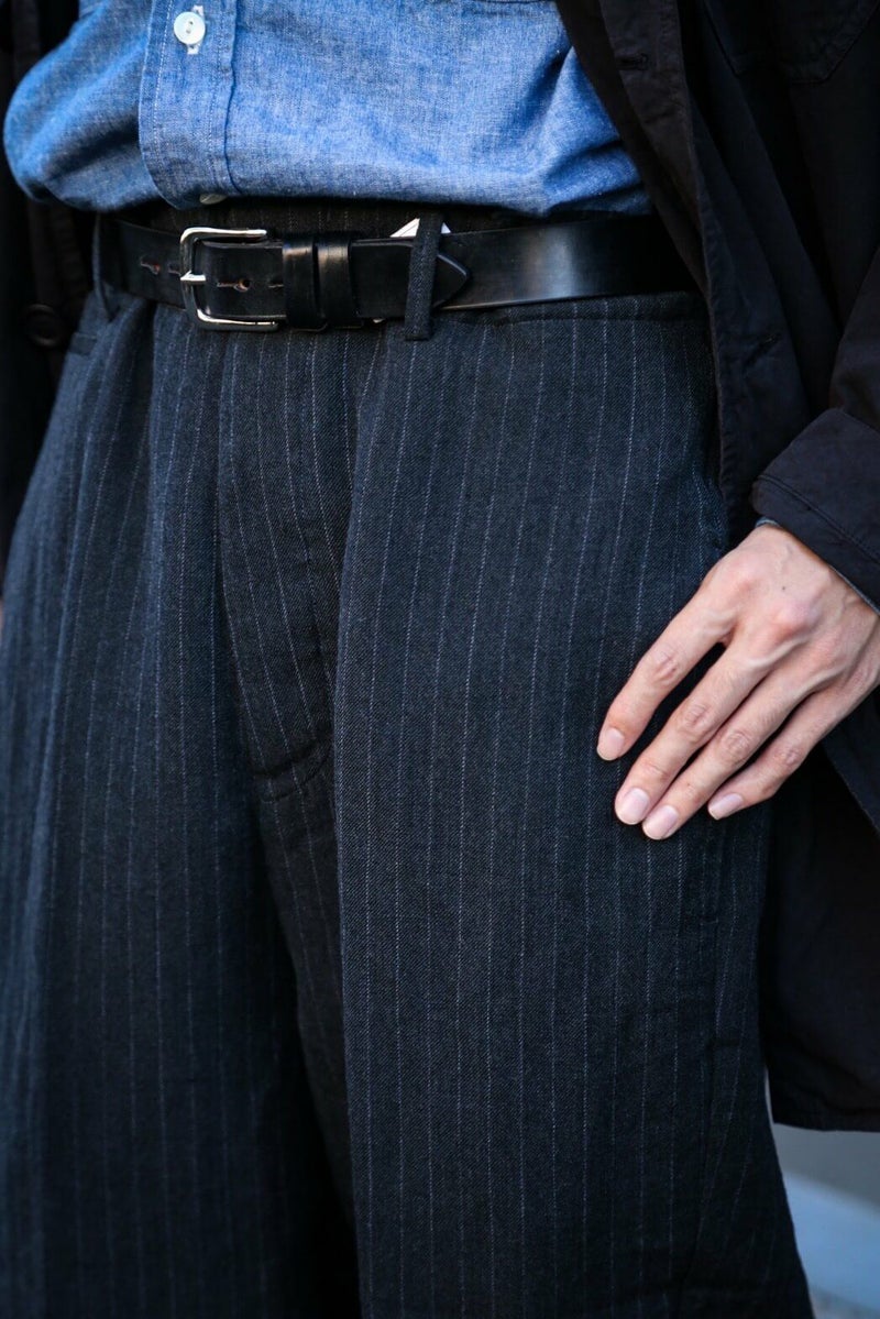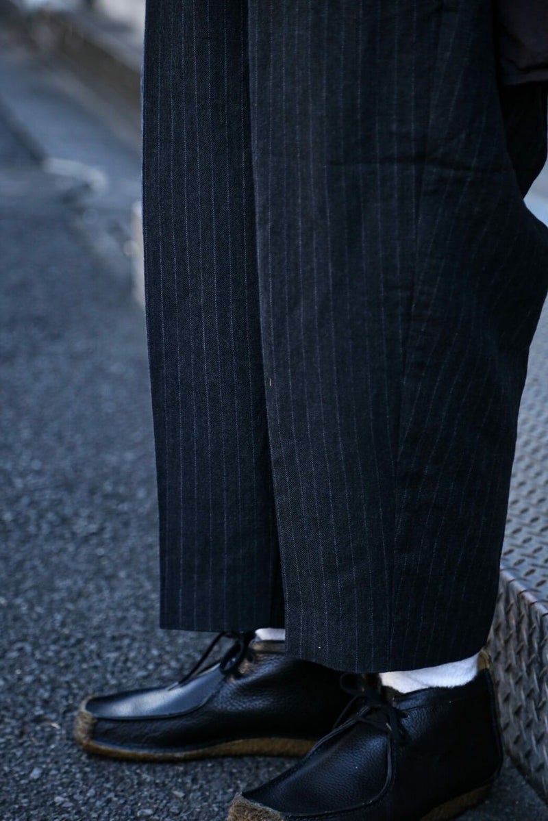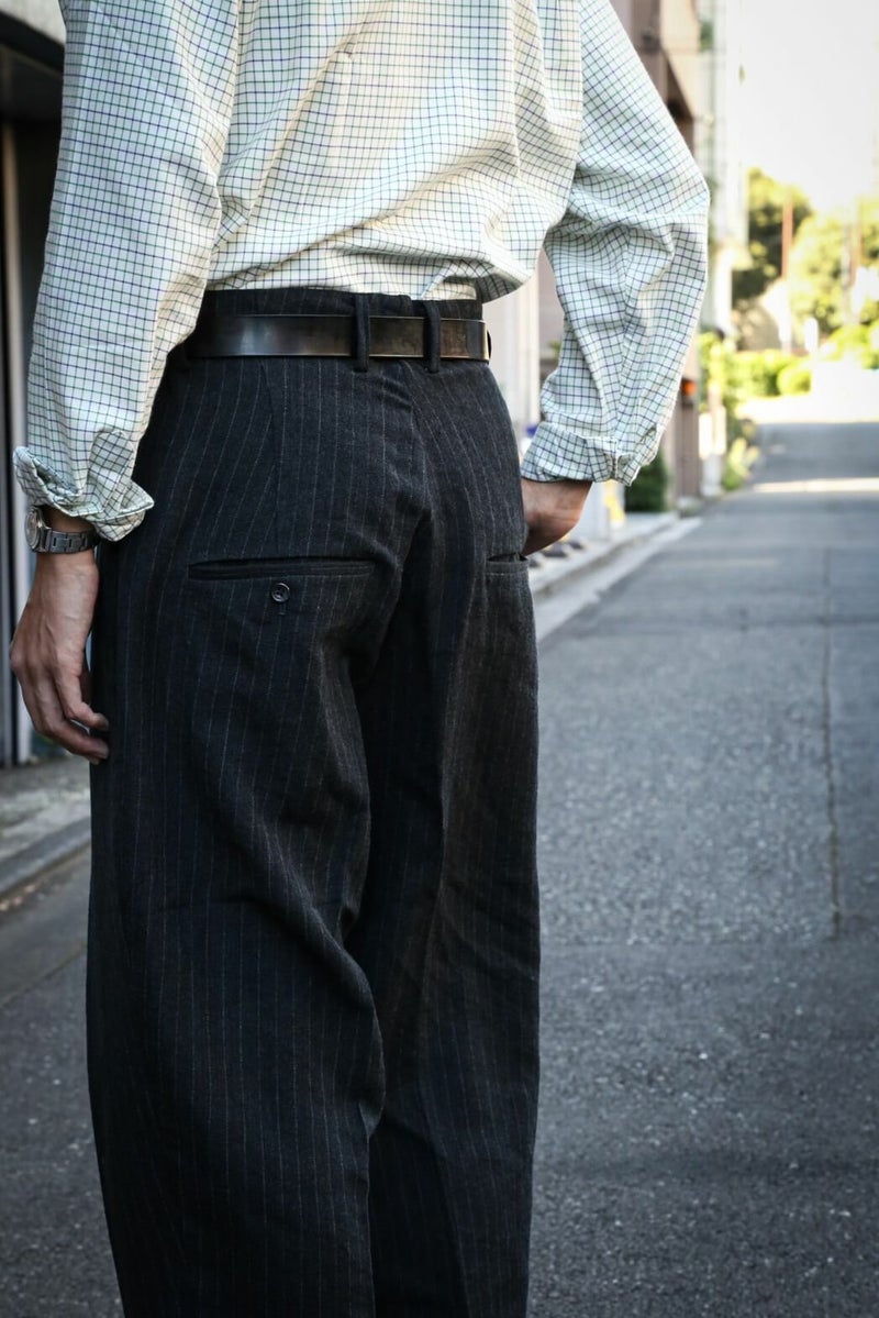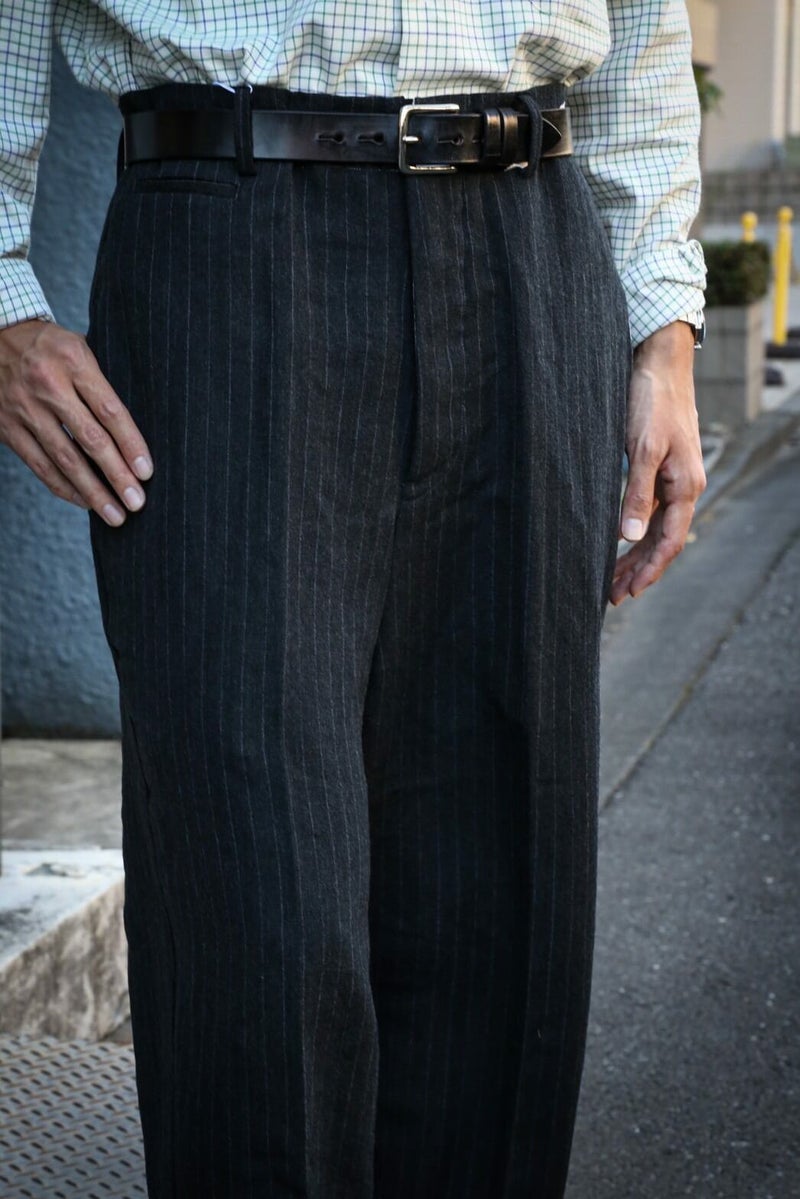 クラシックなトラウザーをrdv o globe(ランデヴー オー グローブ)らしく仕上げたBRUCE PA.。 1タック、ウエストにはコインポケット、裾は6cmダブルとクラシカルなデザインが特徴です。 生地には、ウール素材を使用。 仕上がり感は柔いが無骨で男らしい生地感です。 WOOL 60% LINEN 40% rdv o globe / BRUCE PA. PRICE ¥44,000(税込)