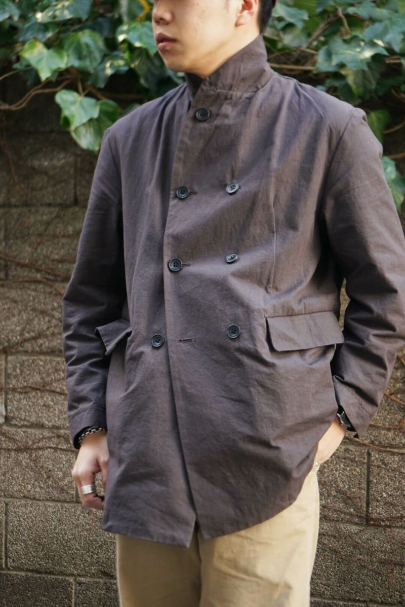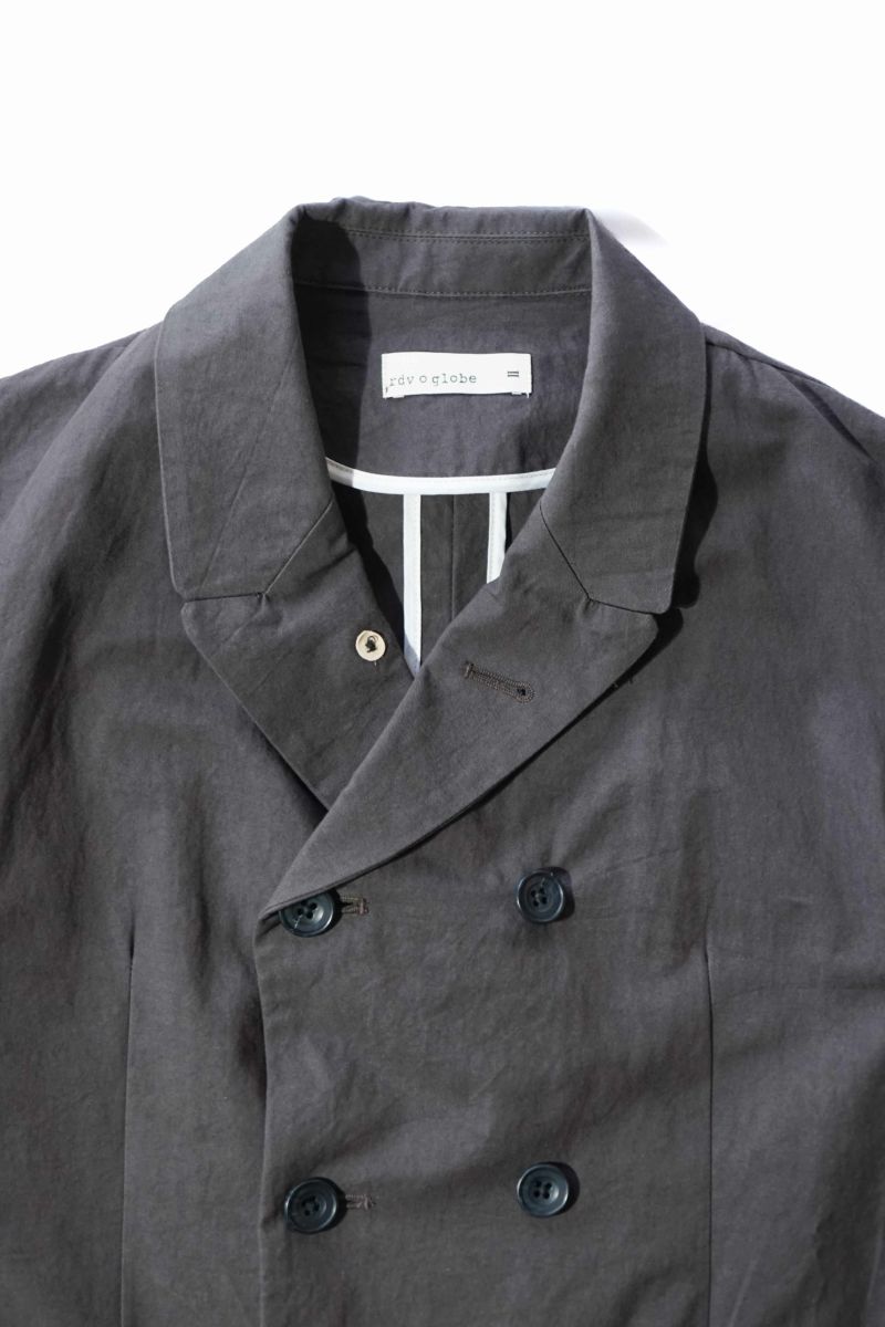 rdv o globeからTRISTAN VE.をリリース。素材にはコットンのドビークロスに後染めを施しております。天日干しにより自然なシワ感となりドライな手触りが特徴です。ダブルのデザインに特徴的なラペルにはレザーの力釦などデザインのアクセントとなっております。1枚仕立てで、3シーズン着られる素材感です。