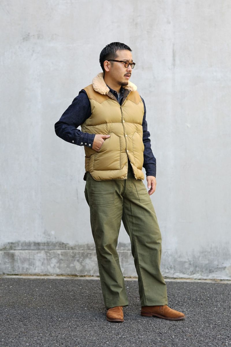 1960年代後半、Rocky Mountain Featherbed(ロッキーマウンテンフェザーベッド、以下RMFB)は、アメリカ・ワイオミング州(俗称カウボーイ・ステイツ)のジャクソンホールで産声を上げる。 ネイティブアメリカンの英知が生み出したレザーケープを参考に、継ぎ目の無い一枚革を使ったウエスタンヨークをアイコンとしたカウボーイ向けのウェアが完成。 それが羽毛布団(FEATHERBED)のような防寒性、保温性を保証するダウンベストであった。 残念ながら1980年代後半にブランドは消滅してしまうが、復活。 一枚断ちのレザーヨーク、天然ムートンを使用した襟など、確かな価値を受け継ぎつつ、さらに“現代”というエッセンスを加え、他に類を見ない贅沢な製品を生み出しています。 そして今なお、世代を超えて世界中の人々を魅了し続けています。