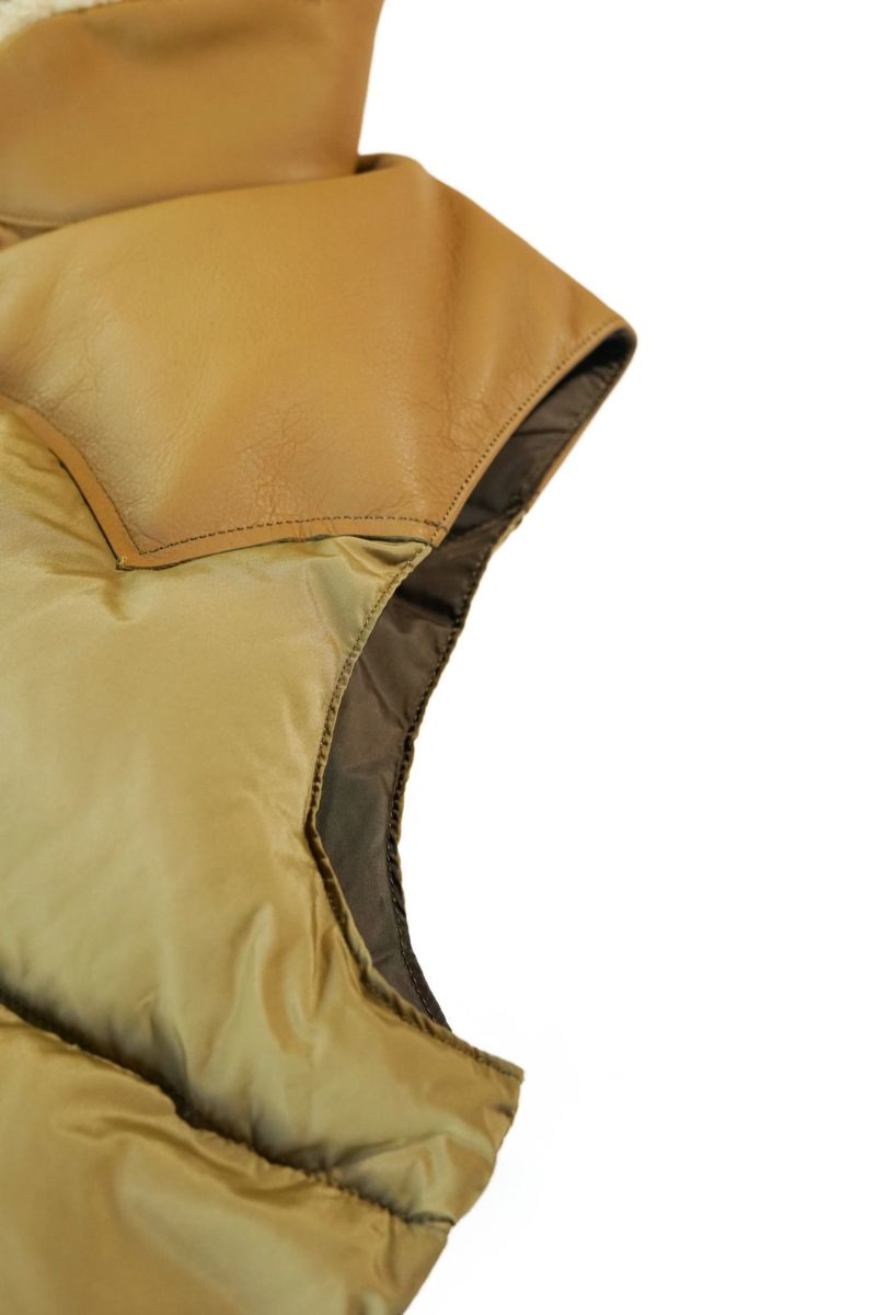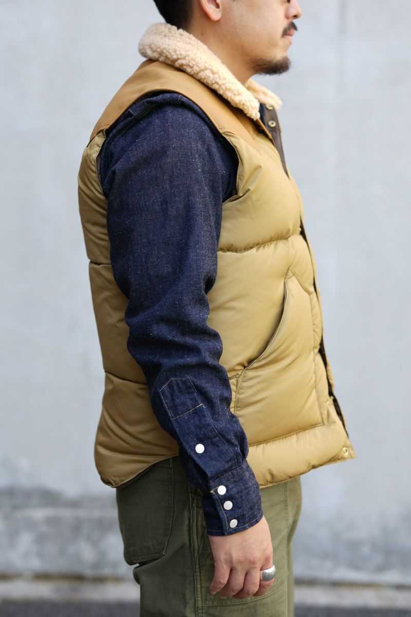 Rocky Mountain Featherbedのオリジナルアイテム、クリスティーベスト。一枚裁ちのヨークレザーと襟の天然ムートンが特徴的なモデルです。