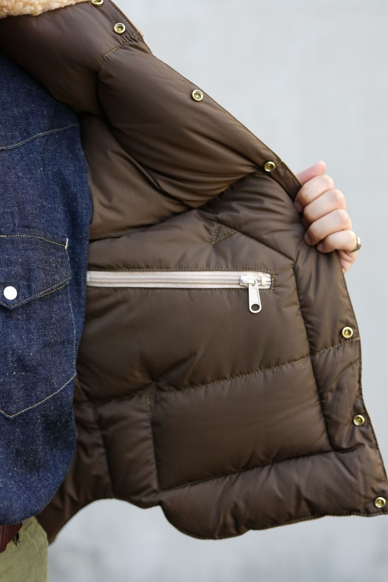 表地・裏地にはRocky Mountain Featherbed復活時に開発した70デニールのオリジナル・ナイロンタフタを使用。ヴィンテージを研究し忠実に復刻したこのナイロンタフタは、ダウンパックの機能を持ち合わせており、この3層構造により、軽さ、保温力が格段にUP。