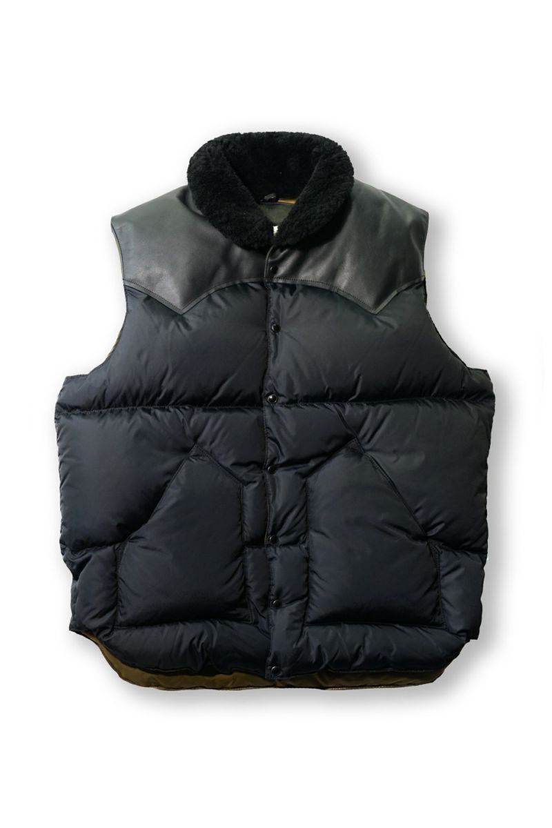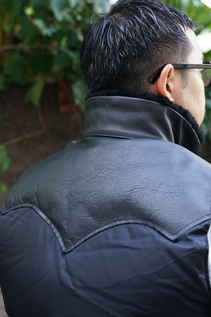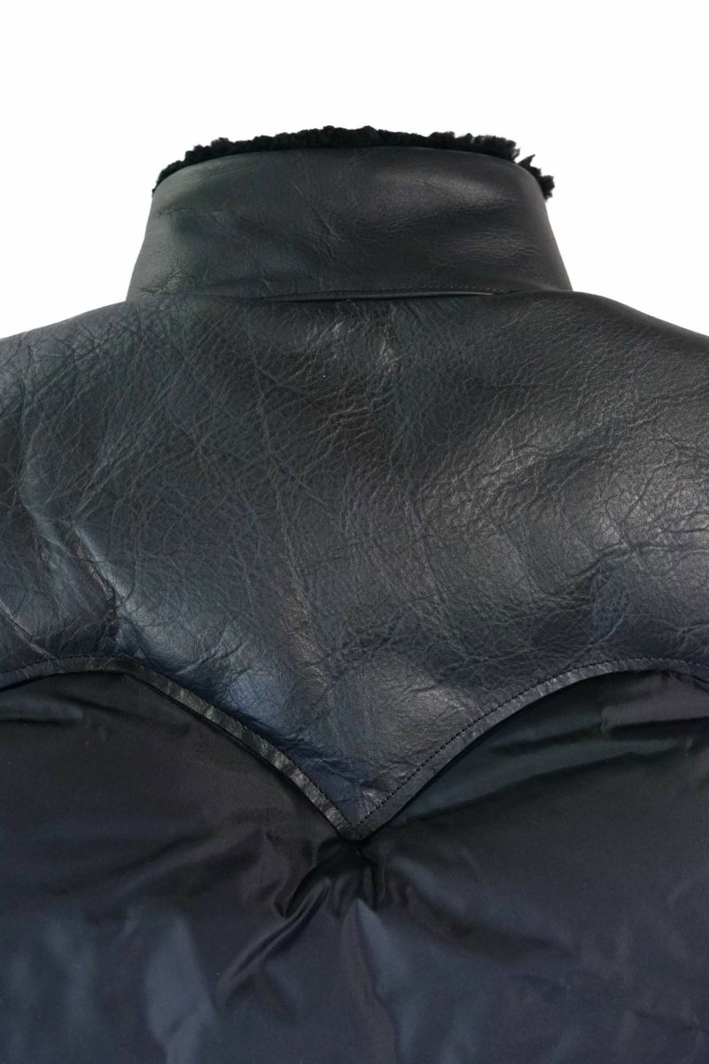 Rocky Mountain Featherbedのオリジナルアイテム、クリスティーベスト。一枚裁ちのヨークレザーと襟の天然ムートンが特徴的なモデルです。