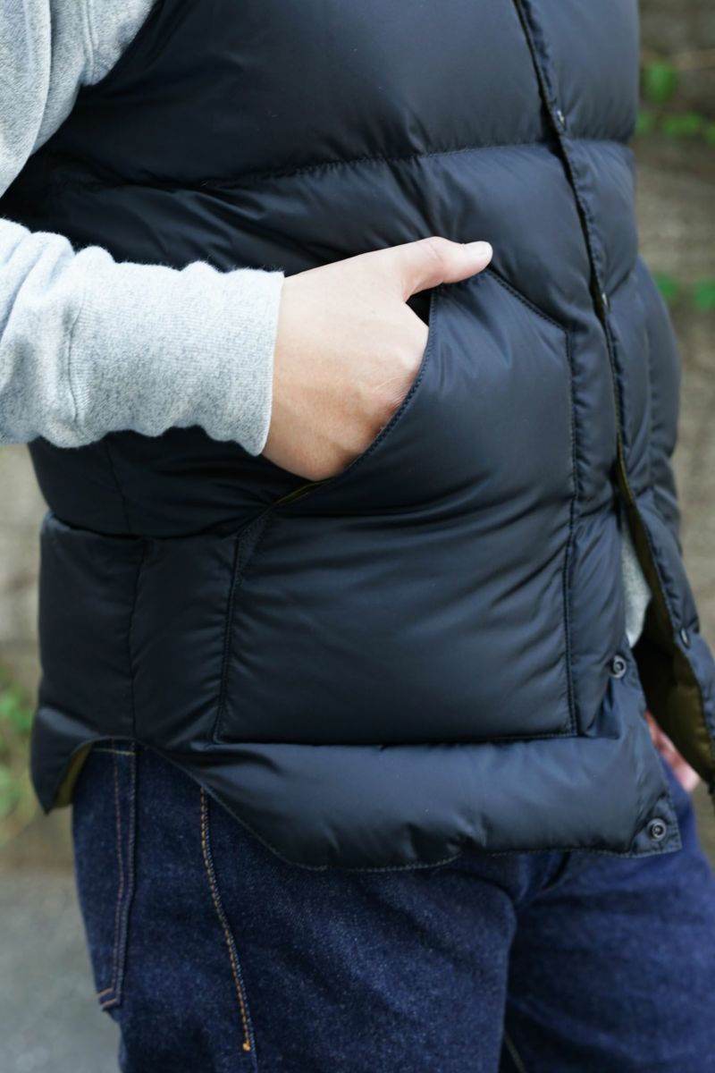 表地・裏地にはRocky Mountain Featherbed復活時に開発した70デニールのオリジナル・ナイロンタフタを使用。ヴィンテージを研究し忠実に復刻したこのナイロンタフタは、ダウンパックの機能を持ち合わせており、この3層構造により、軽さ、保温力が格段にUP。