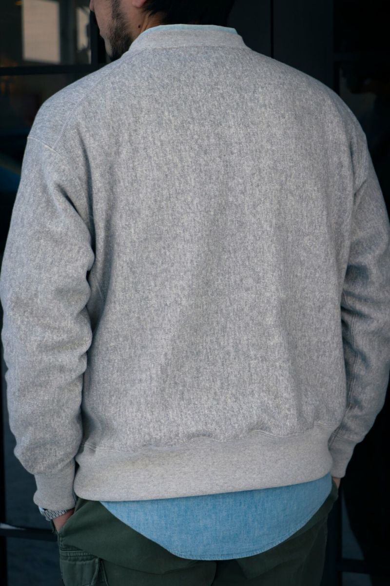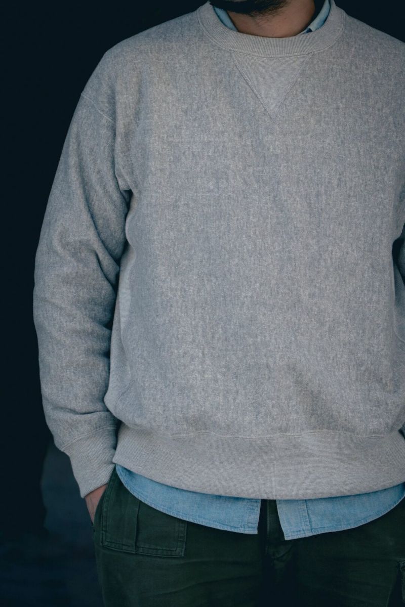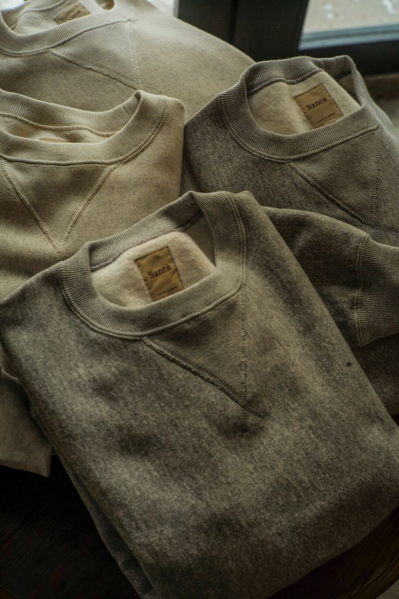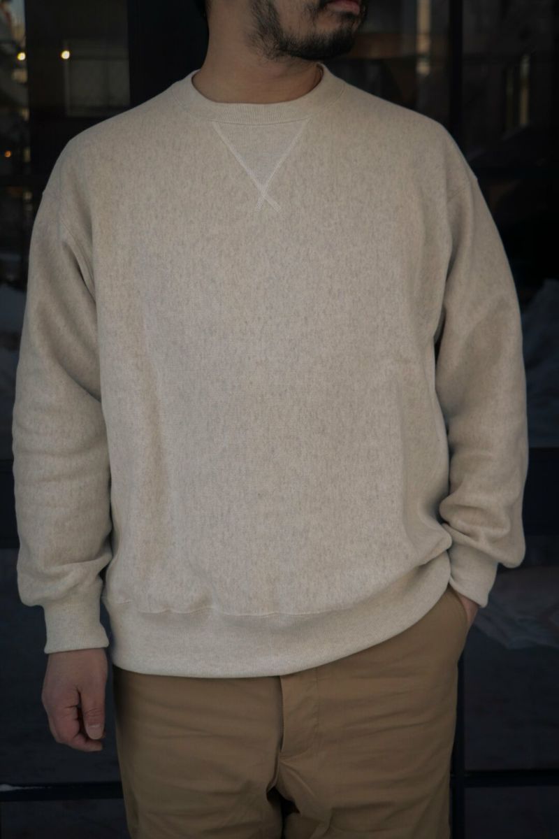 ARCH別注によるSancaの"CREW SWEAT SHIRT - ARCH EXCLUSIVE MODEL -" ヴィンテージのリバースタイプスウェットを元に、前V、身幅やディテールをクラシックな仕様に仕上げた、アメリカの古き良きスウェットをベースに製作された一枚。 生地は、丸編地の産地である和歌山県に現存する数少ない旧式の吊り編機によって編み立てています。糸に余計な負担がかからなく、また生地も強制的に巻きる事なく自然に溜まっていきます。洗い込むほどに実感できる手編み感覚の豊かな風合いがこの素材の魅力です。 カラーは、ベーシックなグレーとオートミールの2色展開です。 COTTON 100% MADE IN JAPAN ※こちらの商品はブログでも詳しくご紹介しております。 https://archstyle.tv/yonemuraya/ Sanca / CREW SWEAT SHIRT - ARCH EXCLUSIVE MODEL - Price ¥20,900(税込)