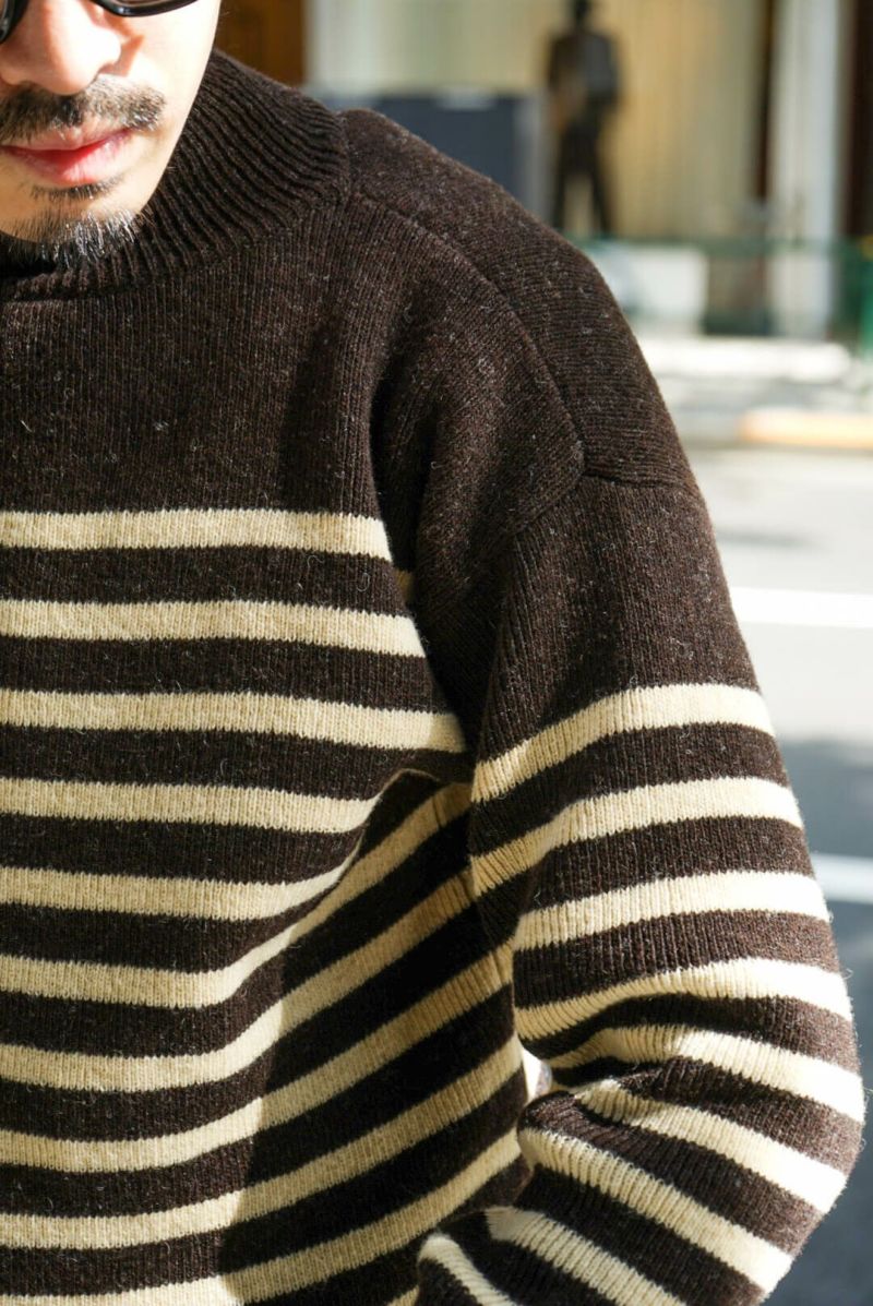シェットランドウールの糸を強撚した糸を使用し、強く撚りをかけることで、ミリタリーセーターような硬さのある風合い。