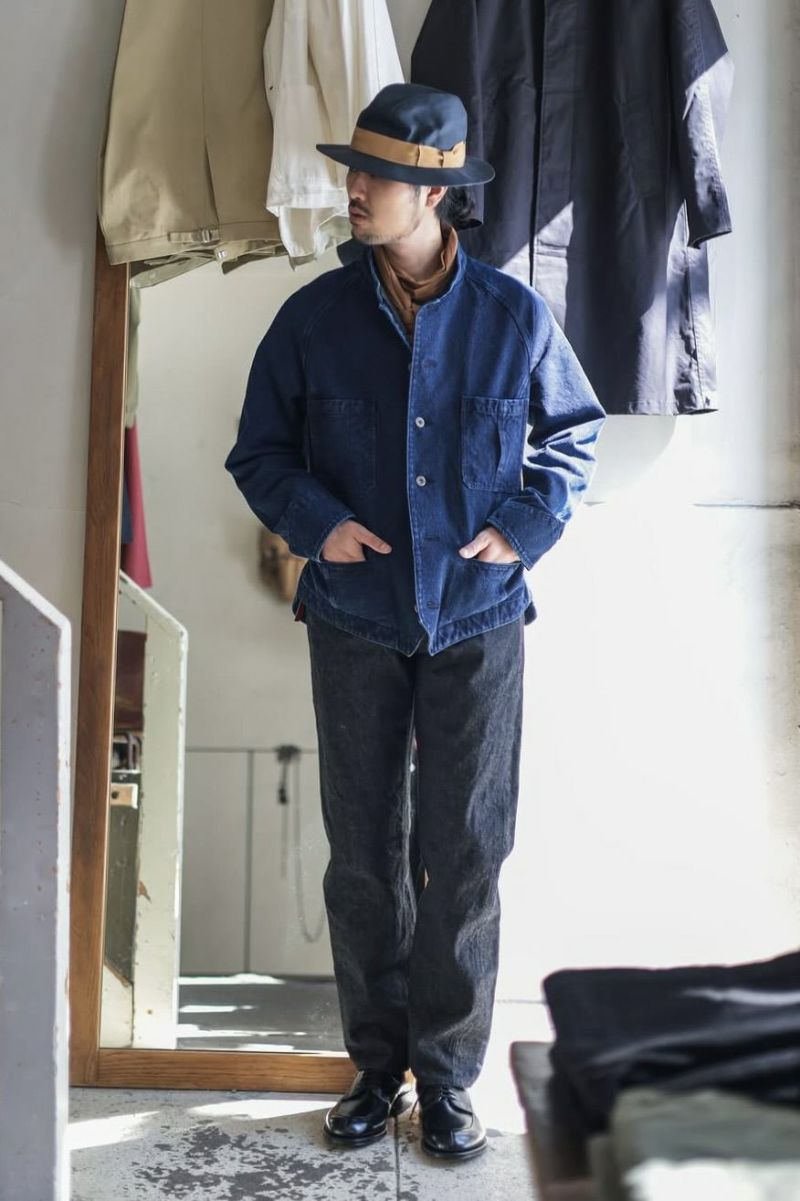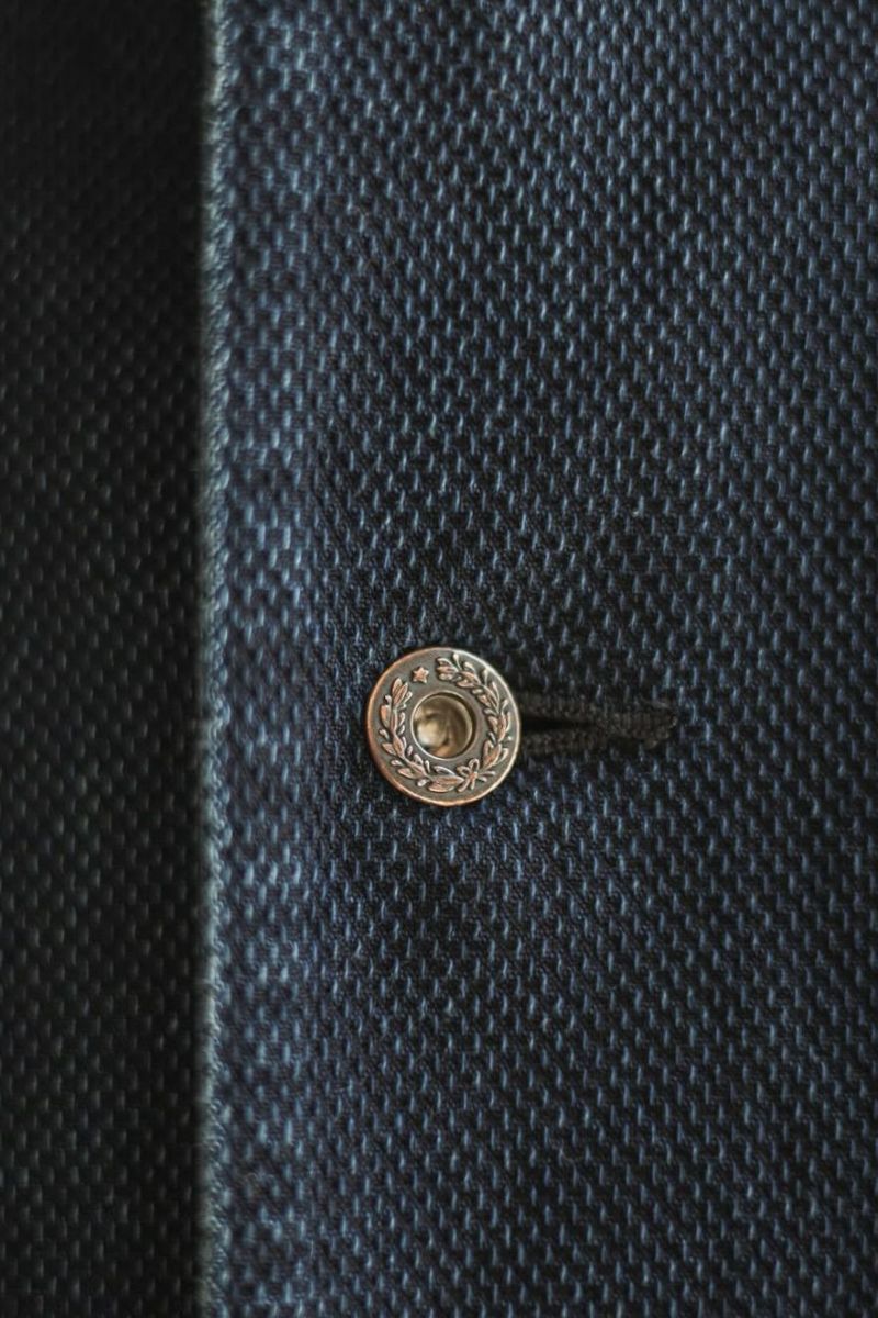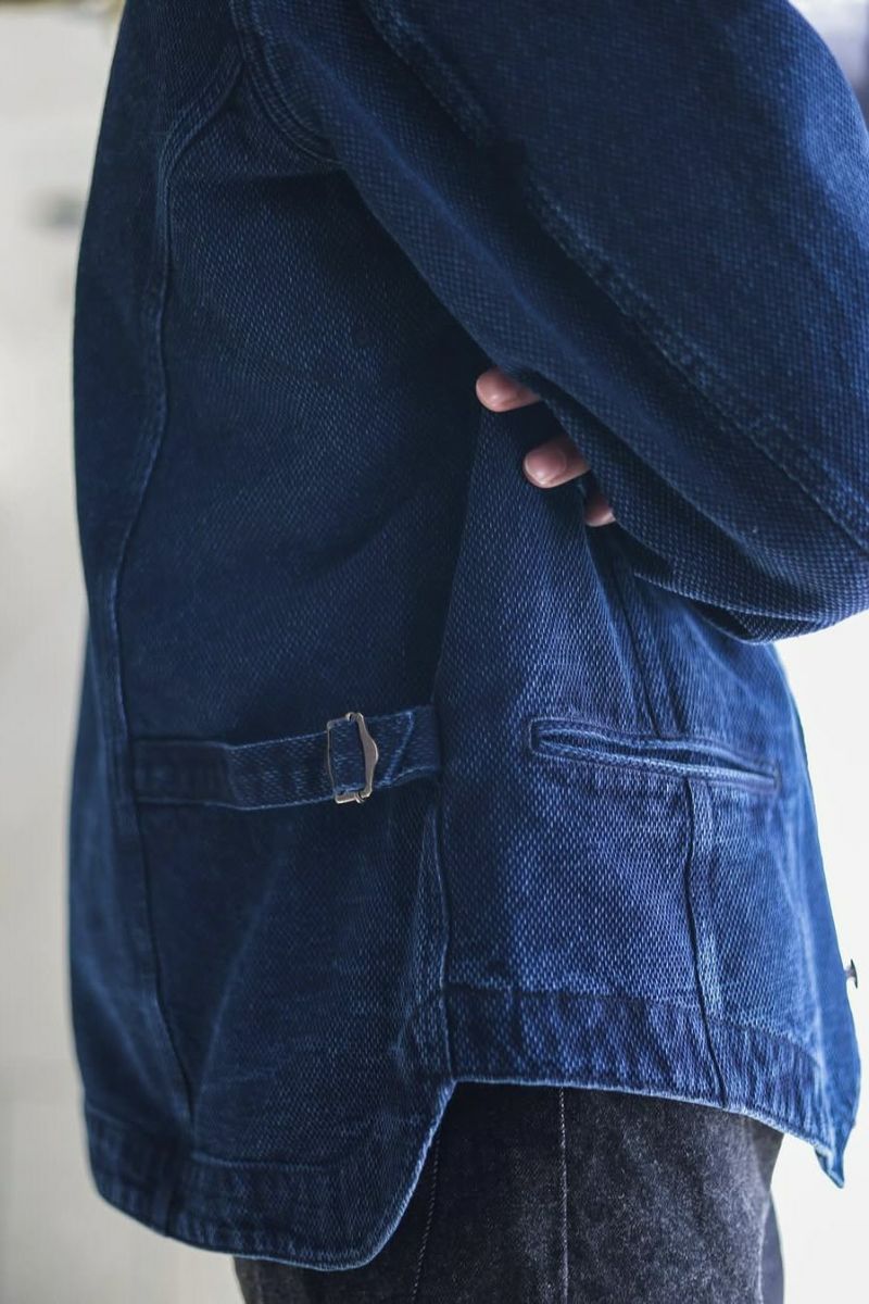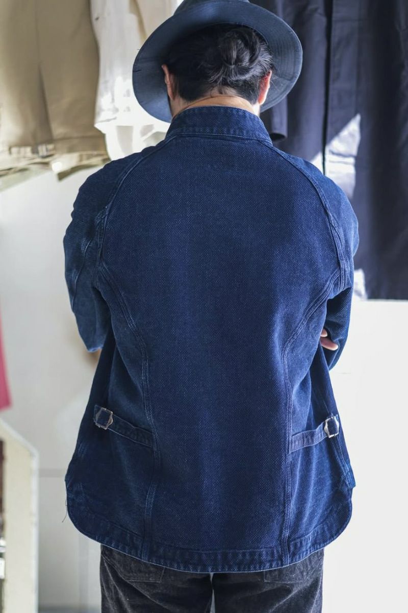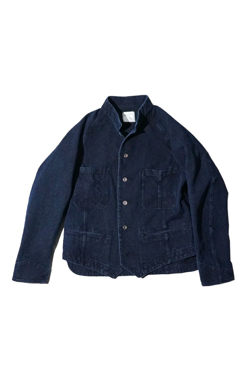 60'sイギリスのエンジニアジャケットをイメージしてリデザインした立ち襟・ラグランスリーブのショート丈ジャケット。月桂樹ネオバーボタン使用、後身左右のアジャスターによりフィット感も調整可能。素材としての当ブランド定番のインディゴ染めの刺し子生地を使用し、ボールバイオ加工を施している。