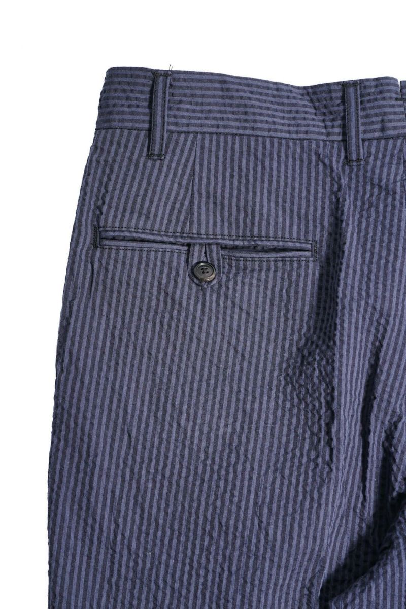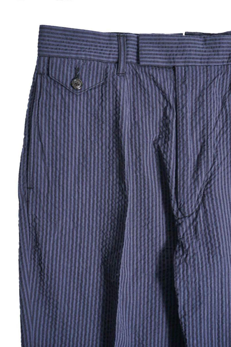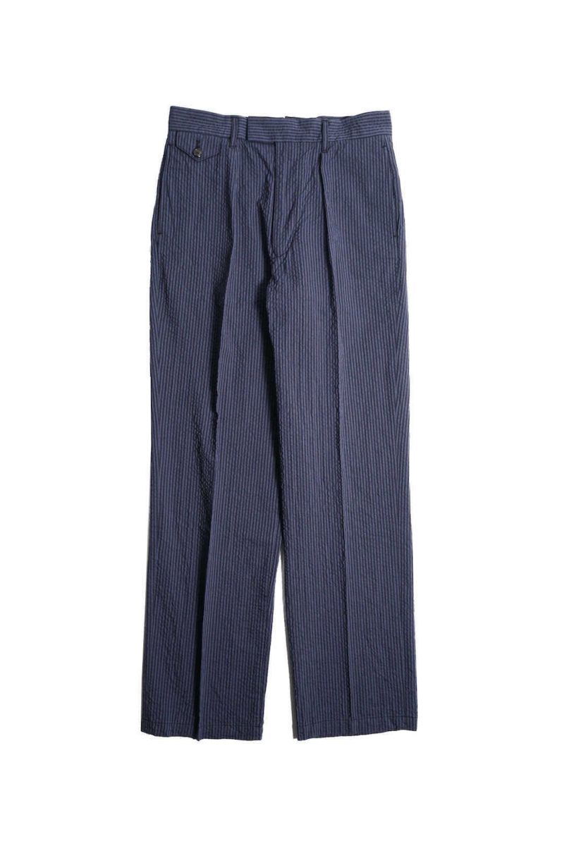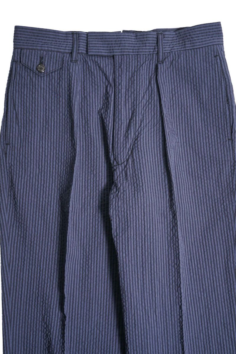 腰のウォッチポケットと2つの前カンがつく長い持ち出しのウエストベルトが特徴的なワンプリーツインタックのブリティッシュスタイルのトラウザースをイメージした一本です。シルエットは緩やかなテーパード。素材は清涼感のある高密度コットンシアサッカー。フロントファスナー、マーブル調の本水牛ボタンを使用しています。
