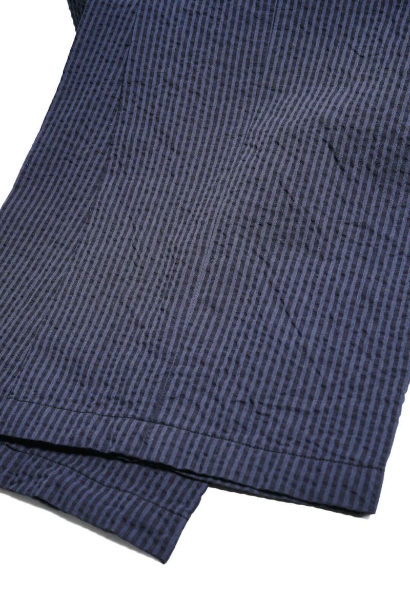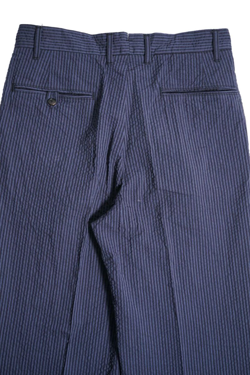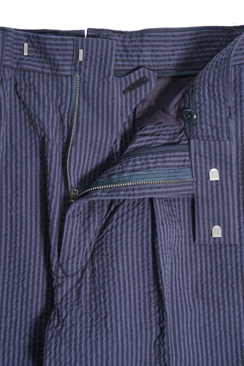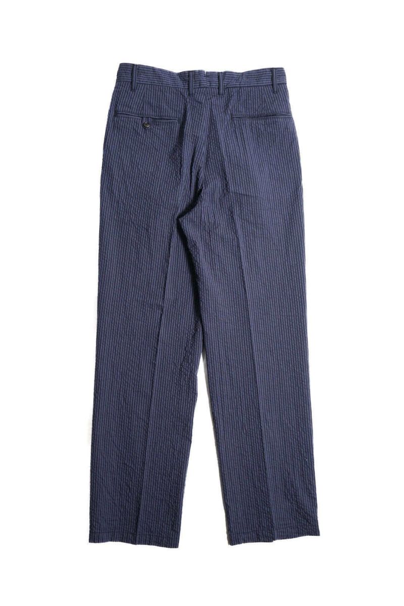 腰のウォッチポケットと2つの前カンがつく長い持ち出しのウエストベルトが特徴的なワンプリーツインタックのブリティッシュスタイルのトラウザースをイメージした一本です。シルエットは緩やかなテーパード。素材は清涼感のある高密度コットンシアサッカー。フロントファスナー、マーブル調の本水牛ボタンを使用しています。
