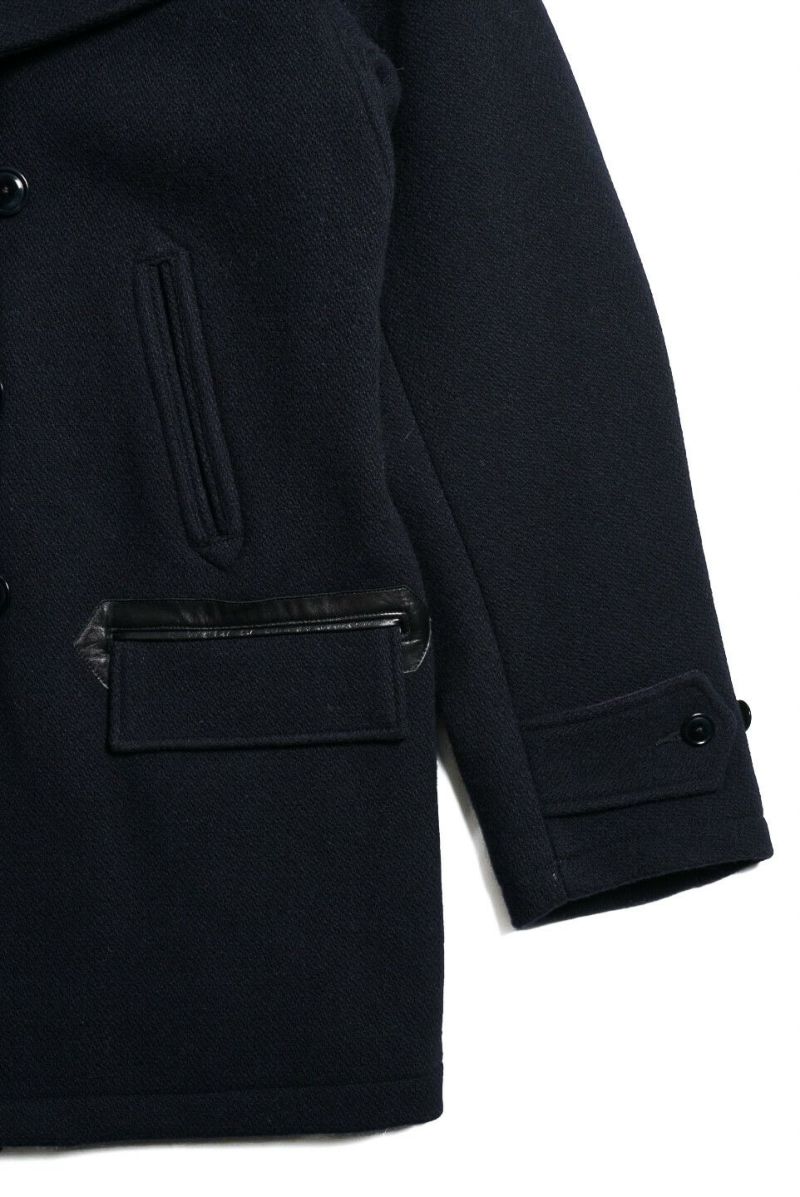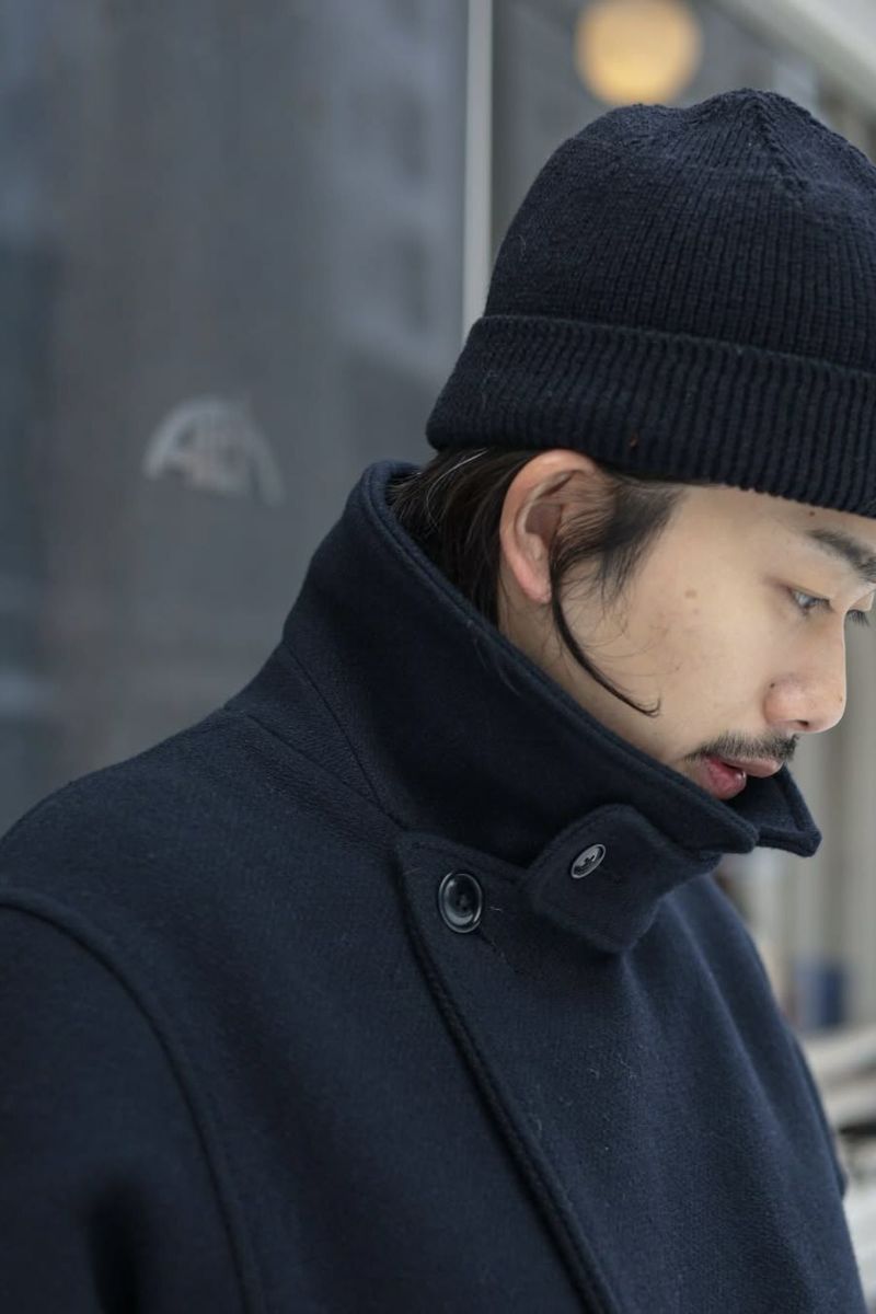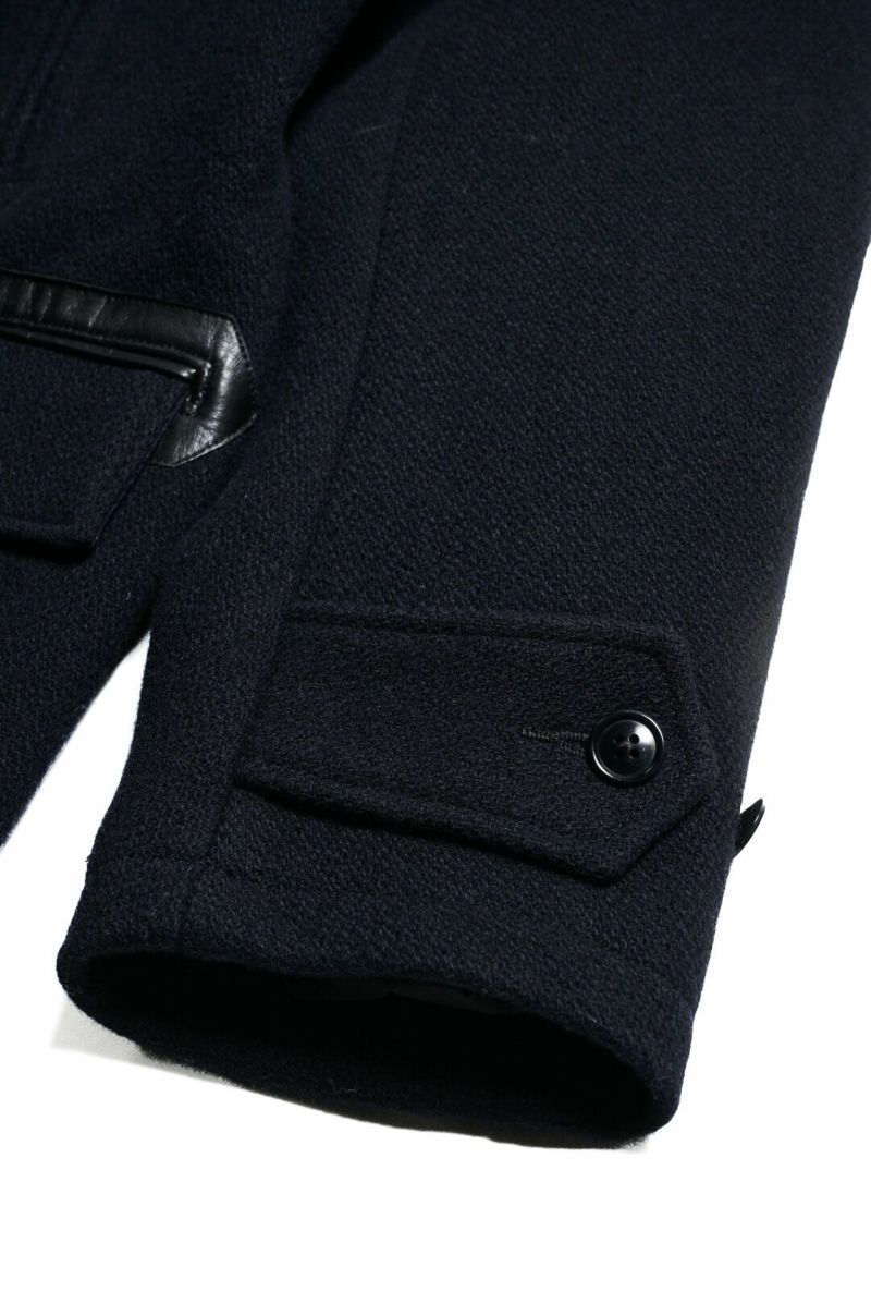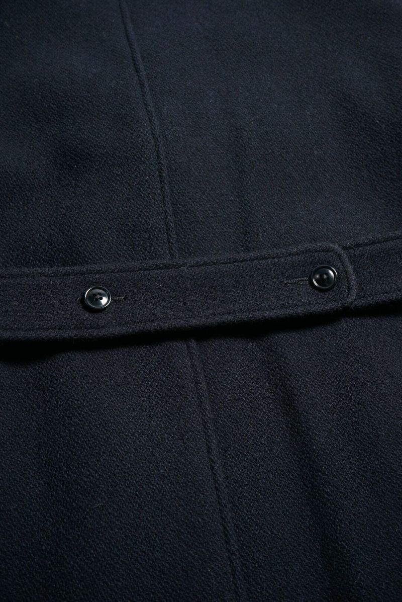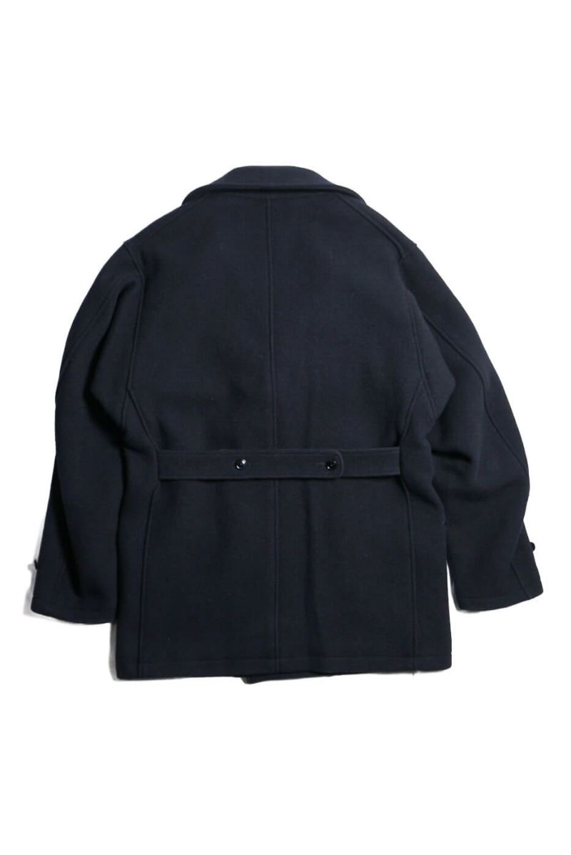 Soundman(サウンドマン) 1940年代のロイヤルネイビーダブルブレスト両前仕立てのリーファーコートがイメージソース。 腕の上げ下げが楽になるピボットスリーブに湾曲したアームがつくフォルムはモーターサイクルコートから。 その他ボタンにて調整するバックベルト、それぞれ同時代の別のコートのディティールから取り入れ、いわゆるレプリカのそれとは一線を画すオリジナルデザインとなる。表地はオイルカット加工を施しデッドストックのような風合いを持つ二重織りのウールメルトン。腰ポケットの補強にはレザー(牛皮)を使用。ボタンはナットボタン。 <素材> 表地 : Wool 90% Nylon10% 裏地 : Cotton 100% 袖裏地 : Polyester 100% <生産国> MADE IN JAPAN Soundman / Reefer PRICE ¥99,000(税込み)