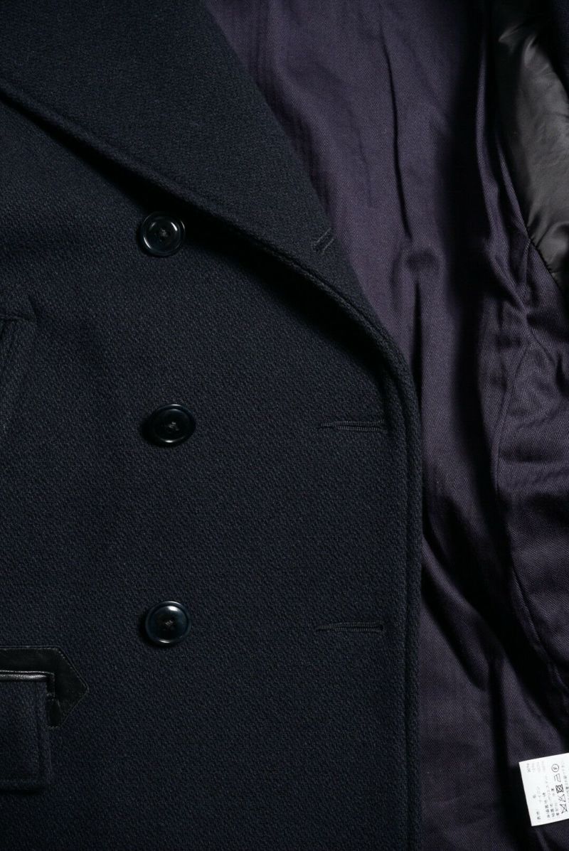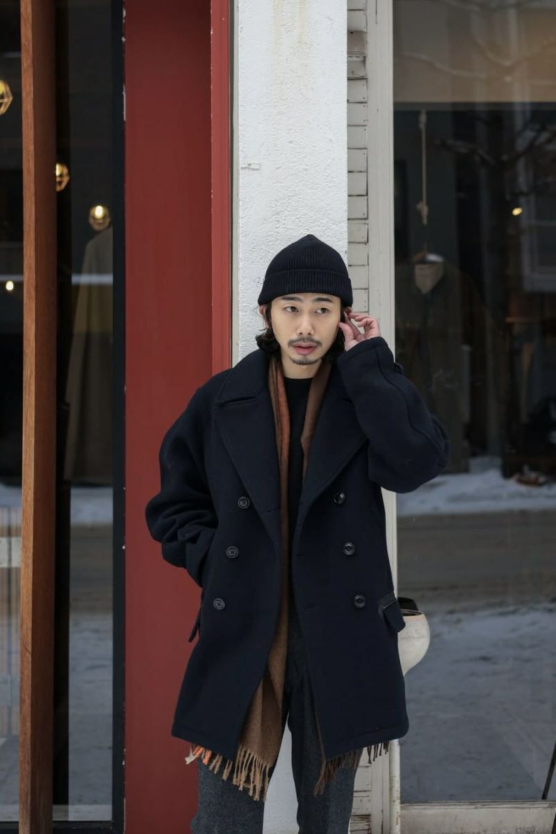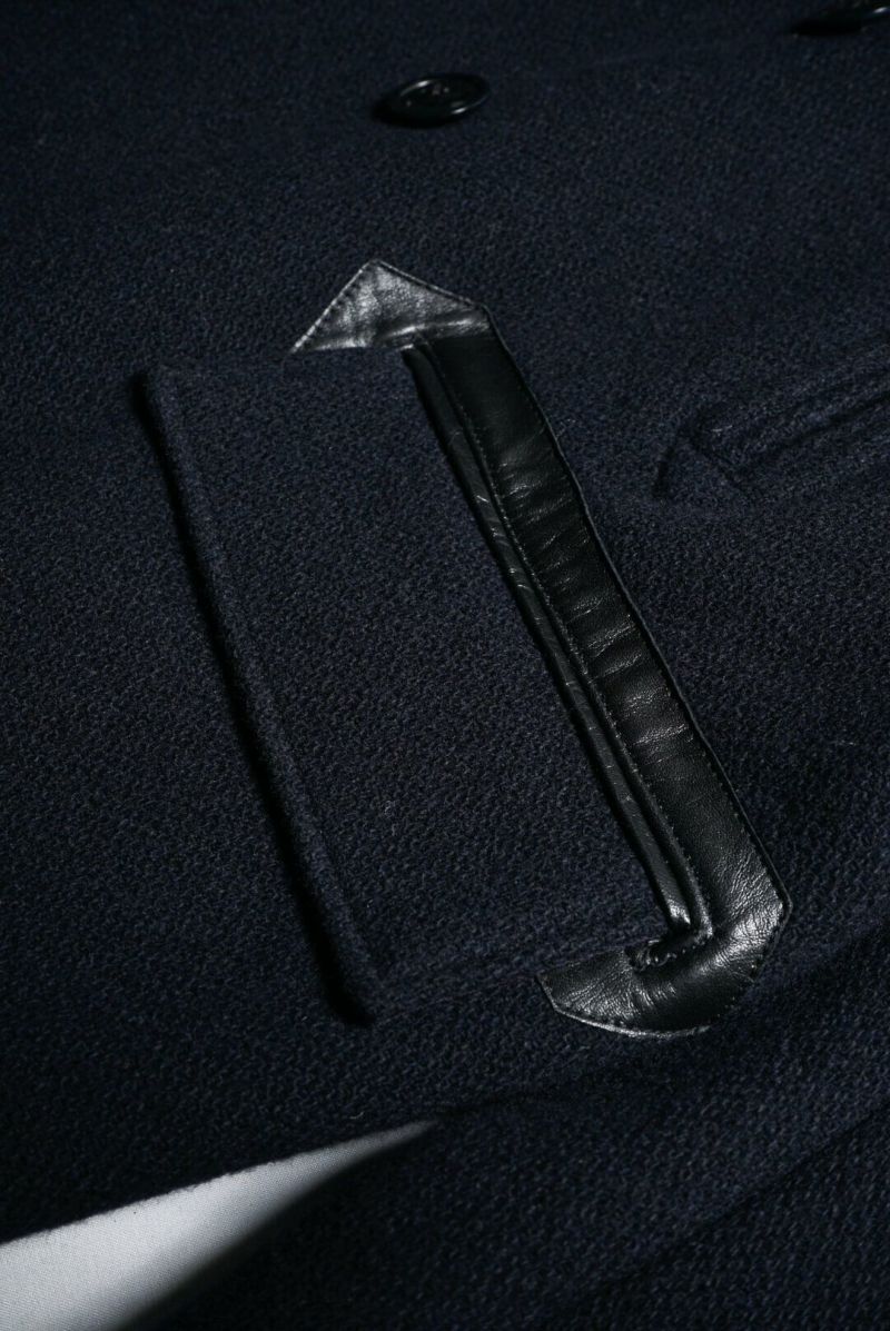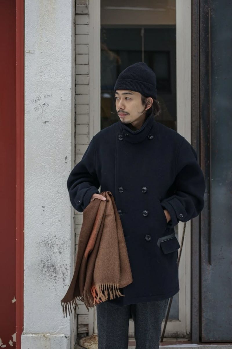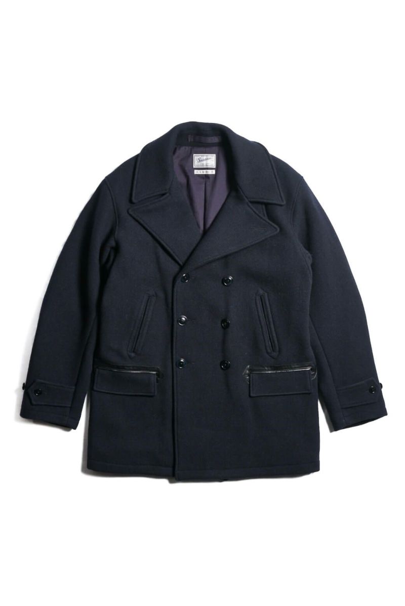 Soundman(サウンドマン) 1940年代のロイヤルネイビーダブルブレスト両前仕立てのリーファーコートがイメージソース。 腕の上げ下げが楽になるピボットスリーブに湾曲したアームがつくフォルムはモーターサイクルコートから。 その他ボタンにて調整するバックベルト、それぞれ同時代の別のコートのディティールから取り入れ、いわゆるレプリカのそれとは一線を画すオリジナルデザインとなる。表地はオイルカット加工を施しデッドストックのような風合いを持つ二重織りのウールメルトン。腰ポケットの補強にはレザー(牛皮)を使用。ボタンはナットボタン。 <素材> 表地 : Wool 90% Nylon10% 裏地 : Cotton 100% 袖裏地 : Polyester 100% <生産国> MADE IN JAPAN Soundman / Reefer PRICE ¥99,000(税込み)