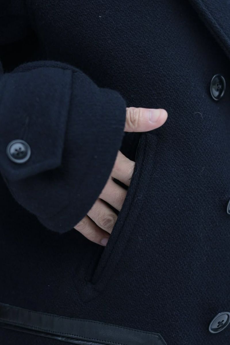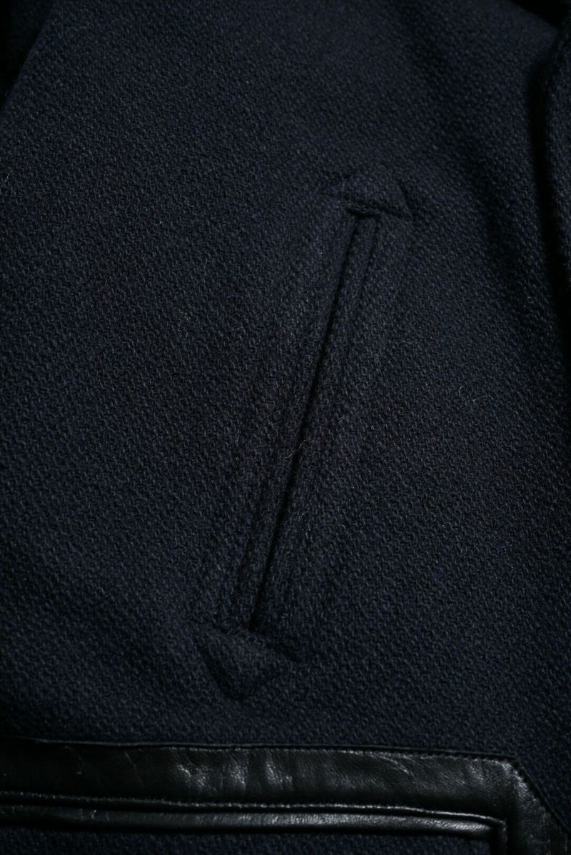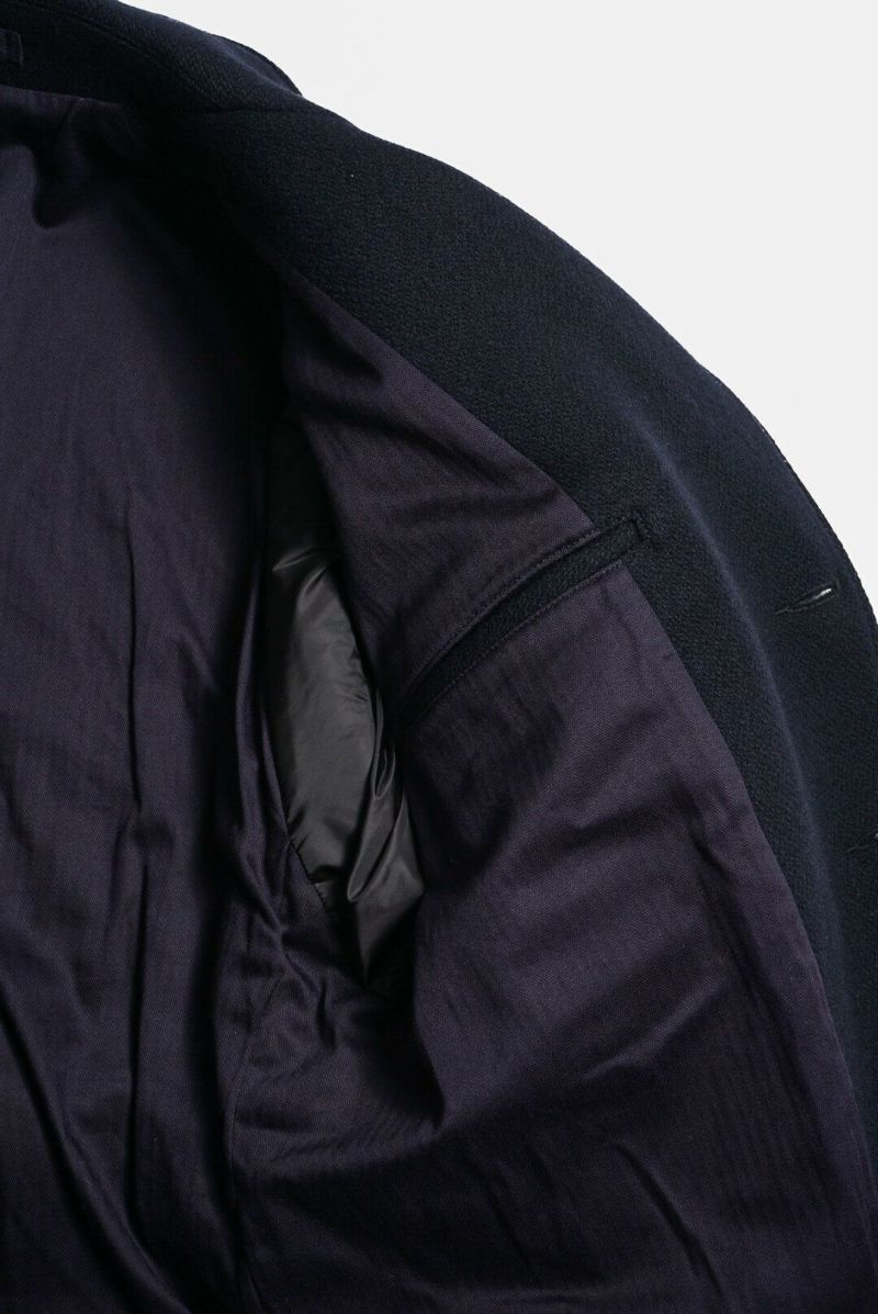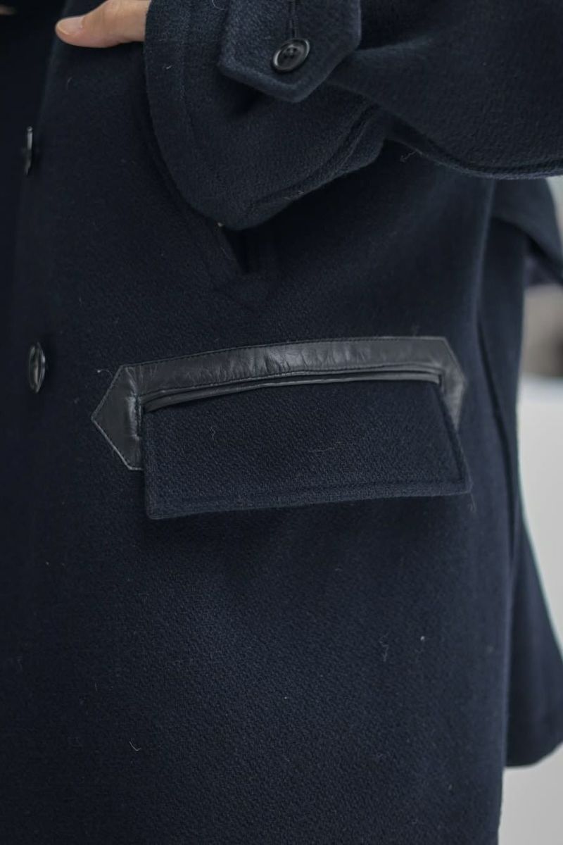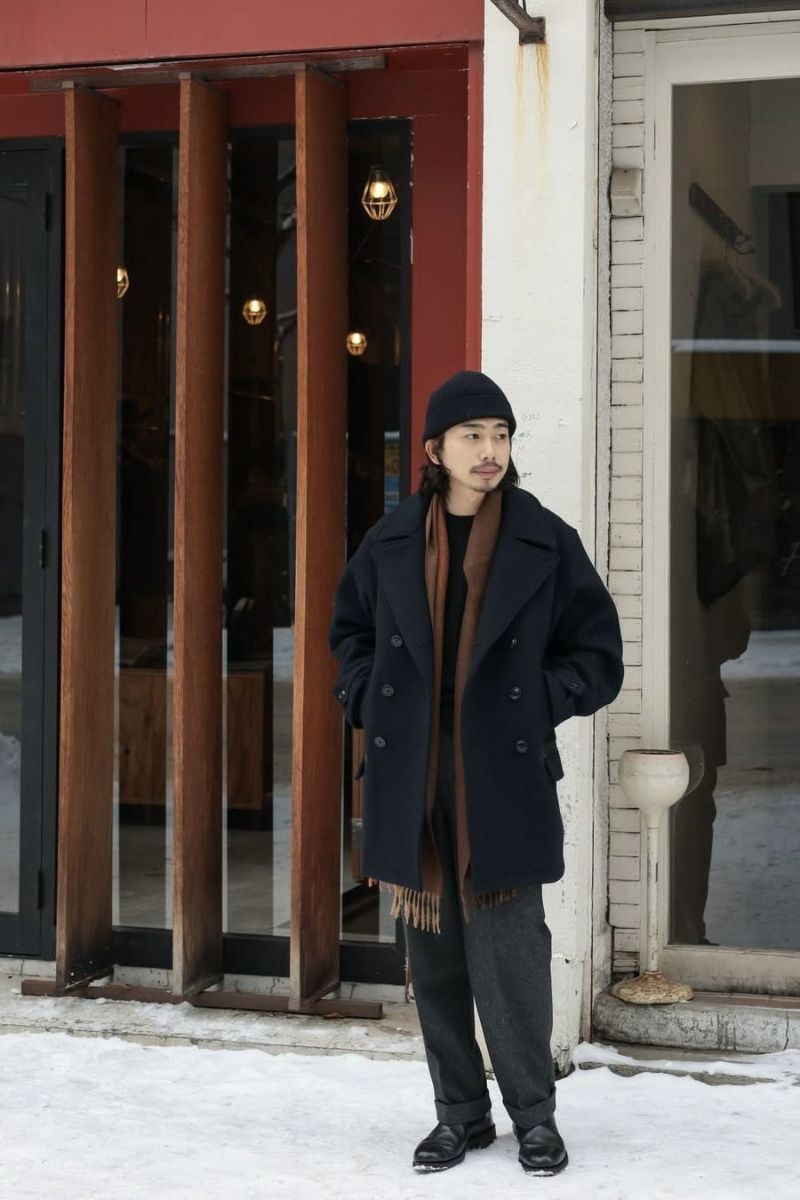 Soundman(サウンドマン) 1940年代のロイヤルネイビーダブルブレスト両前仕立てのリーファーコートがイメージソース。 腕の上げ下げが楽になるピボットスリーブに湾曲したアームがつくフォルムはモーターサイクルコートから。 その他ボタンにて調整するバックベルト、それぞれ同時代の別のコートのディティールから取り入れ、いわゆるレプリカのそれとは一線を画すオリジナルデザインとなる。表地はオイルカット加工を施しデッドストックのような風合いを持つ二重織りのウールメルトン。腰ポケットの補強にはレザー(牛皮)を使用。ボタンはナットボタン。 <素材> 表地 : Wool 90% Nylon10% 裏地 : Cotton 100% 袖裏地 : Polyester 100% <生産国> MADE IN JAPAN Soundman / Reefer PRICE ¥99,000(税込み)