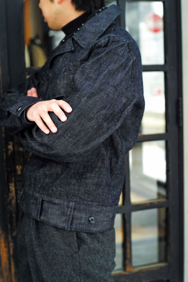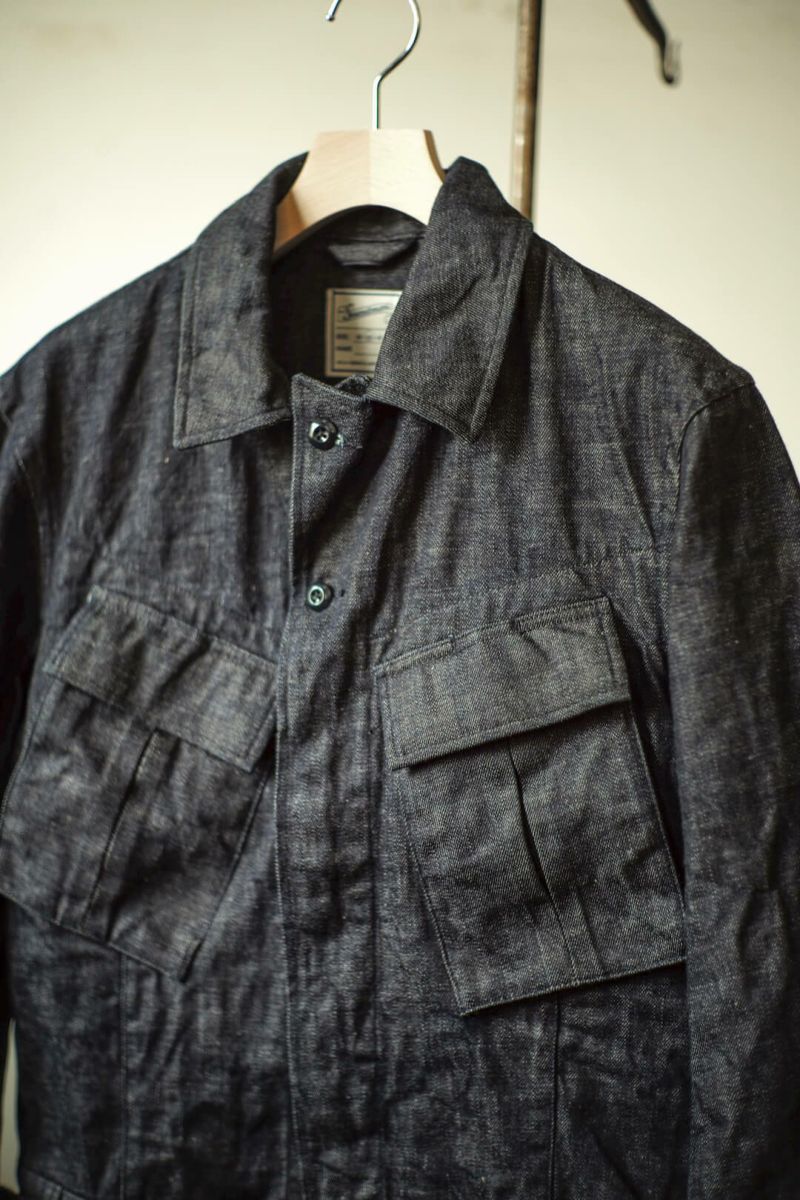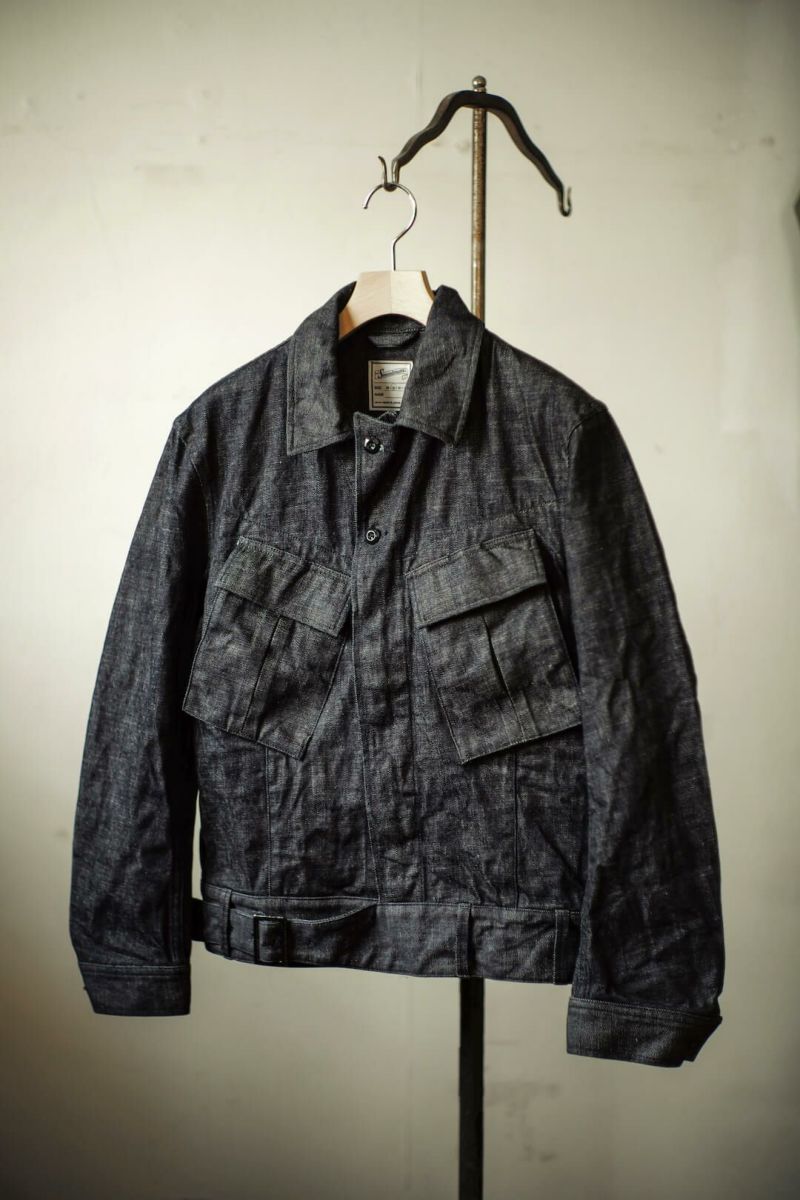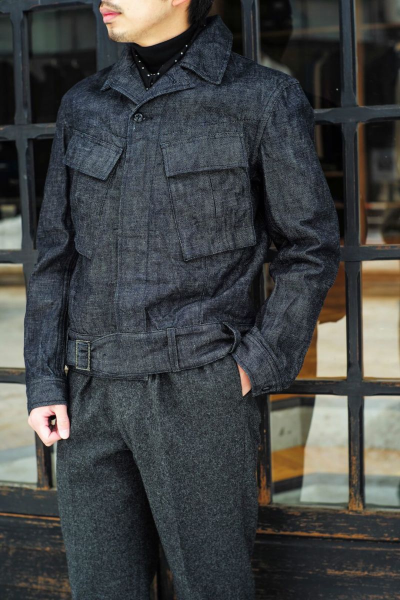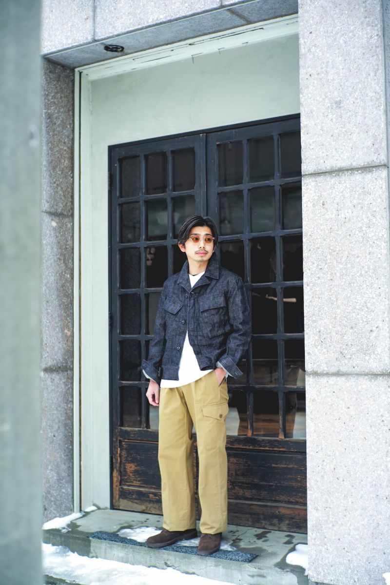 イギリス軍のバトルドレスジャケットをベースに、Soundman流に解釈して製作されたGibson ??。 ポケットディティール、使い勝手を考慮しマイナーチェンジを施したセカンドモデルです。 胸ポケットはUS ARMYのジャングルファティーグジャケットの後期型のディティールから着想を得ています。 またフロントを開けても裾のベルトが邪魔にならないよう、折り返しボタンで留める仕様になっているので、開けてきてもすっきり見えるように。 素材は茶綿糸を使用した13ozのインディゴセルビッジデニムを贅沢に使用しています。 オリジナルのヴィンテージは、グリーンデニムに対して、インディゴデニムを使用している点も、シックで惹かれる部分です。 UKミリタリーとUS ミリタリーのディテールを上手く混ぜ込んだ一枚は、Soundmanらしい一枚に仕上がっています。 COTTON 100% ※こちらの商品はブログでも詳しくご紹介しております。 https://archstyle.tv/shidendori/ Soundman / Gibson ?? Price ¥39,600 (税込)