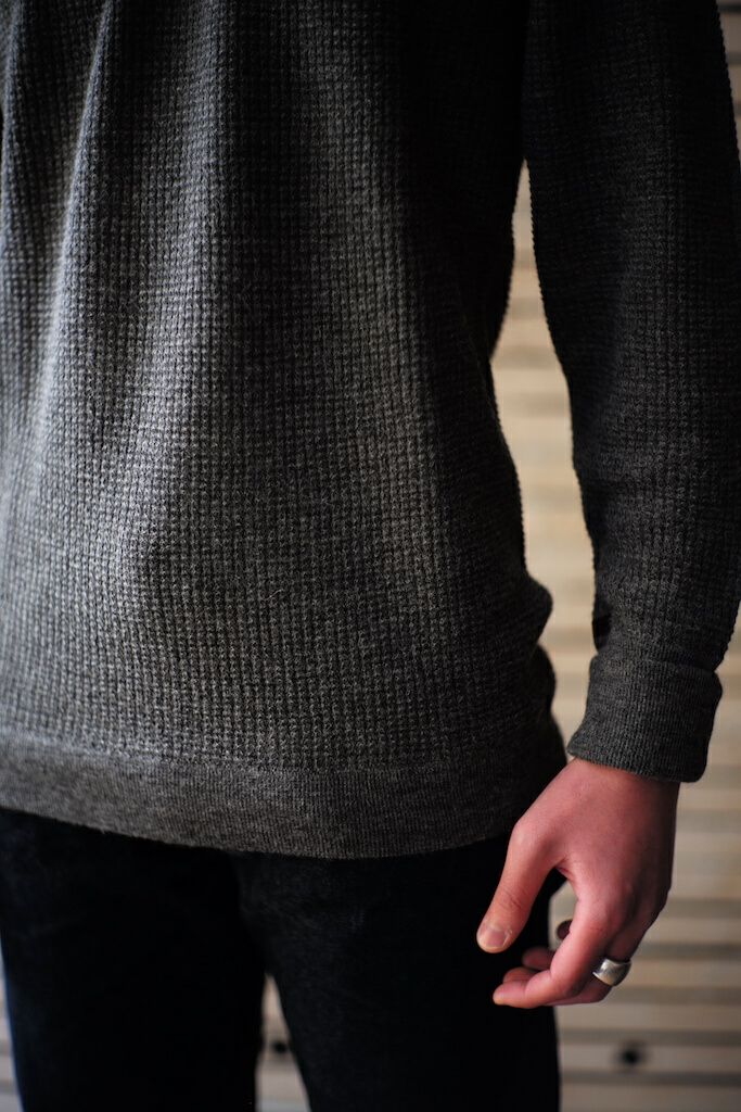 THE INOUE BROTHERS(ザ イノウエブラザーズ)のハイゲージワッフルニット。 ワッフル編みで仕立てられた程よい肉感は、ジャケットのインナーとしても最適です。 スウェット感覚でラフに着用できるのも魅力。 100% Baby Alpaca THE INOUE BROTHERS / Thin Waffle Knit Pullover Price ¥50,600(税込)