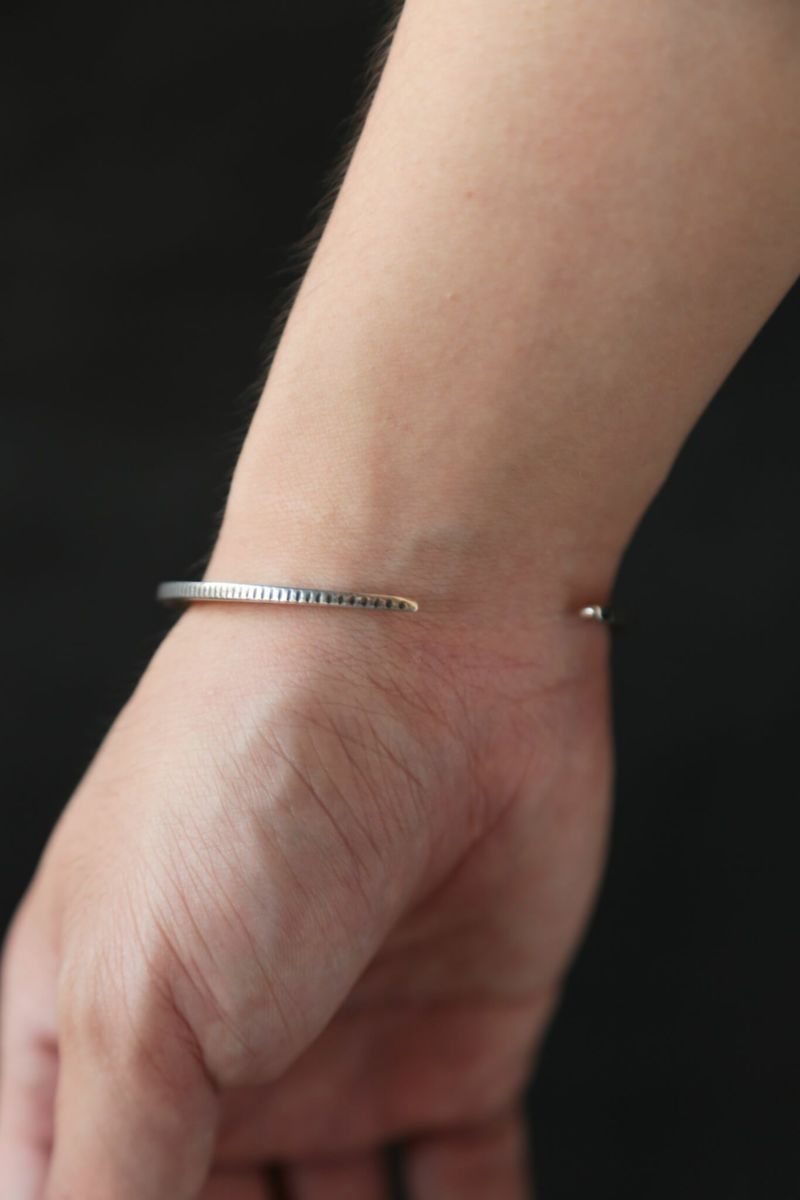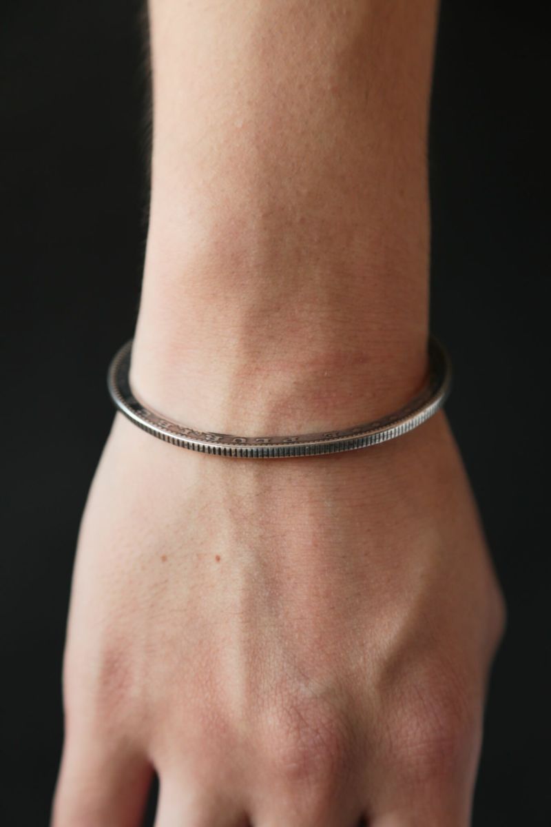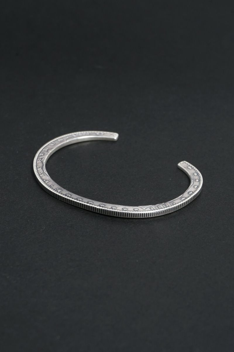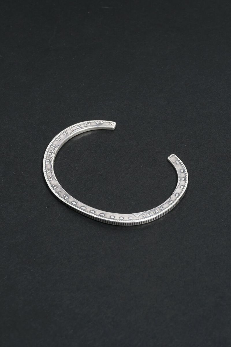 1878年~1904年の限られた年代に発行され、1921年の1年にのみ復刻したモルガンダラー硬貨を使用(シルバー900)。モルガンダラーとは限られた期間にのみ製作され、自由の女神像とアメリカの象徴であるワシをデザインした1ドル銀貨です。バングルの長さを作り出すために、1枚のコインから溶かすことなく、特殊なカットを施しコインのディテールをできるだけ損なわずに製作しています。こちらのモデルはコインの真ん中をくりぬき、バングルの長さに伸ばしています。