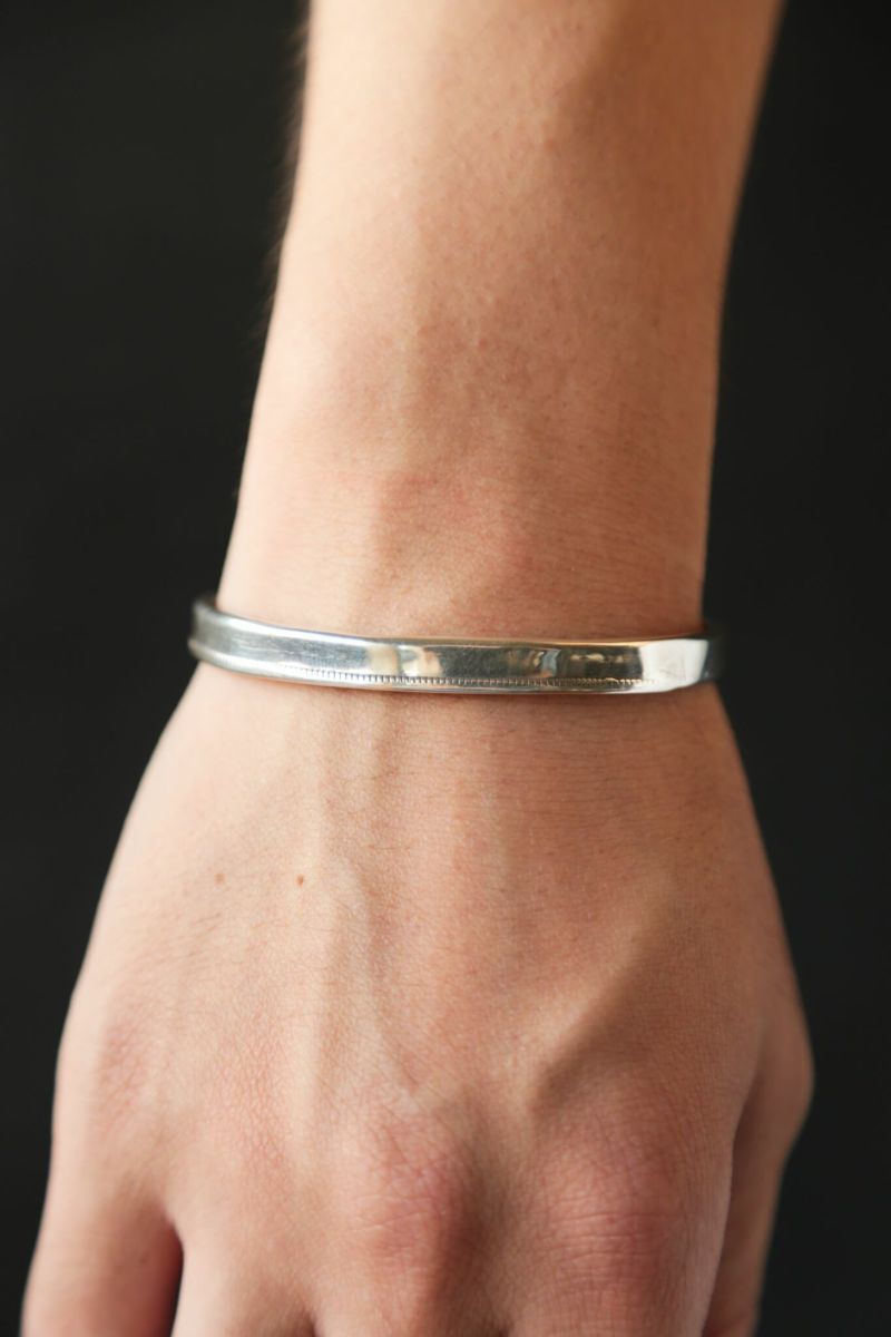 バングル長15cmを作り出すために、1枚のコインから溶かすことなく、特殊なカットを施すことでコインのディテールをできるだけ損なわずに製作。外側をポリッシュし、内側はコインの刻印を残して仕上げています。
