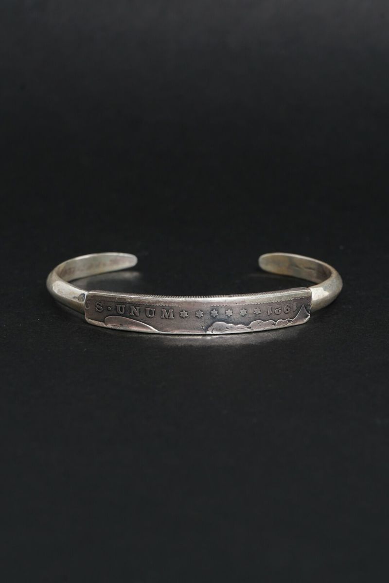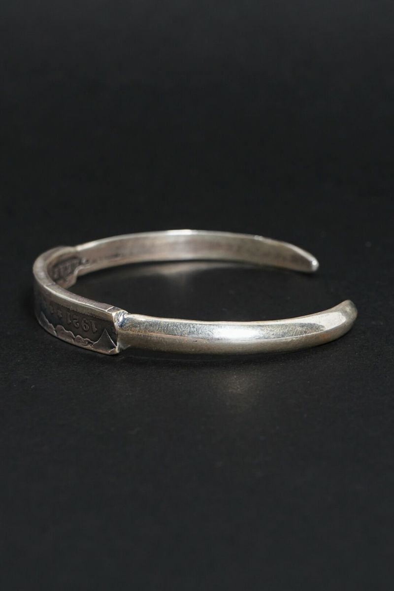 古くからあるインディアンジュエリーのフラットトップと呼ばれるシェイプから着想を得たこちらのモデルは、バングルのトップ部のみコインの刻印を残し、バングルのサイドからエンド部まではトライアングル上にポリッシュをかけています。1921年発行のコインを使用するだけでなく、このバングルのモデル自体が1921年から経過したアニバーサリーモデルとなっています。