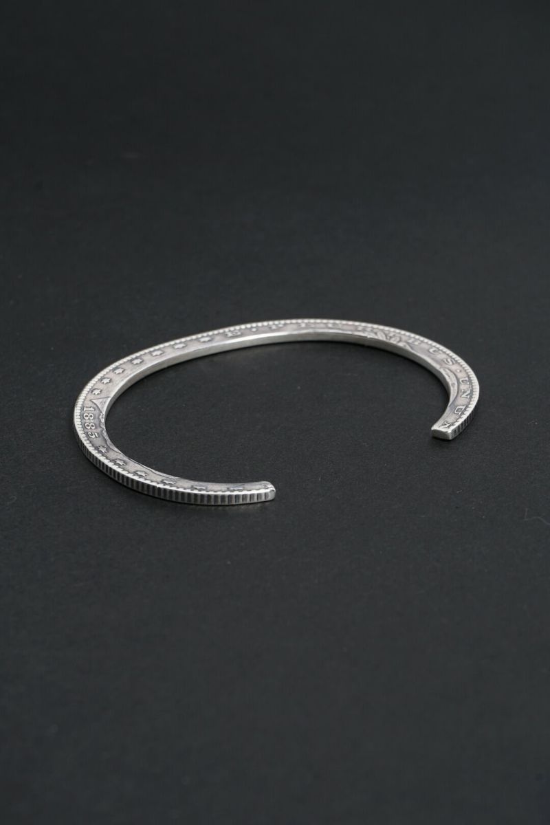 1878年~1904年の限られた年代に発行され、1921年の1年にのみ復刻したモルガンダラー硬貨を使用(シルバー900)。モルガンダラーとは限られた期間にのみ製作され、自由の女神像とアメリカの象徴であるワシをデザインした1ドル銀貨です。バングルの長さを作り出すために、1枚のコインから溶かすことなく、特殊なカットを施しコインのディテールをできるだけ損なわずに製作しています。こちらのモデルはコインの真ん中をくりぬき、バングルの長さに伸ばしています。