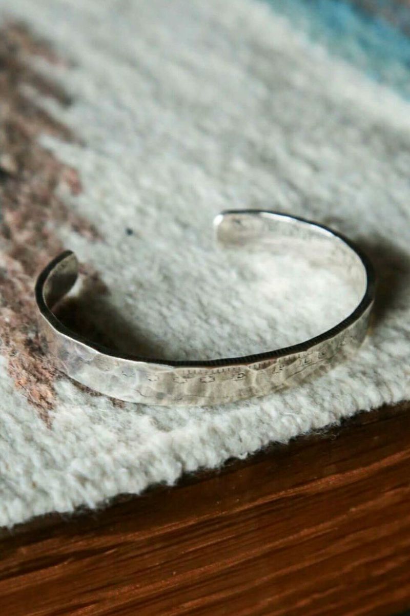 1878年~1904年の限られた年代に発行され、1921年の1年にのみ復刻したモルガンダラー硬貨を使用(シルバー900)。 モルガンダラーとは限られた期間にのみ製作され、自由の女神像とアメリカの象徴であるワシをデザインした1ドル銀貨です。 バングル長15cmを作り出すために、1枚のコインから溶かすことなく、特殊なカットを施しコインのディテールをできるだけ損なわずに製作しています。 こちらは外側のみいぶしとタタキを施した、シンプルなモデル。つけた時のコインシルバーの刻印の主張が少ないモデルです。