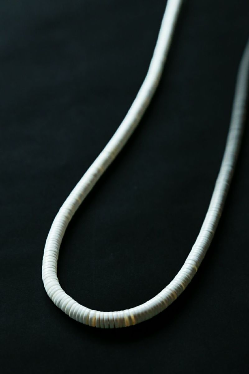 ホワイトシェルから製作されたビーズは、それぞれCalvin Lovato氏の仕事によるもの。Calvin Lovato氏は、ケワ・プエブロ(サント・ドミンゴ族)のインディアンジュエリーアーティストの巨匠で、ヒシ製作のすべての工程を手作業で行う、現地でも数少ない職人の一人です。