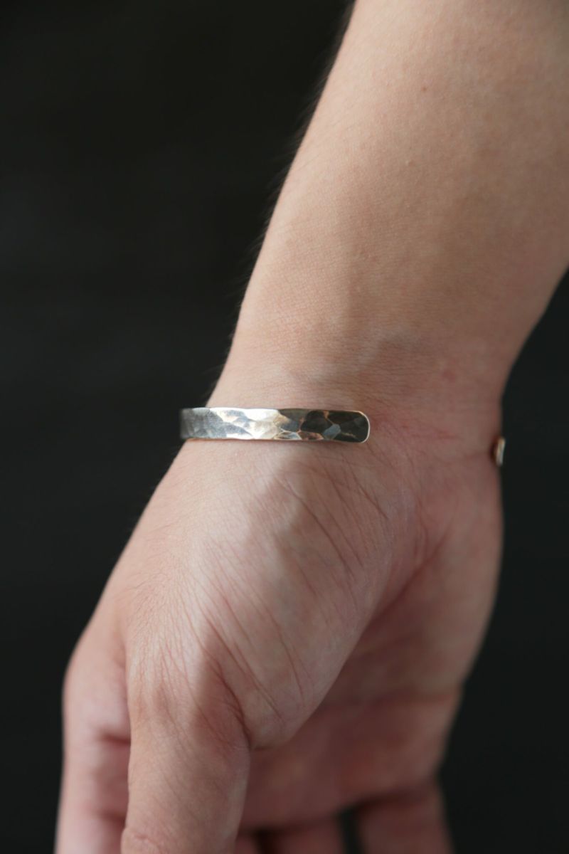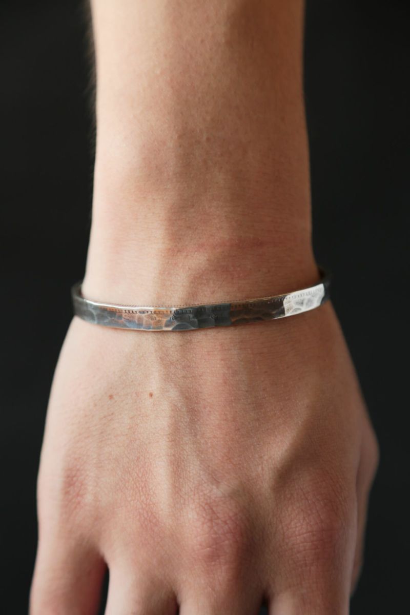 1878年~1904年の限られた年代に発行され、1921年の1年にのみ復刻したモルガンダラー硬貨を使用(シルバー900)。 モルガンダラーとは限られた期間にのみ製作され、自由の女神像とアメリカの象徴であるワシをデザインした1ドル銀貨です。 バングル長15cmを作り出すために、1枚のコインから溶かすことなく、特殊なカットを施しコインのディテールをできるだけ損なわずに製作しています。 こちらは外側のみいぶしとタタキを施した、シンプルなもの。つけた時のコインシルバーの刻印の主張が少ないモデルです。N-215よりも細いデザインになっています。
