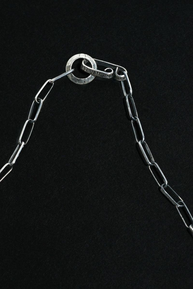 エンド部分(留め具)にもコインシルバーを使用した大変贅沢な仕様。チェーンの長さは63㎝で、何度も長さを調節しながら試行錯誤し、長過ぎず短過ぎない、一番収まりが良く”キマる”長さに設計しています。最後の仕上げに黒く「燻し」を入れ、コントラスト、色の濃淡を演出しました。チェーンの継ぎ目は全て一つずつ丁寧に火入れをしロウ付けしております。