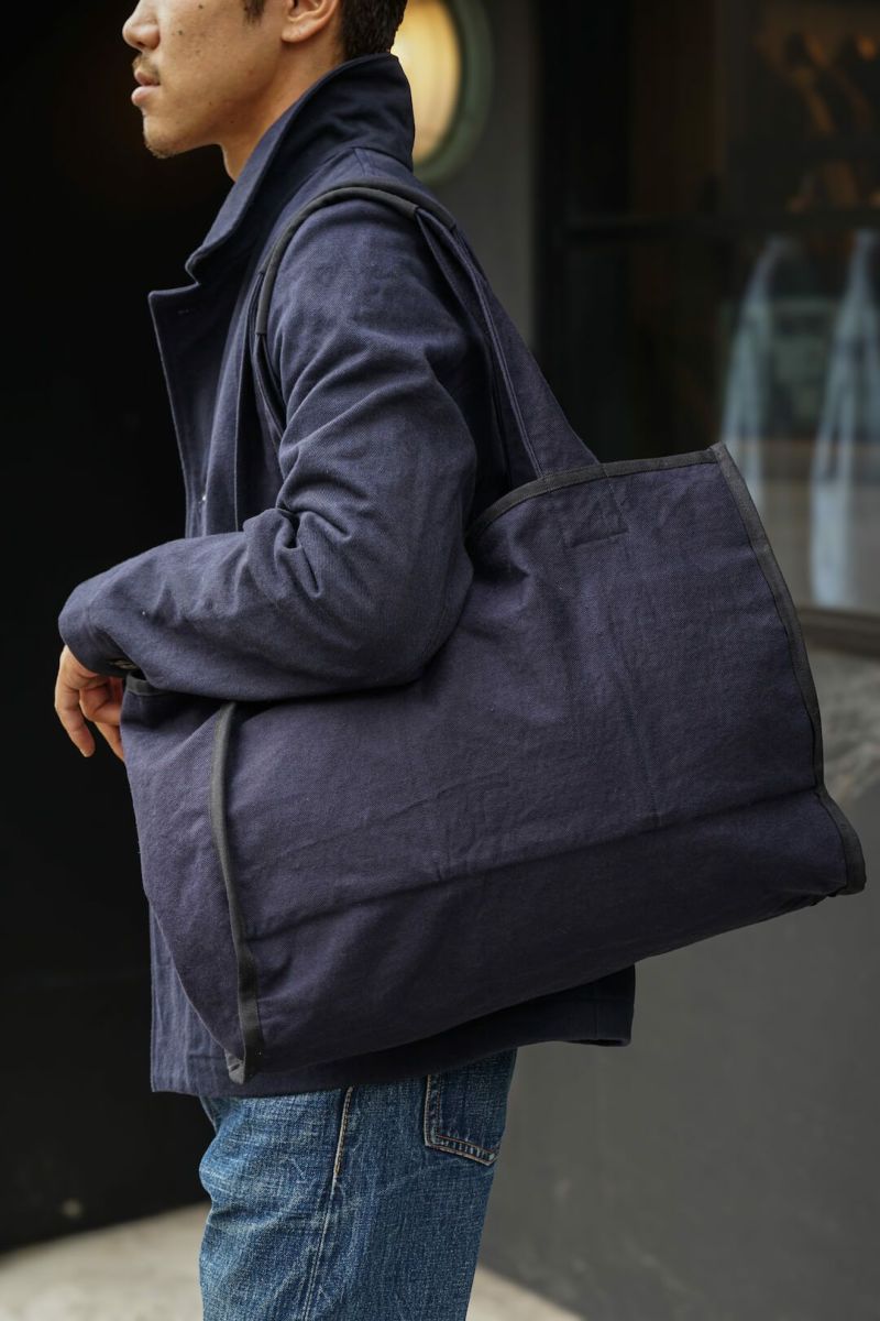 1960年代のドイツのヴィンテージワークウェアの生地を使用したトートバッグ。この生地は、溶接工、錠前屋、自動車タイヤやゴム産業で働く男性など、工業環境で働く金属工の作業服に使われていました。その地域は主に西ドイツのルール地方の工業都市で、これらの工場が立地していました。彼らは主に、ヴォルフスプルクの大手フォルクスワーゲンヴェルクや、メルセデスペンツの自動車を製造しているシュトゥットガルト近郊のダイムラーモトーレンゲゼルシャフトといった自動車産業のために働き、部品を供給していました。