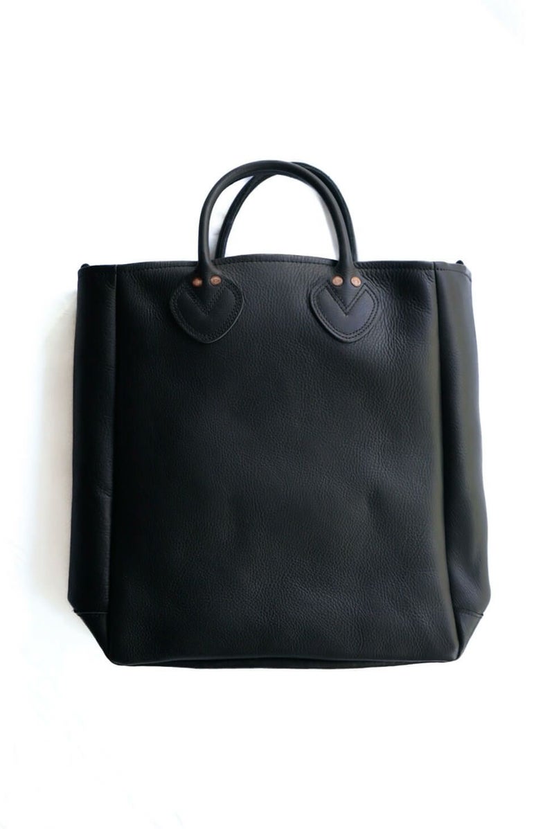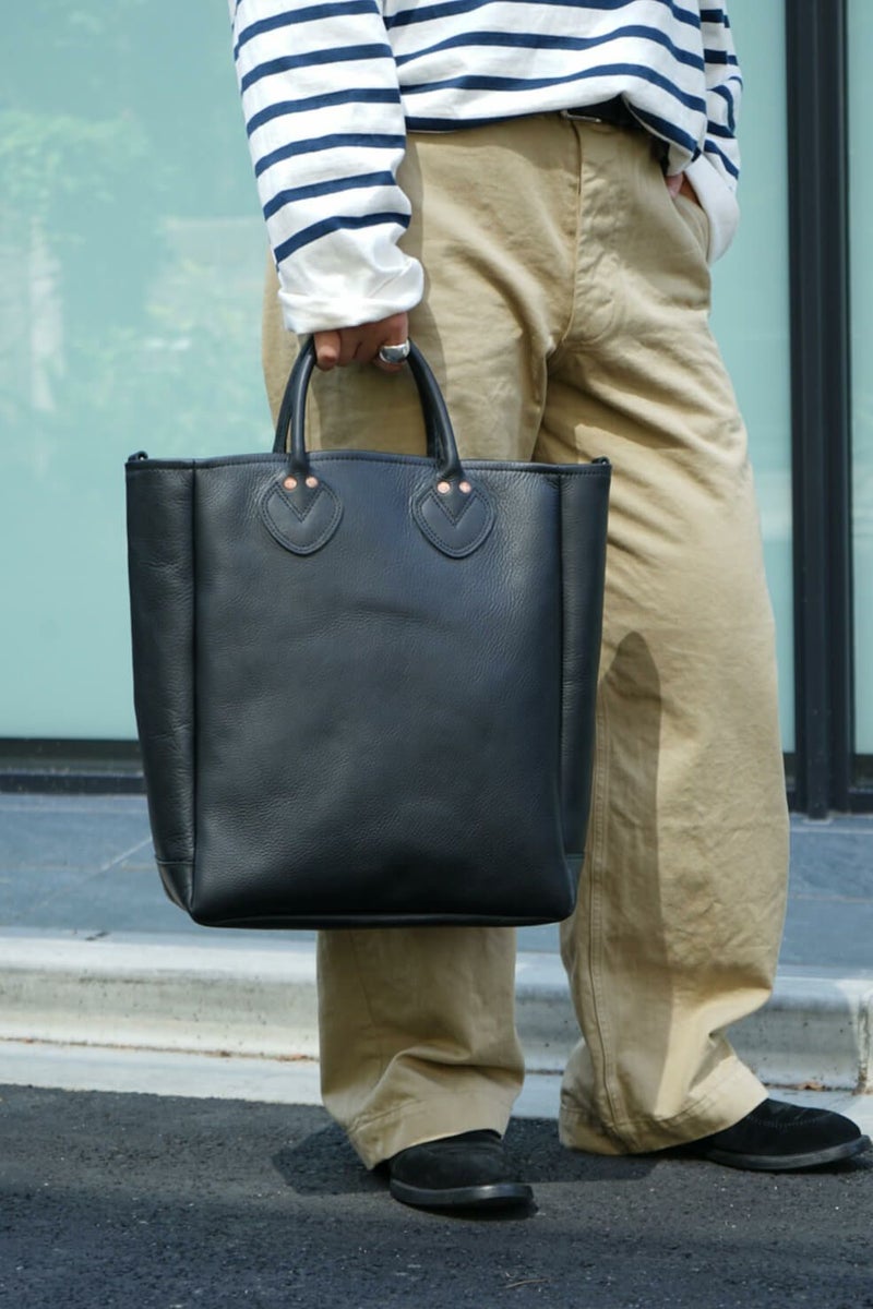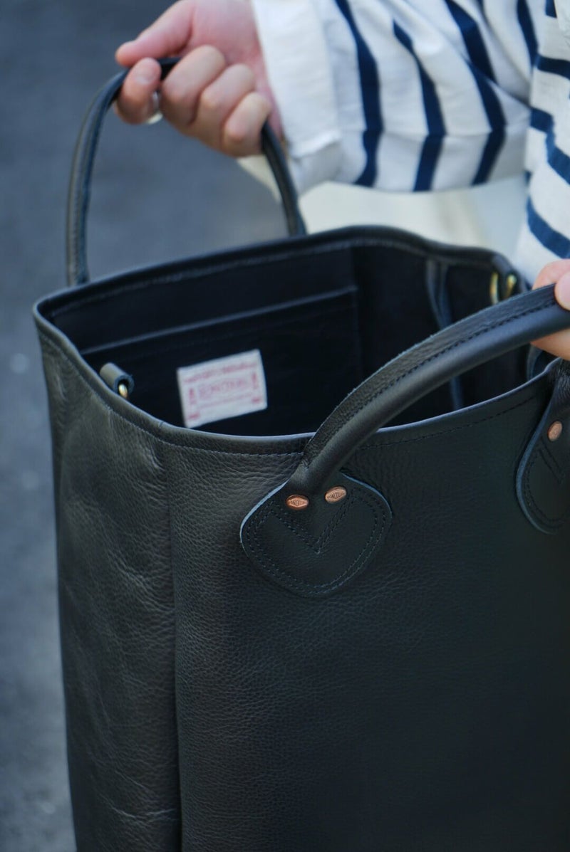 品の良いレザーのトートバッグ。牛革のスムースレザーを採用し、レザートート用に鞣しているので滑らかかつ、水にも強いので安心して使うことができます。内ポケットや鍵やキーホルダーをつけることができる真鍮のリングが付いているので小物も取り出しやすい仕様。BONCOURAのデニムに使われているオリジナルリベットが良いアクセントになっています。持ち手の芯は革芯を採用しているので、使えば使うほど手に馴染んでいくのも魅力の一つです。