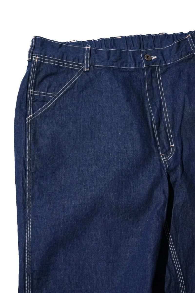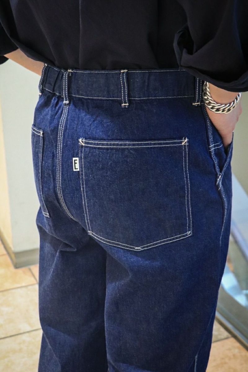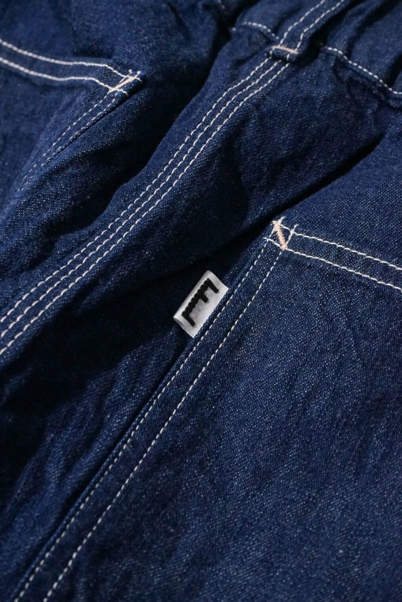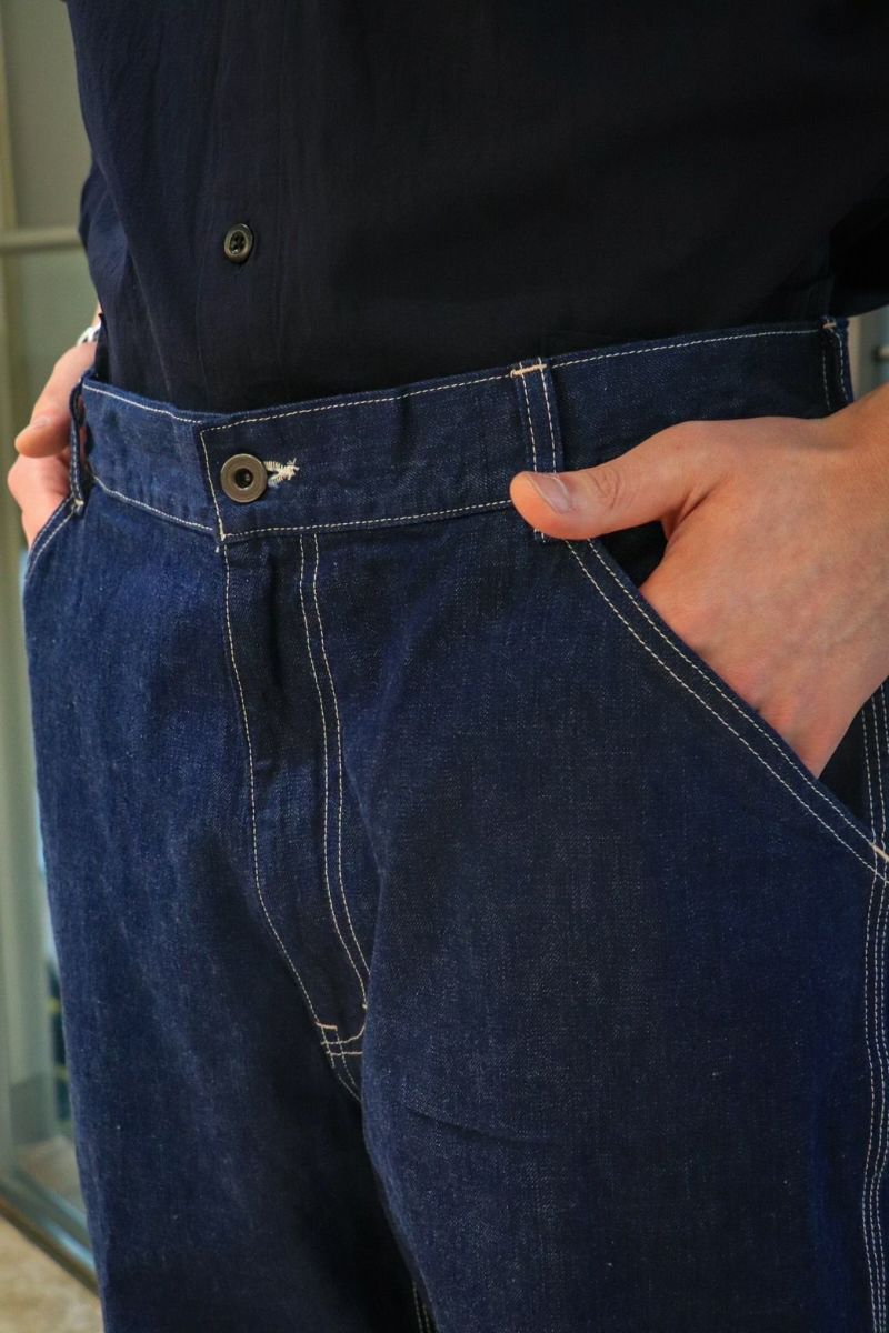 ウエストの素材は、落ち綿をリサイクルした綿と長綿とをブレンドし糸にした経糸を使用。生地はジェルトデニムをイメージしたワーキングを感じさせる10ozデニム。純度と鮮度のいい青さを表現するために、一度きりで生産するインディゴで染色しています。
