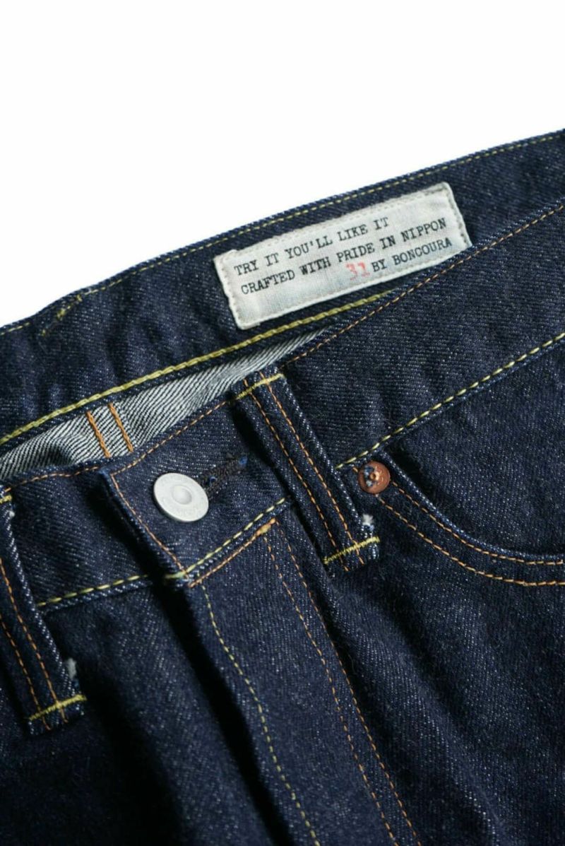 原綿の産地や配合、撚糸等紡績の部分からこだわり、ピュアインディゴで限界まで濃色に染色。旧式のBONCOURA特別仕様力織機によ織り上げられたBONCOURAオリジナルデニム生地を使用しています。ステッチはオール綿糸縫製によるもの。XXは太めのストレートシルエットで武骨な雰囲気。Vステッチや隠しリベット、打ち抜きリベットなどヴィンテージを彷彿とさせるディテールにもこだわりました。