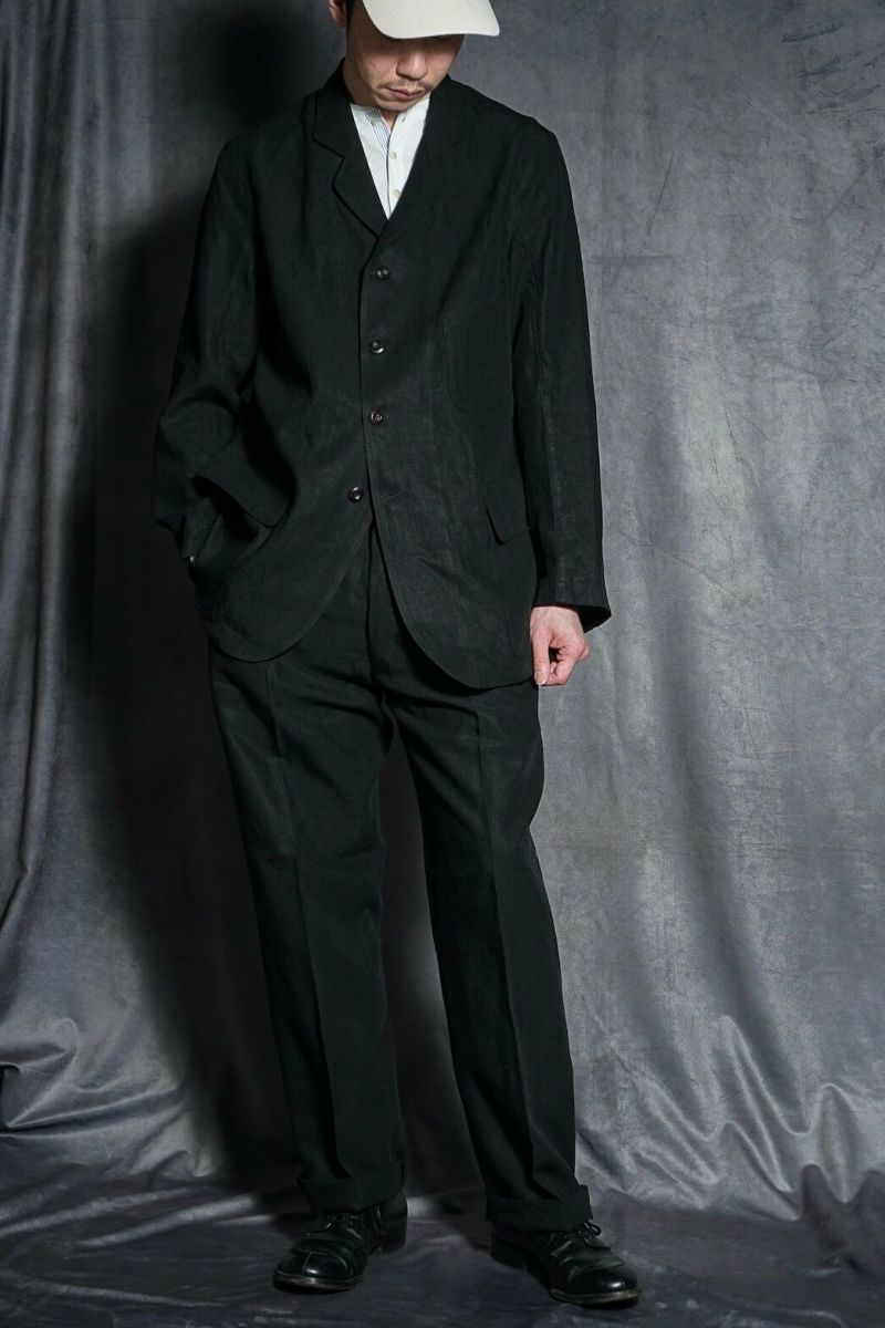 素材は、強いハリ感を持つ高密度リネン生地を採用。リネン生地は生産数が激減しており、こちらも今後の再生産が無い貴重な生地です。ボタンは、パリの倉庫で発掘した1950年代のデッドストックウッドボタンを使用。