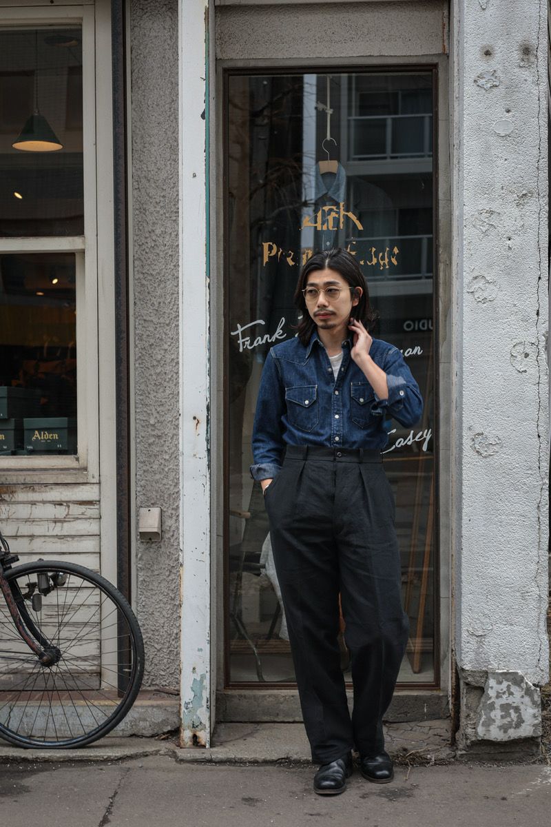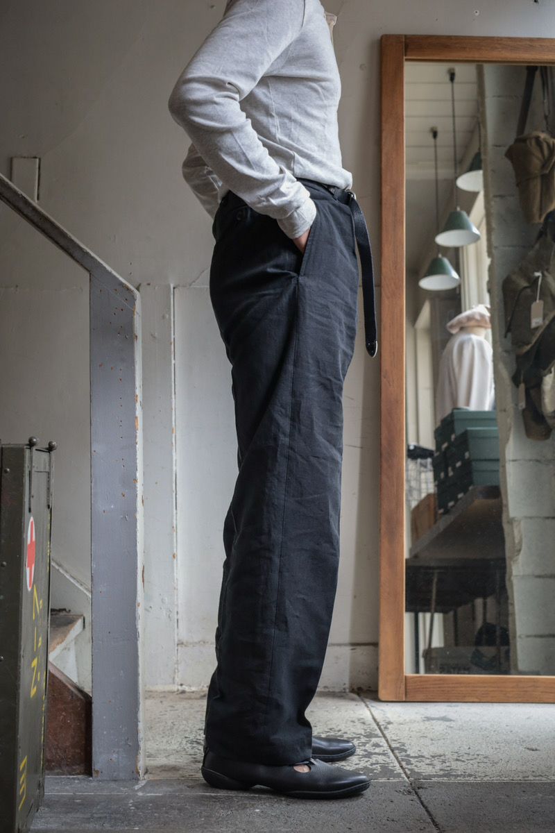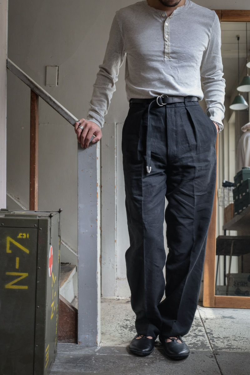 1915年にフランス軍へ支給されていたミリタリートラウザーズのフィット感、ディテールを参考に製作したトラウザーズ。ゆとりのあるフィット感でありながら、ハリ感のある生地と相まって綺麗なシルエットを描く一本です。