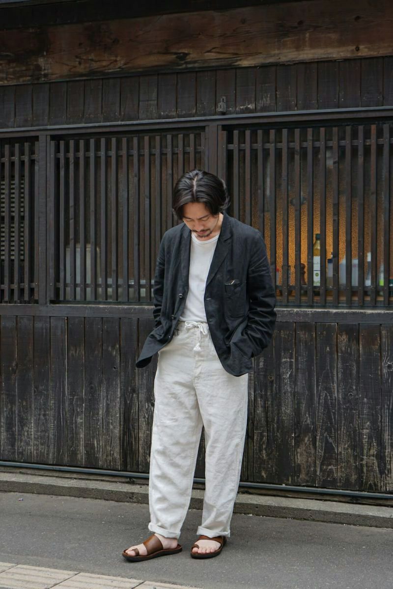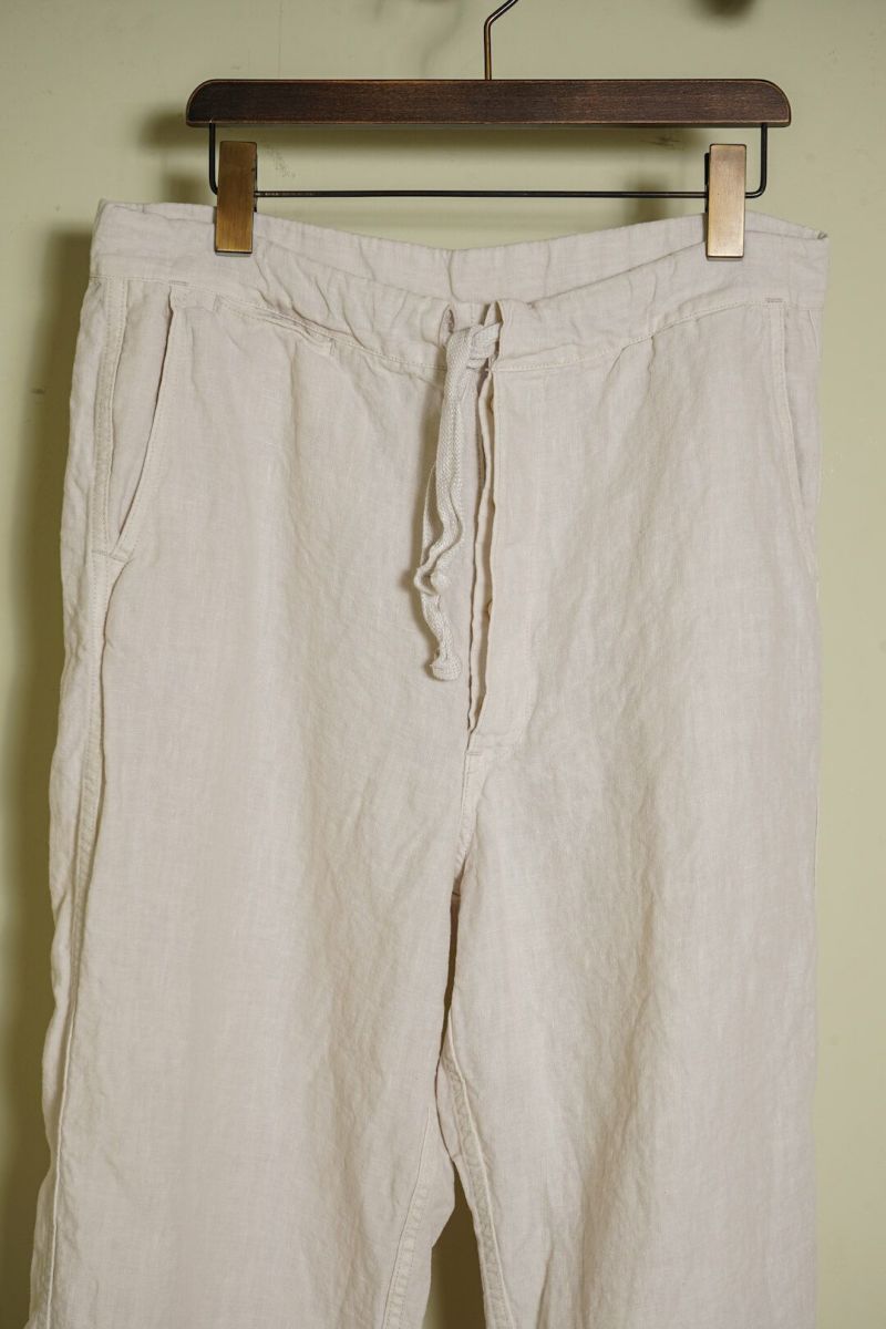 長い年月を経て変化したリネン生地の色合い、風合いを忠実に再現することに着目した「Discoloration = 変色」シリーズのイージーワークパンツ。